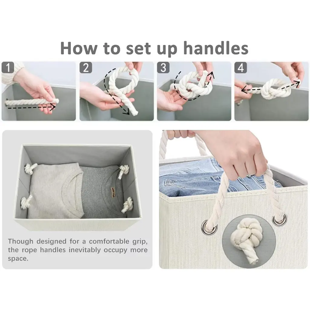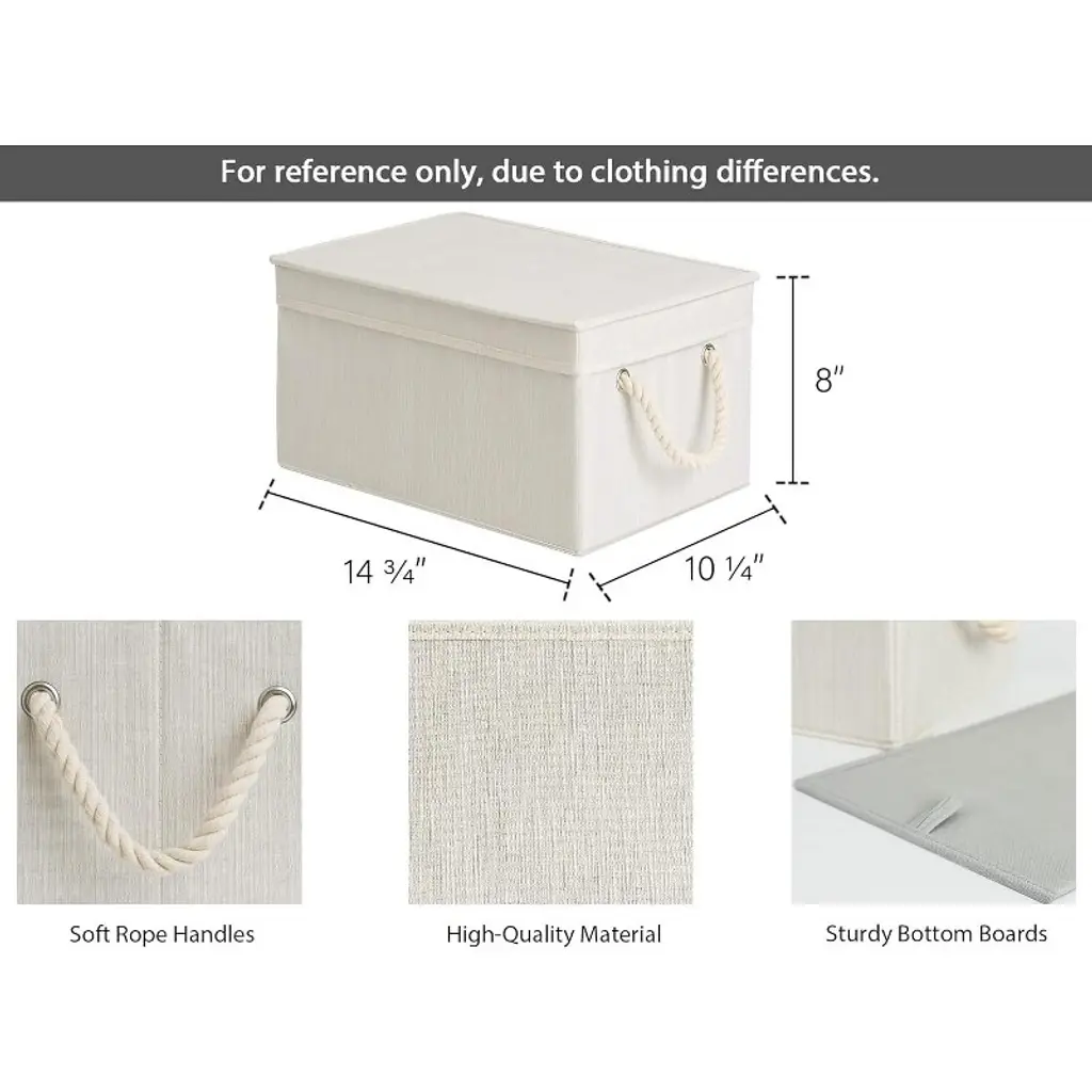 Natural Fiber The storage basket with 2 soft rope handles can support a weight of up to 30 pounds. Thick fabric storage boxes with lids reinforced with heavy-duty boards. Closet organizer for T-shirts, Jeans, towels, blankets, books, DVDs, office & crafts supplies, etc. Storage baskets are perfect to use as underbed storage containers, makeup organizers, or medicine chests.