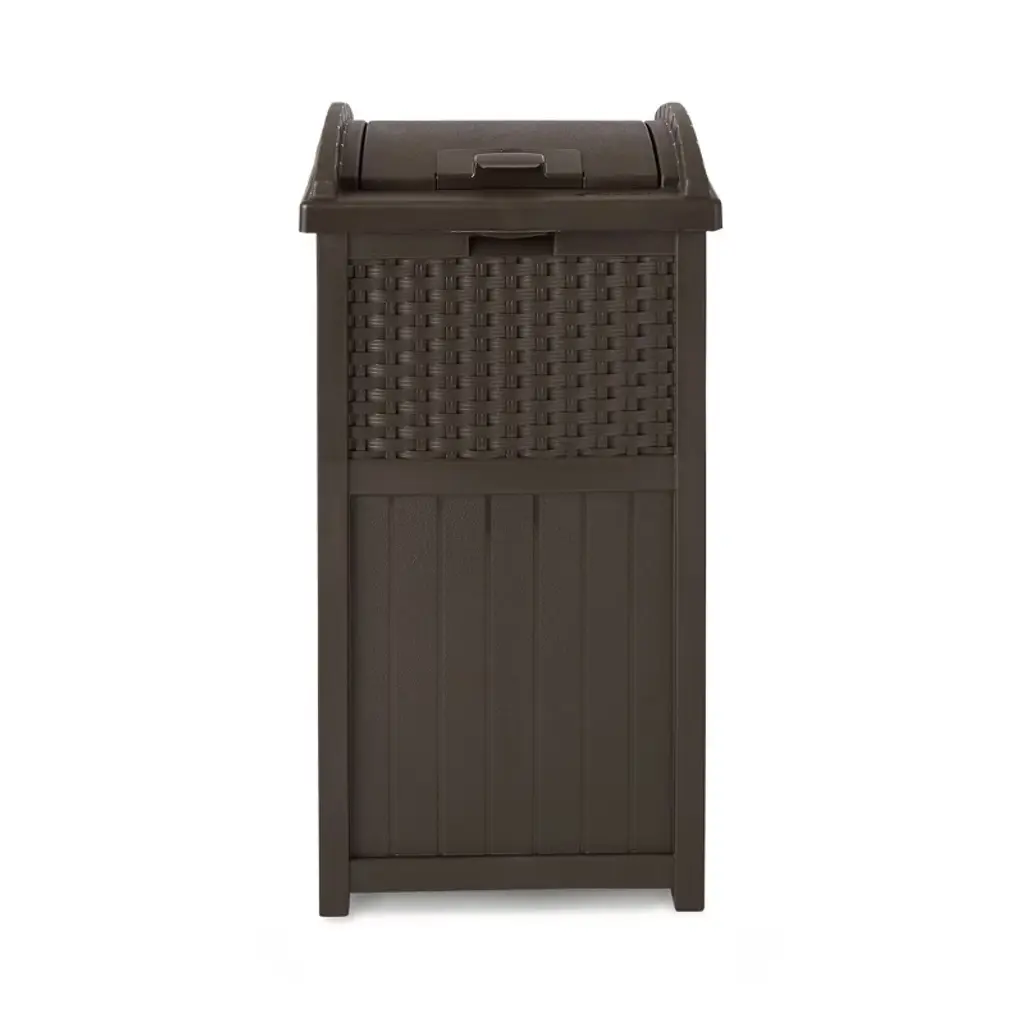 This Suncast outdoor trash hideaway has a stylish design that looks great on most patios or decks. The wicker design compliments most any patio furniture or home decor. This Suncast outdoor trash hideaway unit includes a latching lid and has a solid bottom panel, which keeps garbage from spilling out all over the patio or deck. Standard 30-33 gallon garbage bags fit perfectly inside this Suncast trash hideaway, so it's perfect for poolside areas, patios, and decks that get lots of use.