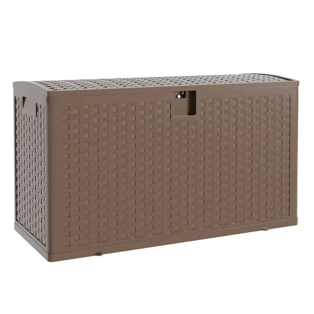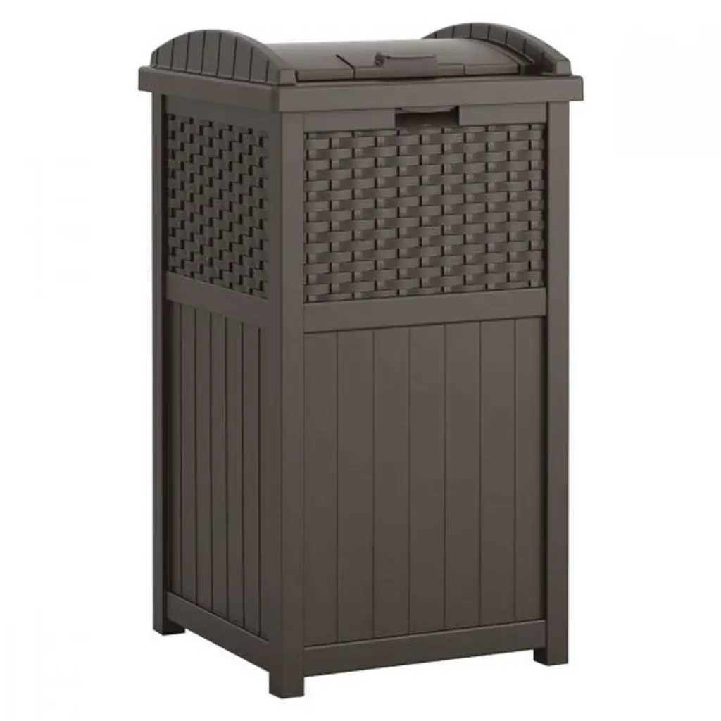 This Suncast outdoor trash hideaway & the Suncast 99 Gallon Patio Resin Pool Box has a stylish design that looks great on most patios or decks. The wicker design compliments most any patio furniture or home décor. This Suncast outdoor trash hideaway unit includes a latching lid and has a solid bottom panel, which keeps garbage from spilling out all over the patio or deck. Standard 30-33 gallon garbage bags fit perfectly inside this Suncast trash hideaway, so it's perfect for poolside areas, patios, and decks that get lots of use. Store your gardening tools, athletic equipment and outdoor dining décor in style with this Suncast Wicker Deck Box. The Suncast 99 gallon patio deck box is ideal for storing patio accessories. Its durable construction is matched with contemporary design to bring style and harmony to any outdoor seating. Its mocha java color will be sure to complement most any pool, deck, patio, or wherever storage needs to happen. This 99 Gallon Suncast Wicker Box is great for most patios, decks and pools and perfect when having festive occasions since this deck box is great for concealing items that do not need to be out during a get together.