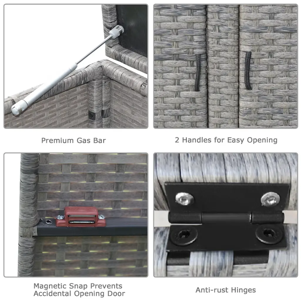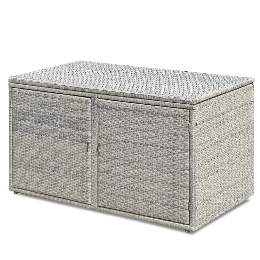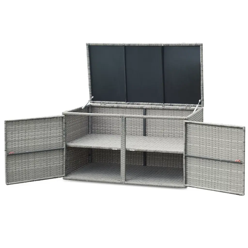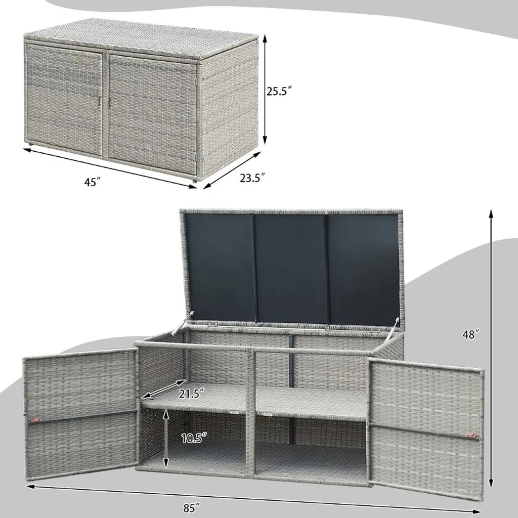 Our outdoor storage box is a multi-functional storage box, it can be used as a big storage box and a spacious chair. It is made of sturdy steel, PE wicker and weather-proof, which can withstand moderate weather. The container of this box is 88 gallon. It will help you to organize your cushions, garden tools or other outdoor belongings. In addition, it is easy to store or take things because the box can be opened at top or front. Do not hesitate to buy it!FeaturesSturdy Frame with Premium Rattan: Made of heavy duty steel, the frame of the storage box is sturdy enough to provide ultimate durability. High quality PE rattan can withstand moderate outdoor space.Large Capacity with Shelf: The internal capacity of the storage box is about 88 gallons which will provide additional storage space for your various items such as toys, grill supplies, tools, and gardening items.Flip Cover & Two Doors: Our rattan storage box can be opened in multiple directions for convenient storing or taking. The flip cover on the top is supported by two premium gas bars for easy opening and closing.Versatile Storage Box: With concise and modern appearance, it is not only a storage box which can store different things but also it is a great décor to match your other furniture.Easy to Clean & Assemble: This wicker storage box is easy to clean. According to the detailed instruction, the storage box can be installed easily.Specifications Material: rattan + steel Color: grey Dimension of Closing Box: 45"x 23.5"x 25.5"(W x D x H) Dimension of Fully Open Chair: 85"x 23.5"x 48"(W x D x H) Height of Shelf: 10.5" Weight of Box: 36.5 lbs Load Capacity of Shelf: 110 lbs Package Include: 1 x Storage Box, 1 x Instruction