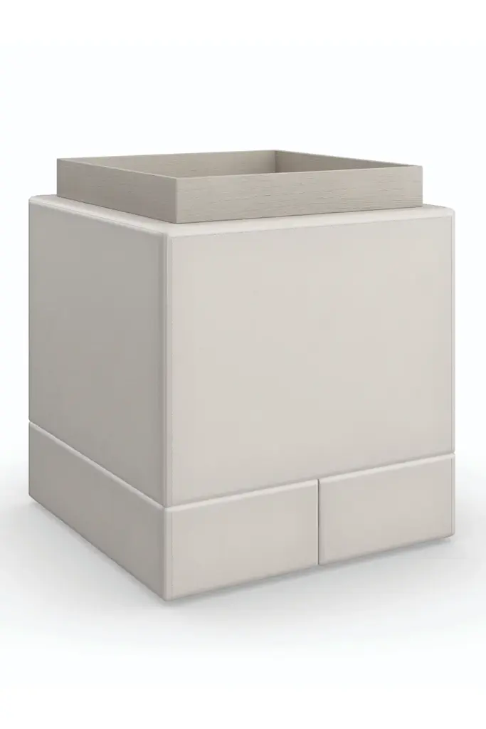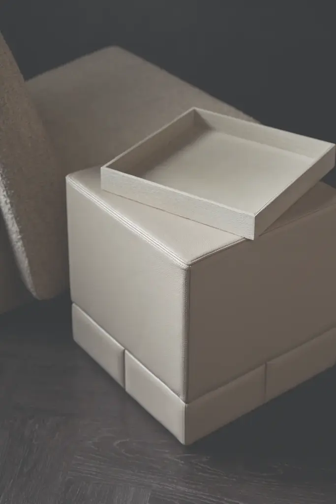 Double stitch details and gently rounded edges elevate the simplicity of the Bindi side table, crafted from stacked blocks in luxurious taupe leather. Comes with its own elegant oak tray in a neutral Fossil finish for added function and an organic finishing touch.Download Assembly Sheet