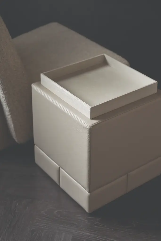 Double stitch details and gently rounded edges elevate the simplicity of the Bindi side table, crafted from stacked blocks in luxurious taupe leather. Comes with its own elegant oak tray in a neutral Fossil finish for added function and an organic finishing touch.