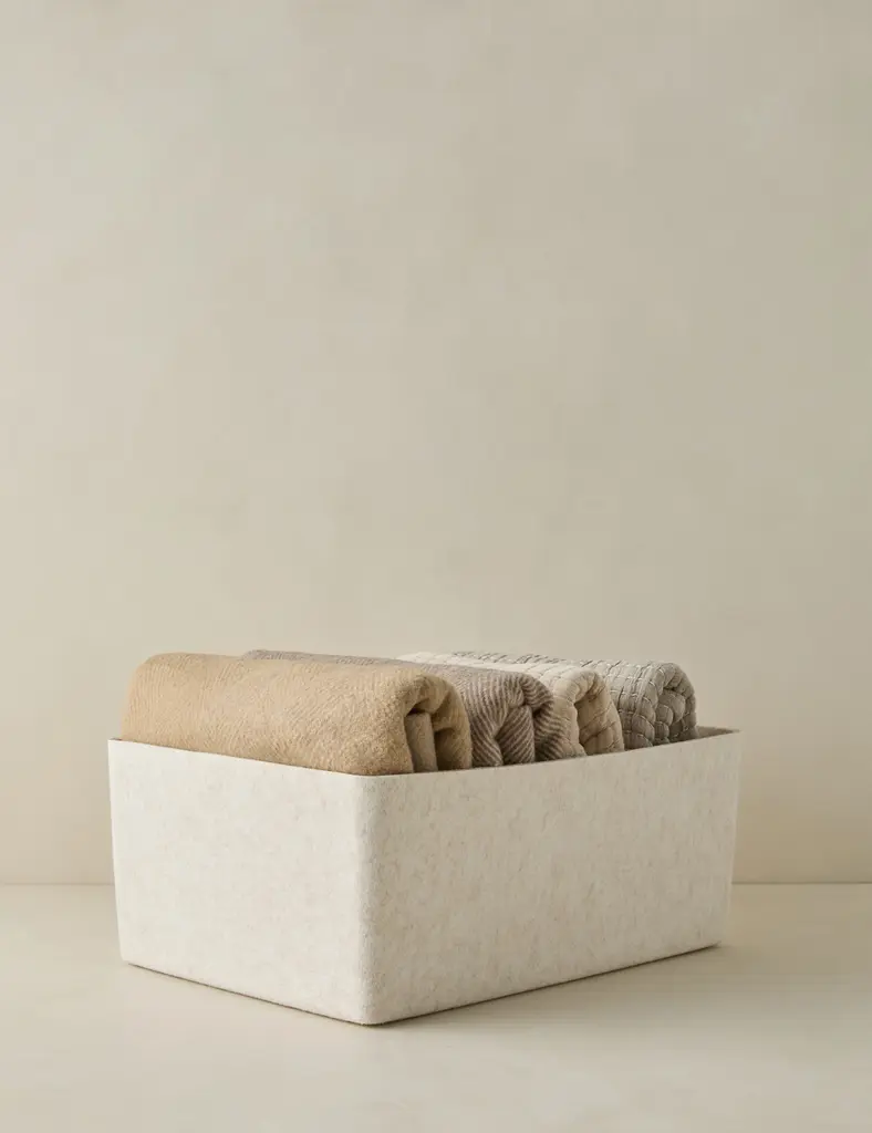 The sculpted bin offers a simple, clean look with a sturdy felt construction. This versatile bin fits any space, while its solid fabric form is ideal for bulky items like books or shoes or storing clothes and linens. Includes three bins with lids for stacking and stashing.