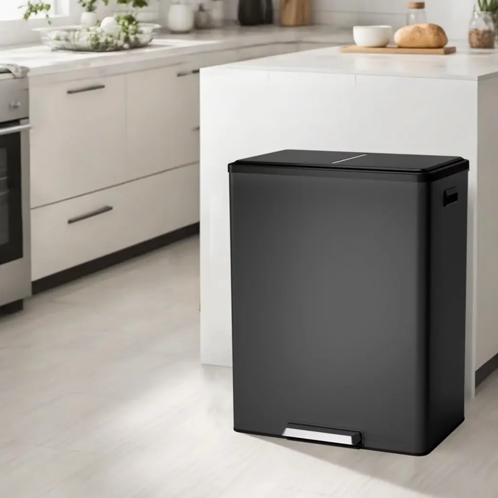 Upgrade your waste management with our 5.2-gallon stainless steel trash can, perfect for small spaces. Its modern design seamlessly fits into any kitchen decor. Enjoy stability with non-slip pads, a quiet lid closure, and the convenience of a practical inner bucket for easy cleaning and bag replacement. This trash can also offers easy mobility with a back handle and comes with 15 liner bags for immediate use. Simplify your waste disposal with this compact, chic, and functional addition to your home.