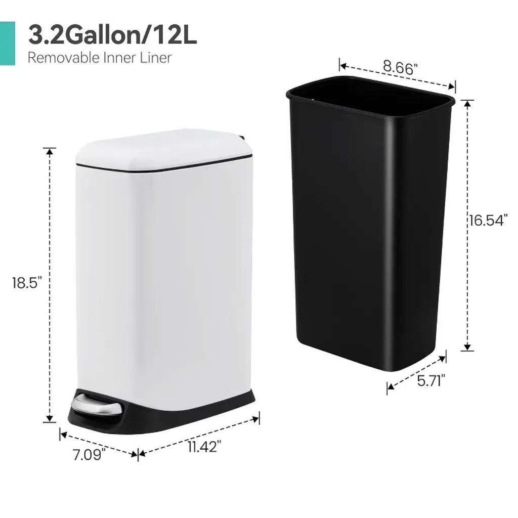 Trash Can, Stainless Steel Kitchen Trash Can 3.2 Gallon With Soft Close Lid & Foot Pedal
