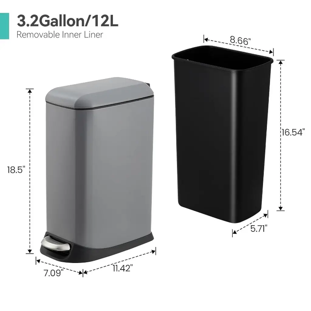 Trash Can, Stainless Steel Kitchen Trash Can 3.2 Gallon With Soft Close Lid & Foot Pedal