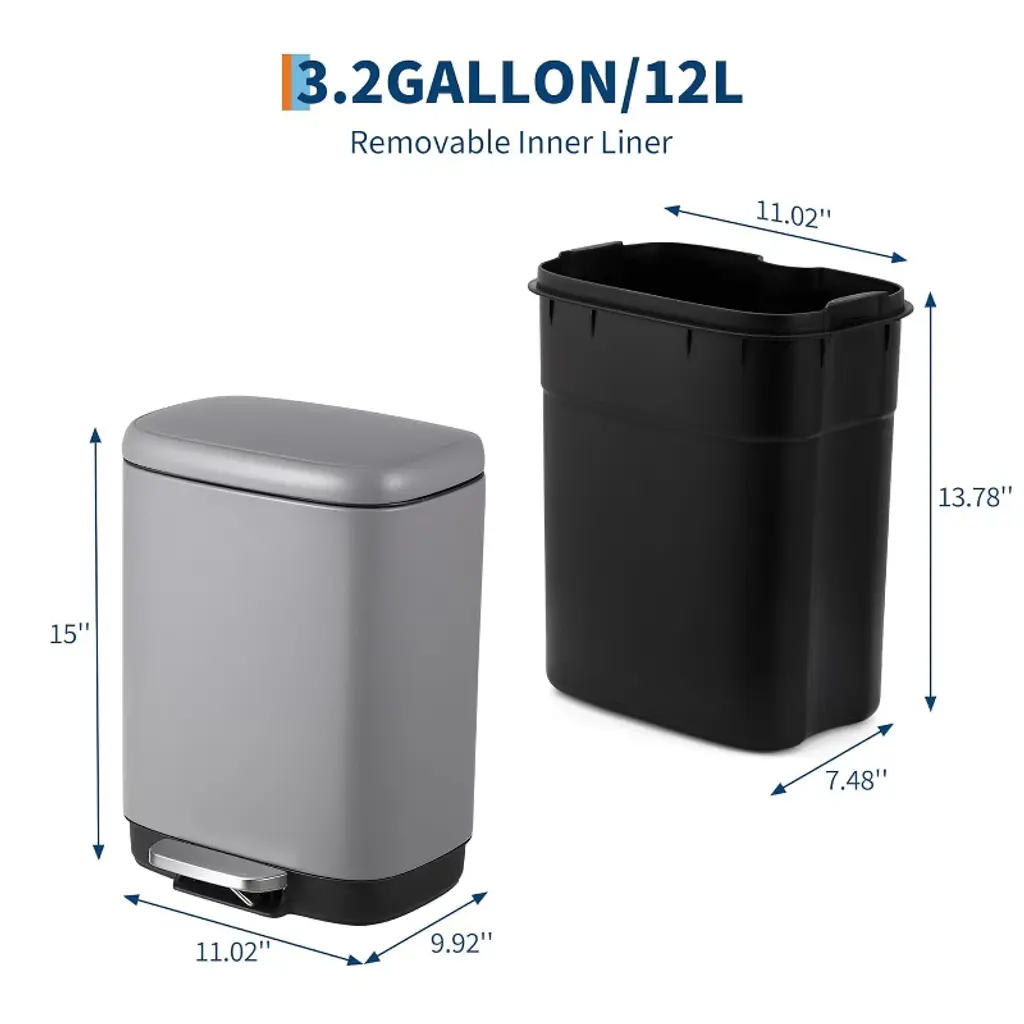 Trash Can with Lid, 3.2 Gal/12L Stainless Steel Bathroom Trash Bin with Soft Close Step-On Pedal & Removable Basket, Rectangular Smudge Resistant Rubbish Bins Kitchen Waste Basket