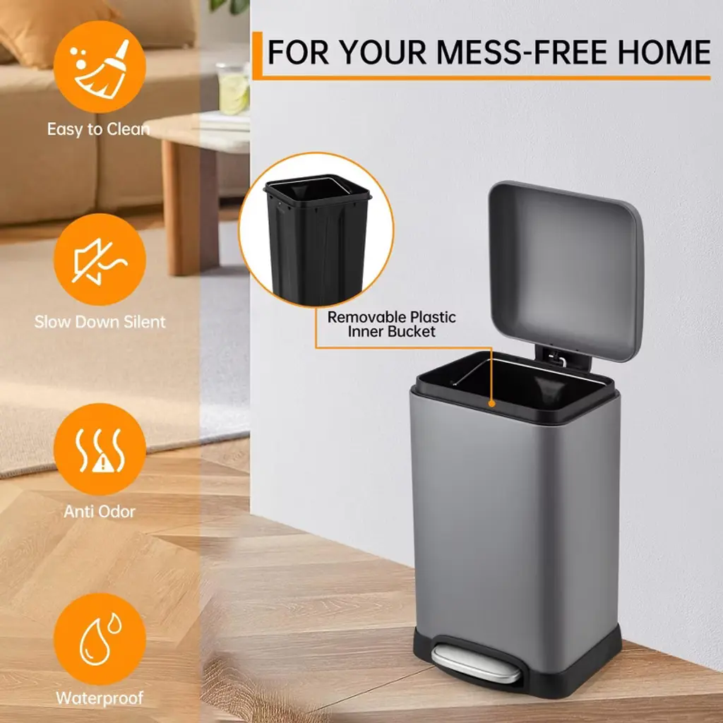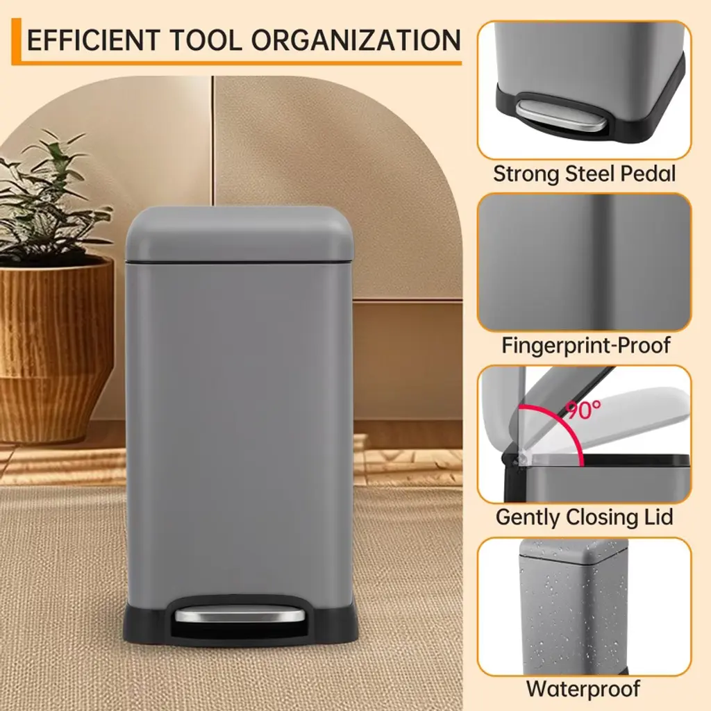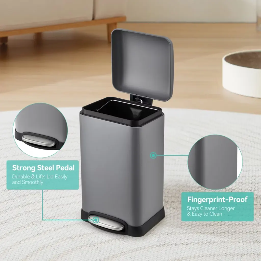 Stainless Steel Trash Can, M7 12L Capacity, 30x24x44cm, Durable Kitchen Bathroom Bin, Anti-Stain Hand Design Garbage Can, Black
