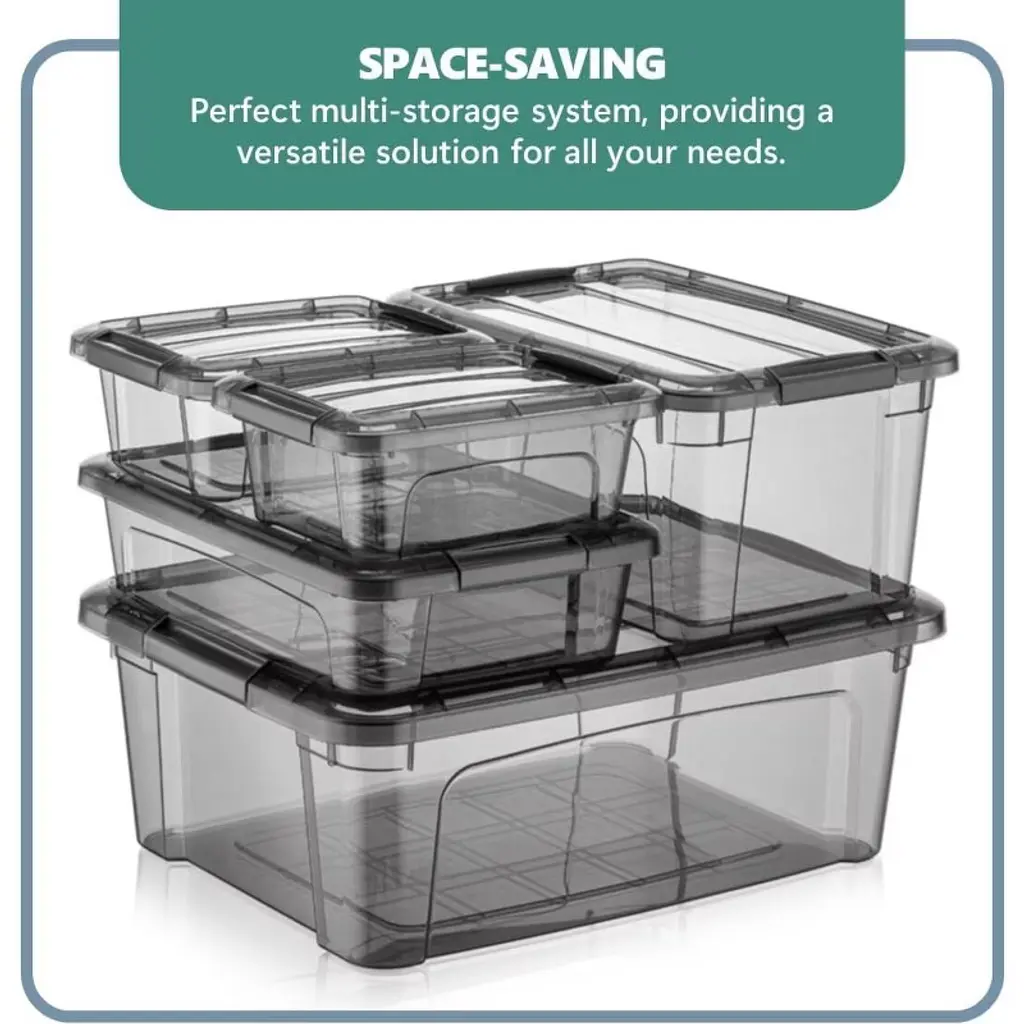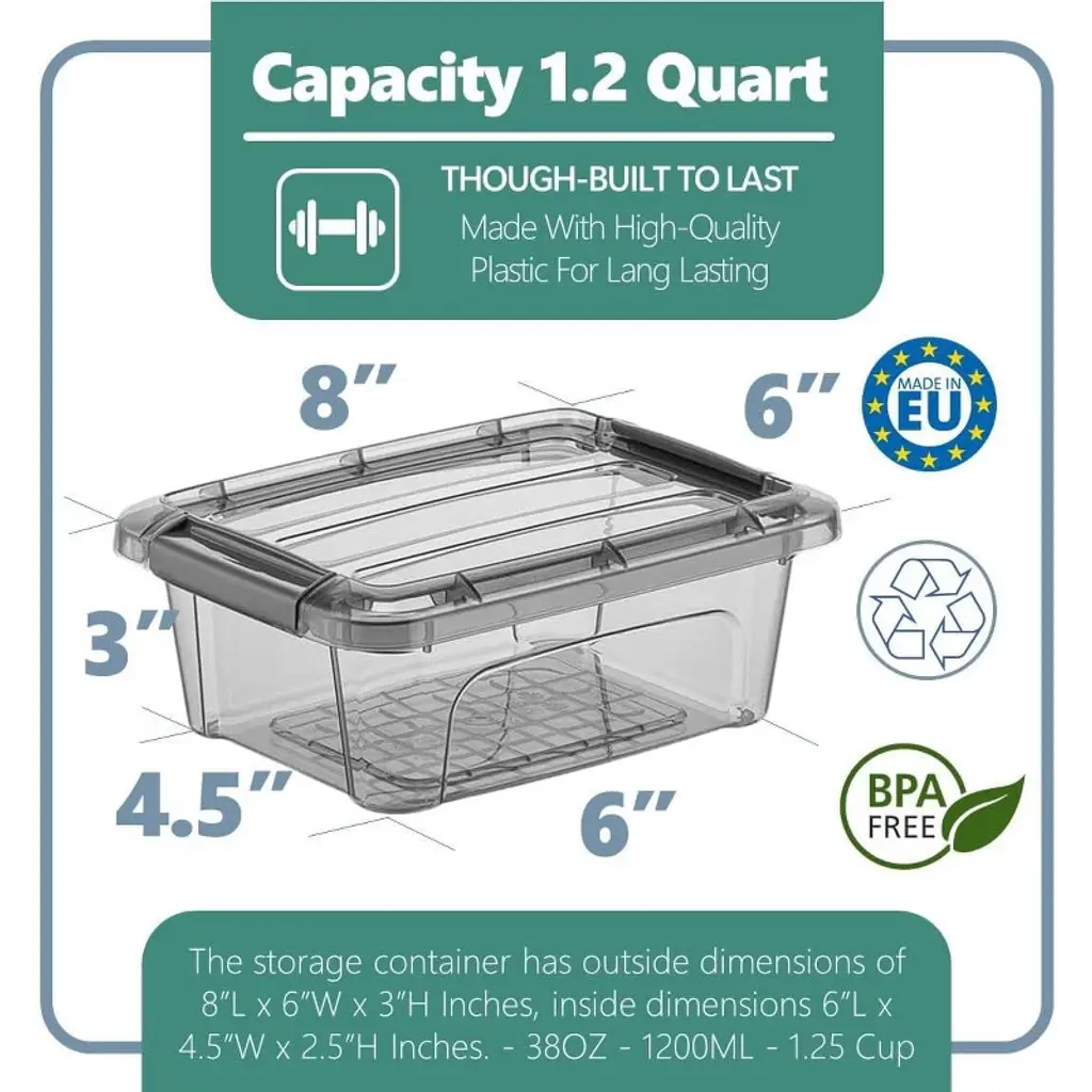 These small plastic storage containers with lids, measuring 8” x 6” x 3” (38oz/1200ml/1.25 cups), are designed to maximize space organization in both home and office. Ideal for storing paper clips, tacks, arts and craft supplies, or small workshop items like nails and screws, these bins feature tinted plastic for easy content identification and a touch of modern elegance. The sturdy latches keep lids firmly in place, protecting contents from dust, while the high-quality plastic construction ensures durability. The bins stack securely for a stable and organized storage solution.