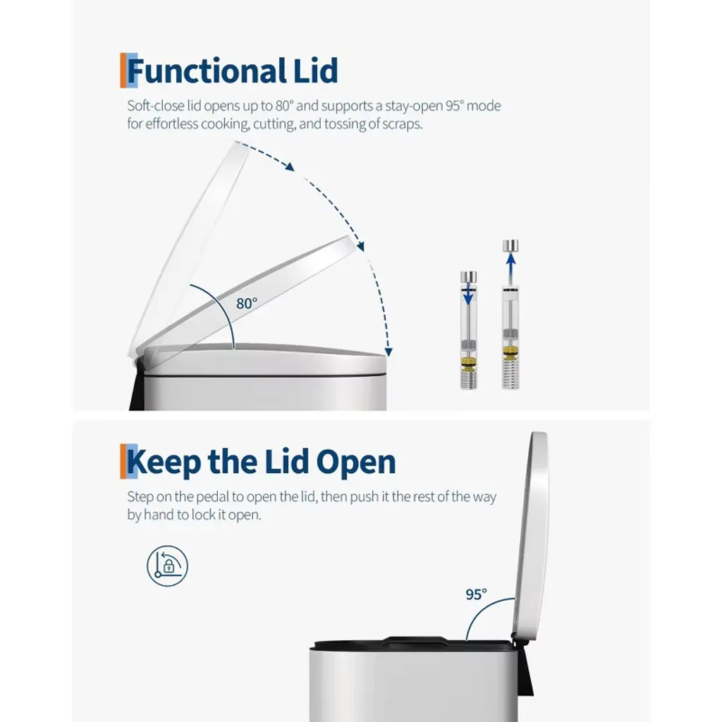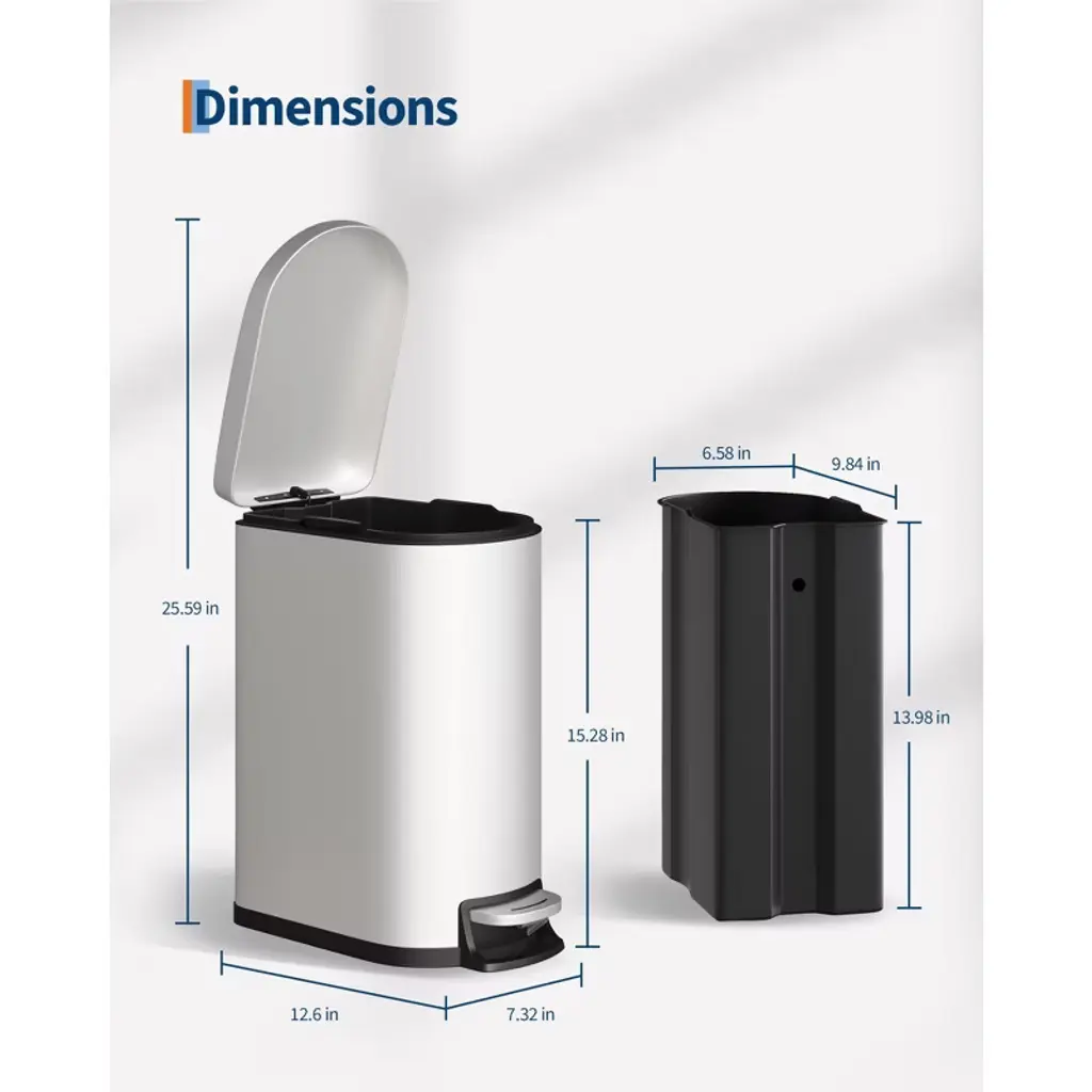 Step Trash Can & Bathroom Bin ¨C TROPOW 2.6 Gallon White Metal Garbage Can with Soft-Close Lid & Inner Bucket"(Note: "Step Trash Can" and "Bathroom Bin" are confirmed high-volume Amazon search terms.)Product Features:2.6 Gallon Slim DesignCompact footprint (12.6"L¡Á7.32"W¡Á15.28"H) fits narrow spaces; holds 6¡Á16.9oz bottles or 15¡Á12oz cans.Premium Powder-Coated Metal ConstructionStainless steel shell with white finish + polypropylene inner bucket (rustproof/odor-resistant).Step-On & Soft-Close LidBrushed steel pedal (150,000+ cycles) with ABS lid (300,000+ cycles); opens to 95¡ã for hands-free use.Smart Functional DetailsAnti-slip feet, rear handle, liner ring for bag security, and fingerprint-resistant finish.Multi-Room VersatilityIdeal for bathrooms, bedrooms, or offices (includes 1-year warranty).Specifications:Brand: TROPOWColor: WhiteMaterial: Powder-coated stainless steel + polypropyleneSpecial Features: Odor seal, quiet close, removable bucketDimensions: 12.6"L ¡Á 7.32"W ¡Á 15.28"H