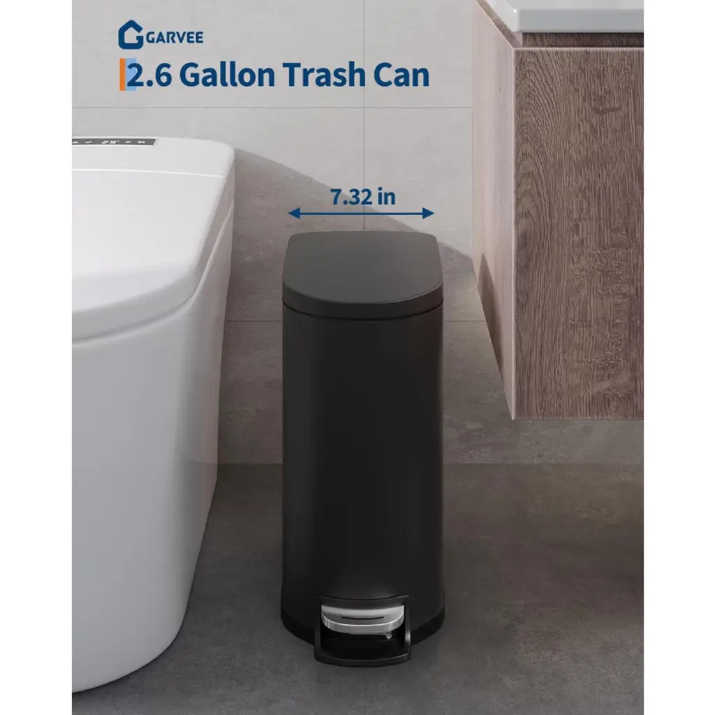 Tropow 2.6 Gallon (10l) Slim Metal Trash Can ̈C Black Step-on Bathroom/bedroom Garbage Bin With Soft-close Lid & Inner Bucket
