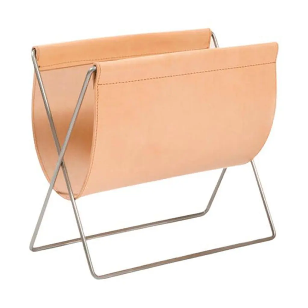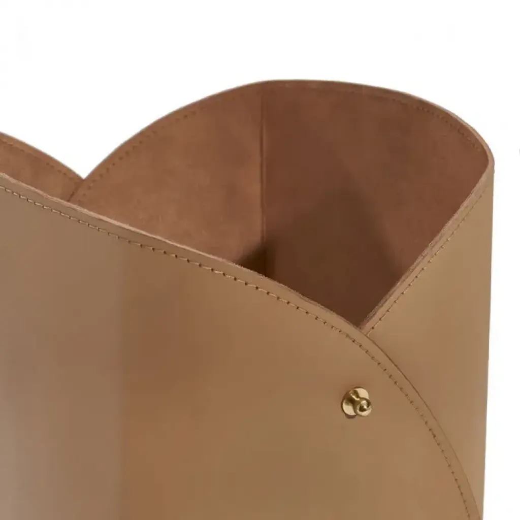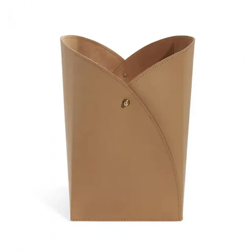 Turning a desk-side staple into the chicest statement, the Tulip Wastebasket is crafted of fawn leather with metal details in a polished brass finish. Genuine leather is a natural material. Variations in coloration and pattern are to be expected and add to the uniqueness and charm of each piece.