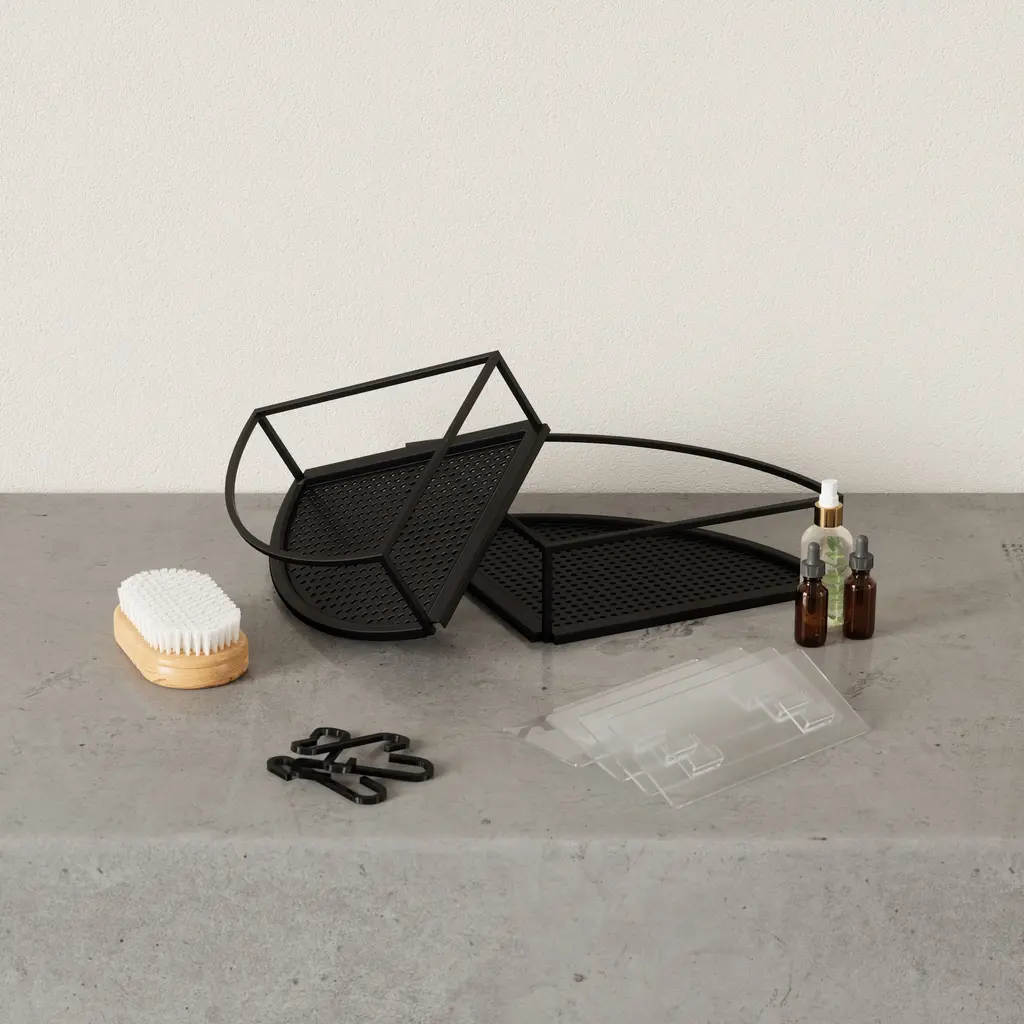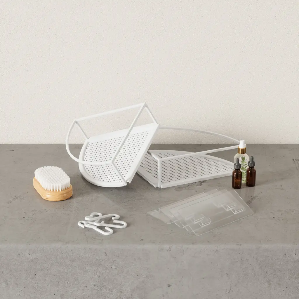 Add elevated storage to your bath or shower space with Cubiko Corner Bins .These non-damaging shower storage caddies have a modern, bent wire design, making them easy to integrate with a variety of decor styles. Easy to install, Cubiko includes non-damaging, waterproof adhesive strips that can be applied on various surfaces such as tiles, dry wall, concrete, etc. (does not work on porous surfaces). Each bin holds 10lbs (4.5 kg) and is made of rust-free metal. Includes two metal hooks to hold loofahs, small towels, and more.