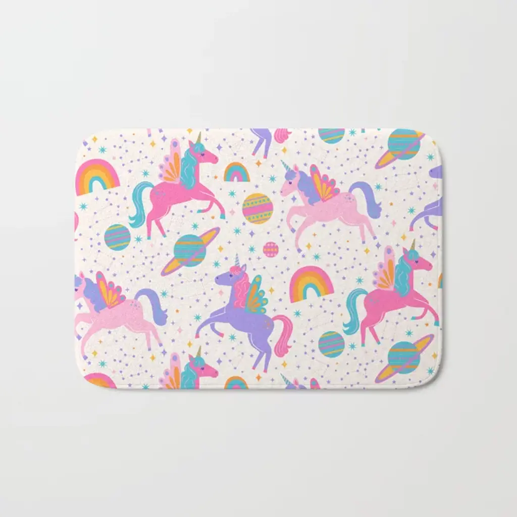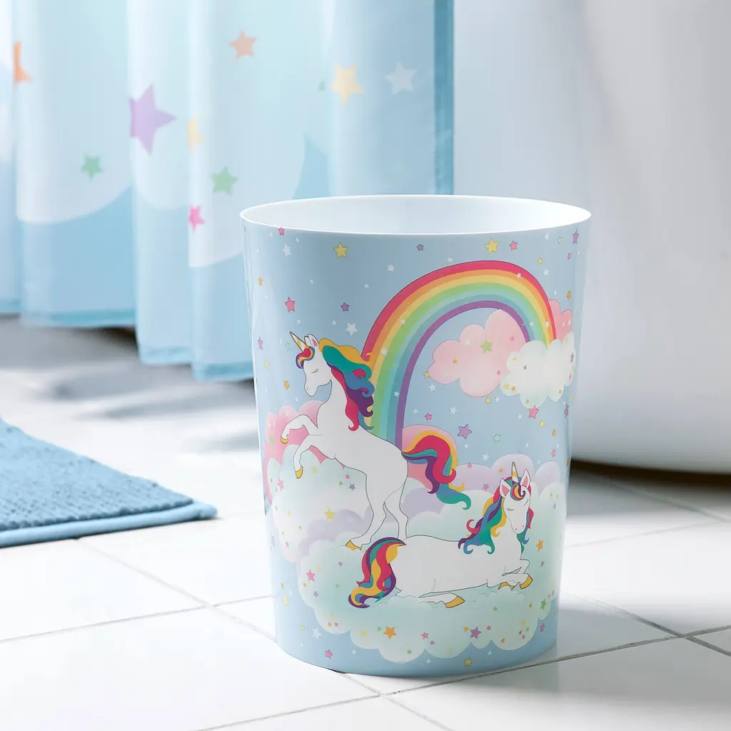 Add a magical touch to your little one's bathroom with the Unicorn and Rainbow Wastebasket by Allure Home Creation. This multi-colored basket is made of plastic and features mythical unicorns gently floating on puffy clouds of white and pink. The star filled sky blue backdrop is highlighted with a brillian curved rainbow. This fairy-tale design is sure to spark your child's imagination and make their bath time routine more fun. Spot or Wipe Clean. Complete the look with the coordinating Unicorn and Rainbow Shower Curtain and Bath Accessories.