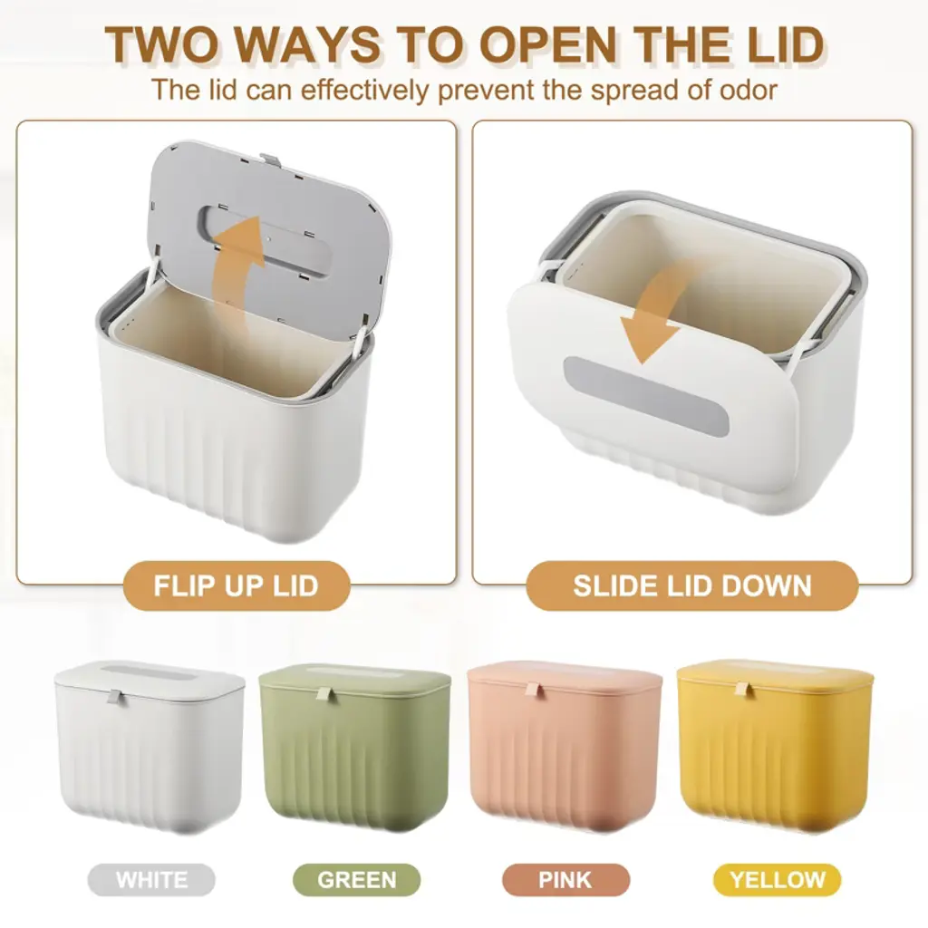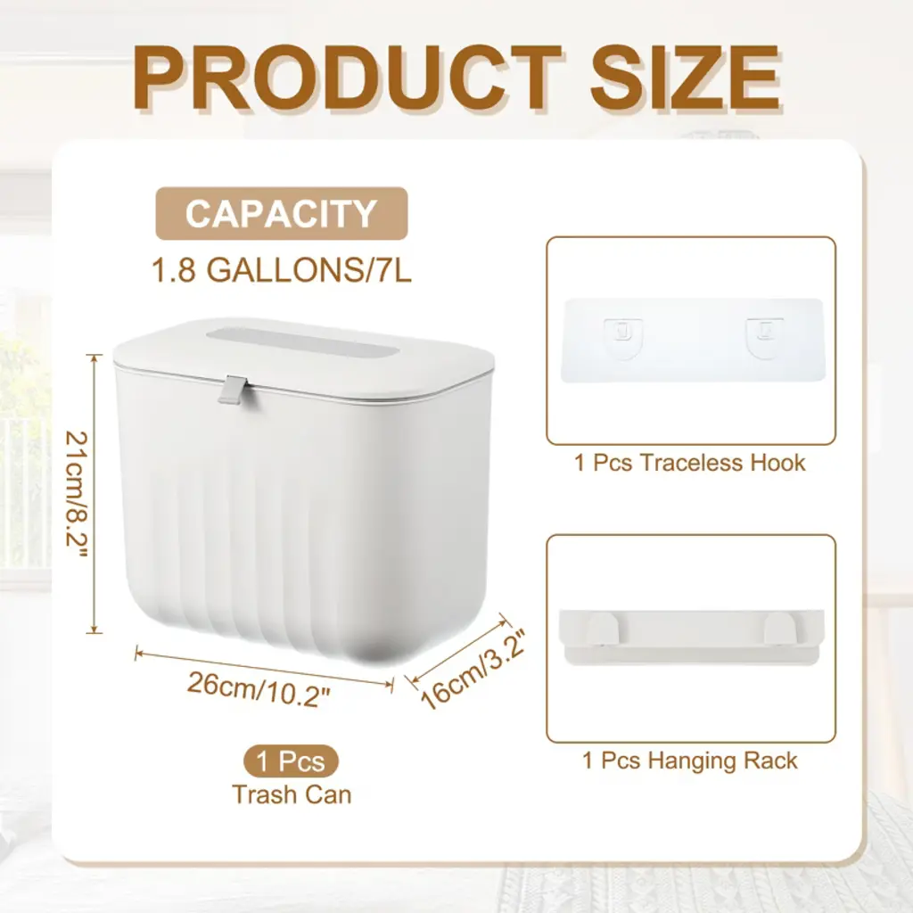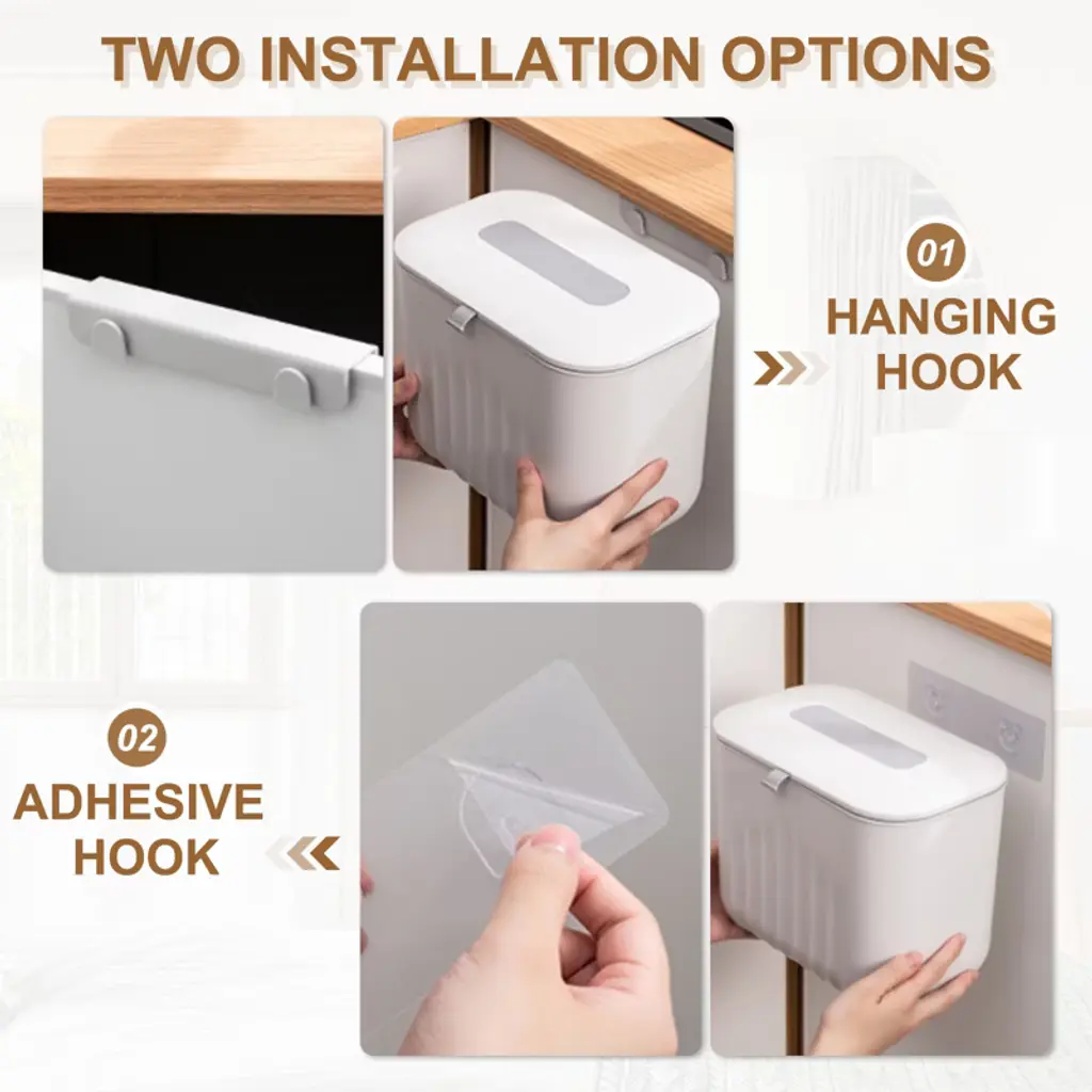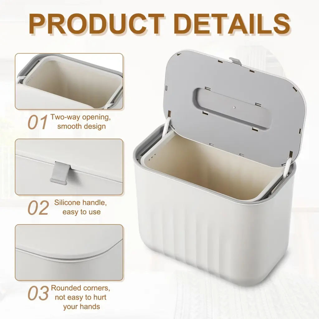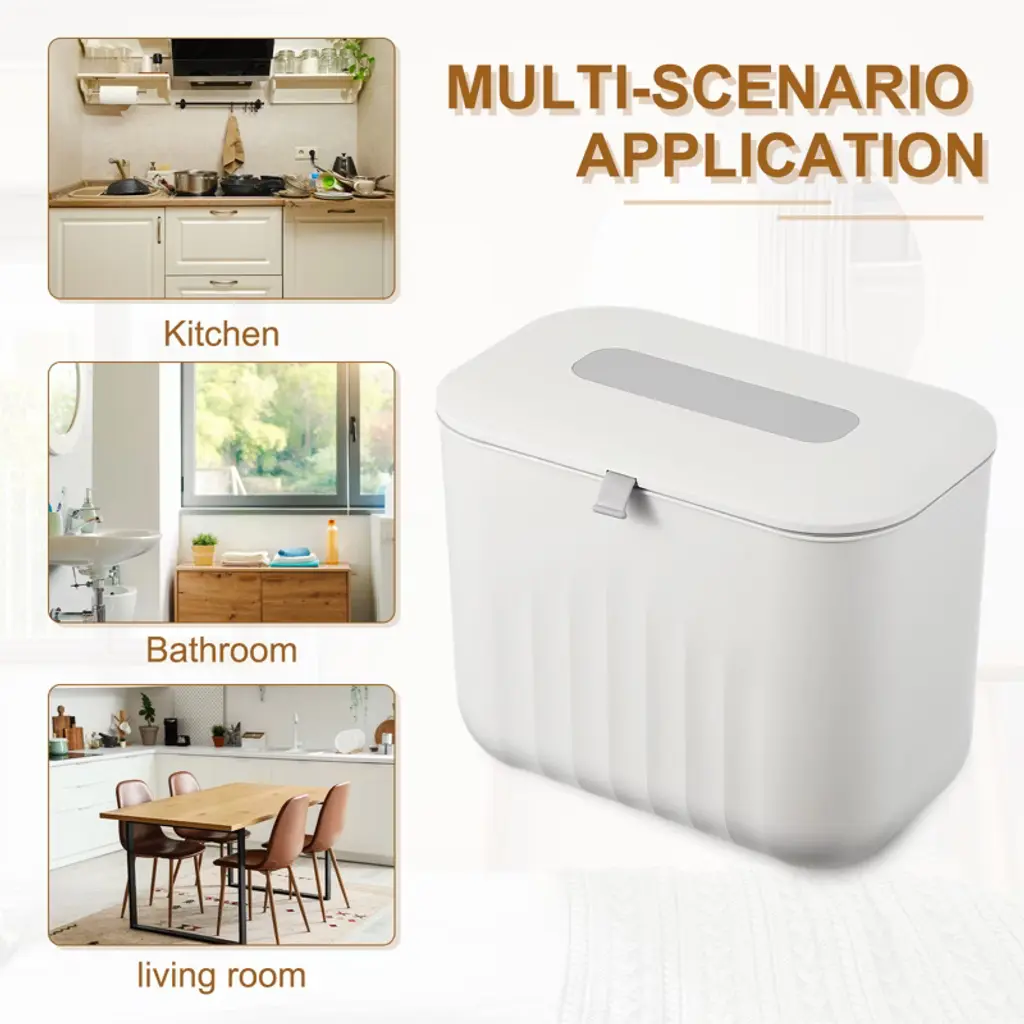 Made of PP material, this trash can features a smooth surface and rounded, burr-free edges for easy cleaning. Its tight seal helps prevent odors from entering. Equipped with a comfortable silicone handle, you can simply pull or slide it to suit your posture for quick and clean trash removal. This trash can not only store kitchen waste but also doubles as a bathroom trash can to store cosmetics and toiletries, keeping countertops tidy. It fits most cabinet doors, pantry doors, cabinets, under sinks, walls, and countertops.