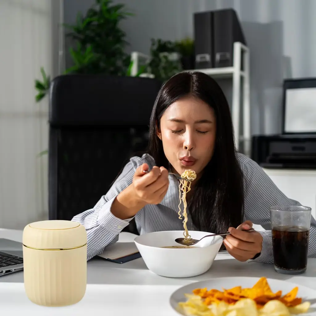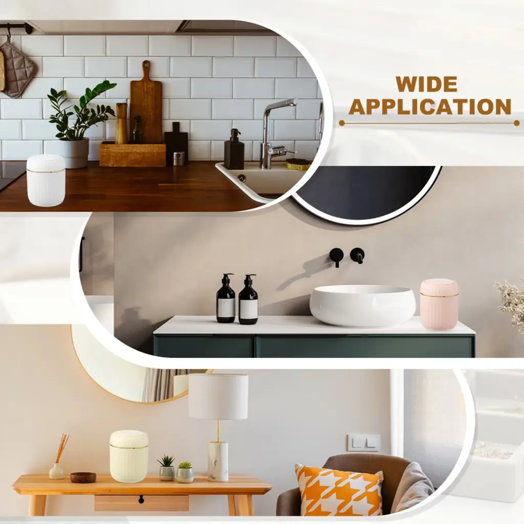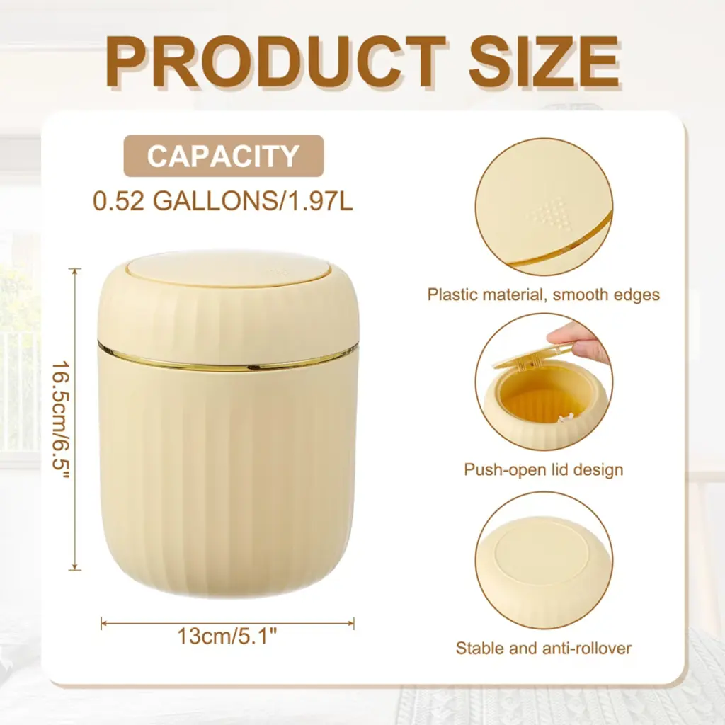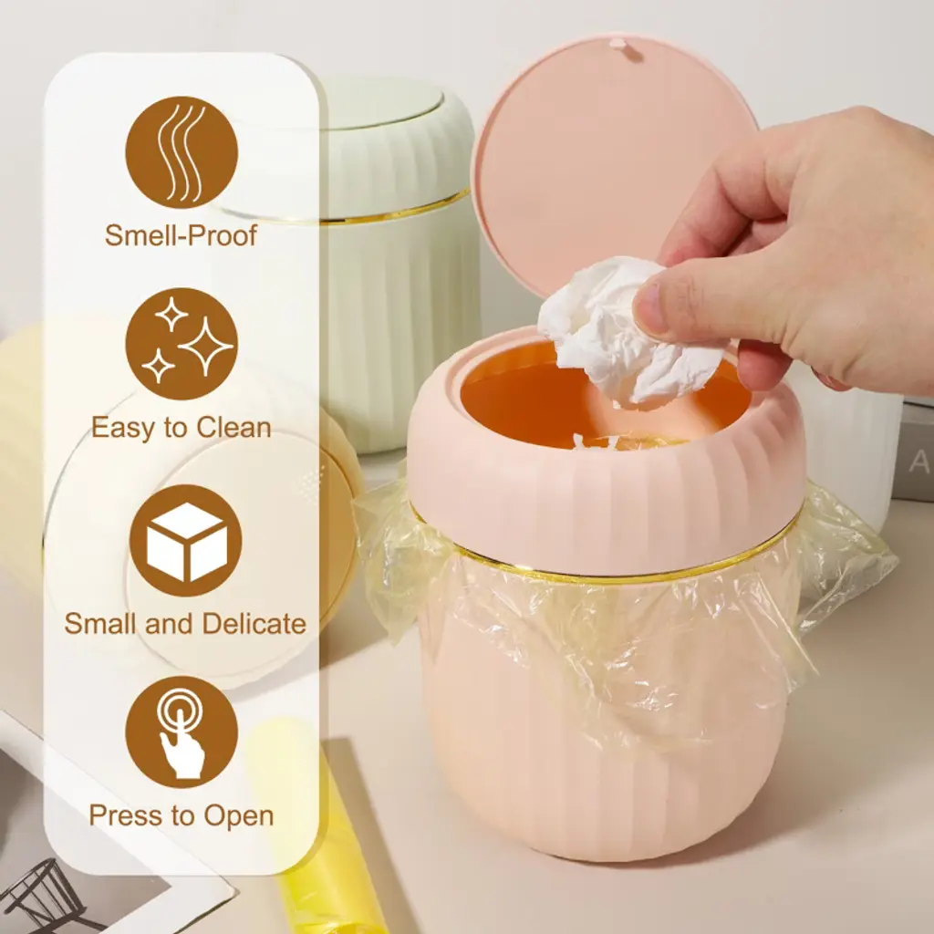The trash can is made of PP material, with a smooth surface and rounded edges without burrs, making it easy to clean. The compact and elegant design is specially designed for desktops and small spaces, saving time to walk to a large trash can for small items. The tight seal helps suppress odors from entering. It is suitable for makeup sponges, cotton swabs, tissues, coffee grounds, tea bags, fruit peels, food residues, and other small items. To use, simply press to open the lid; a gentle push is all that is needed to open the lid with one hand.
