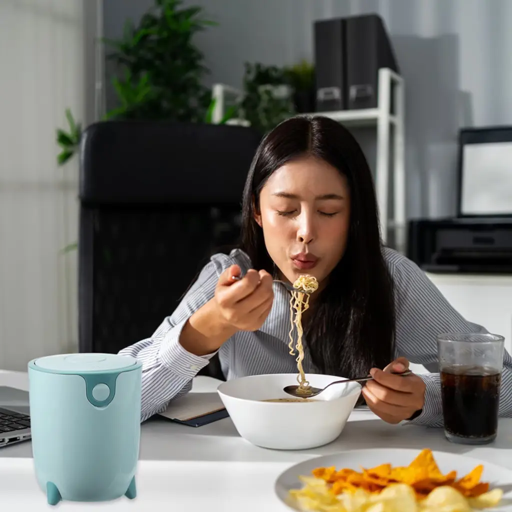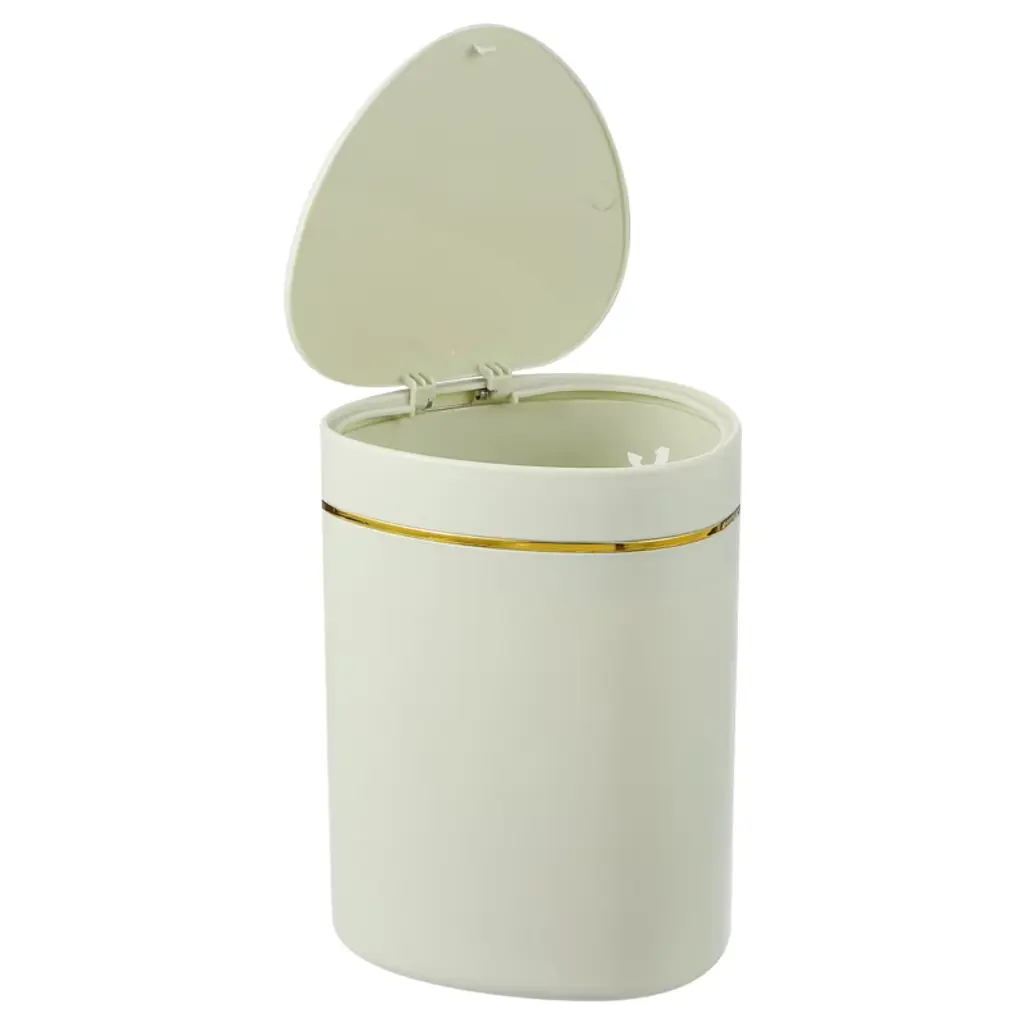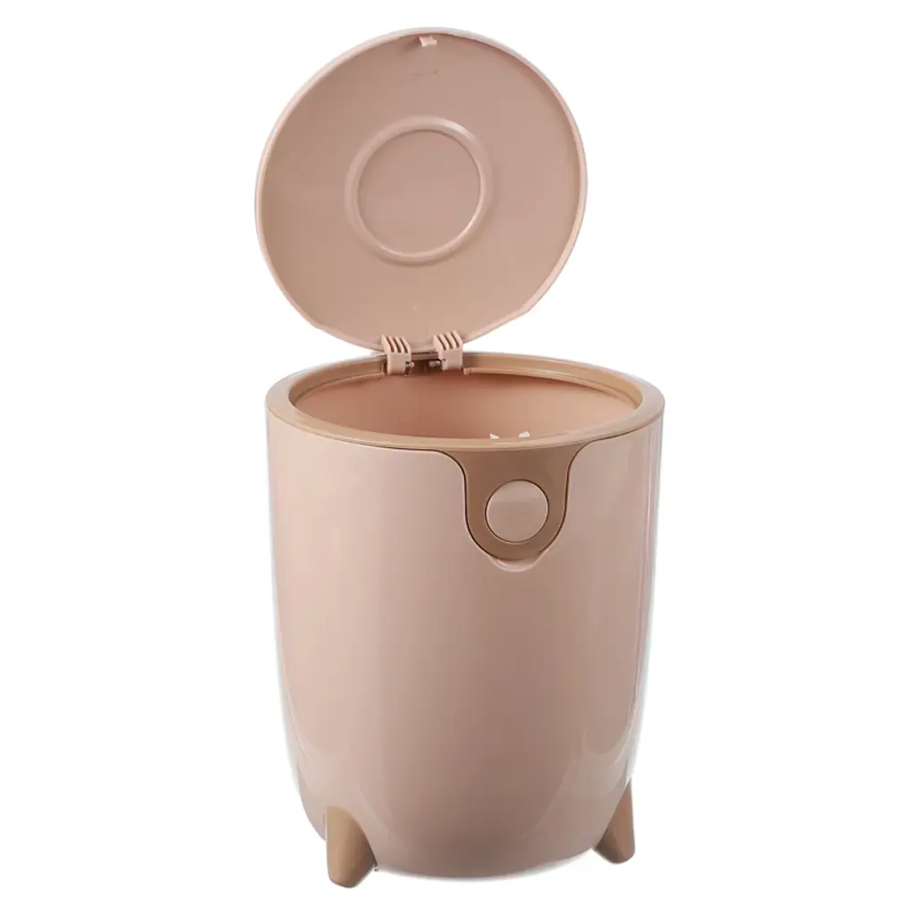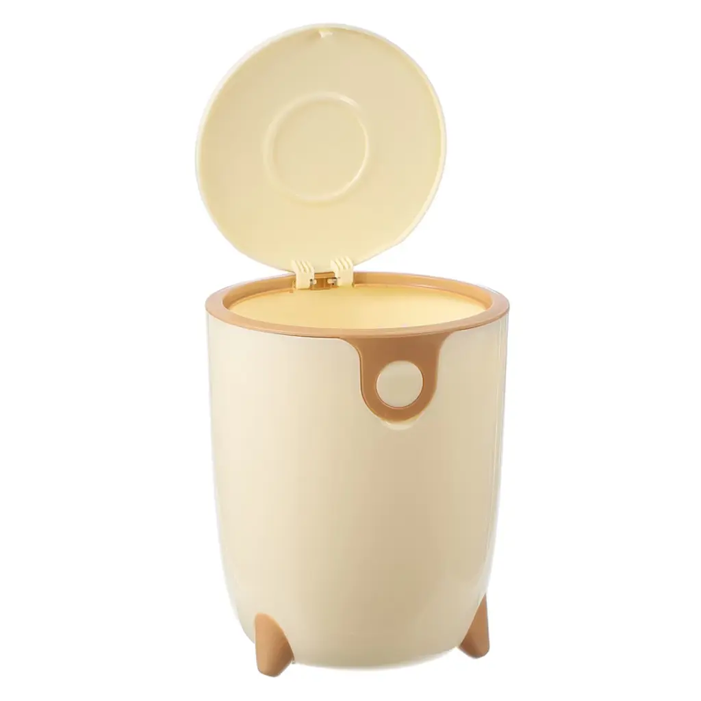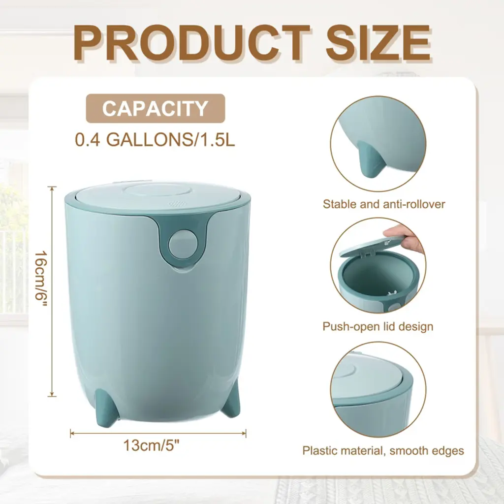 The trash can is made of PP material, with a smooth surface and rounded edges without burrs, making it easy to clean. The compact and elegant design is specially designed for desktops and small spaces, saving time to walk to a large trash can for small items. The tight seal helps suppress odors from entering. It is suitable for makeup sponges, cotton swabs, tissues, coffee grounds, tea bags, fruit peels, food residues, and other small items. To use, simply press to open the lid; a gentle push is all that is needed to open the lid with one hand.
