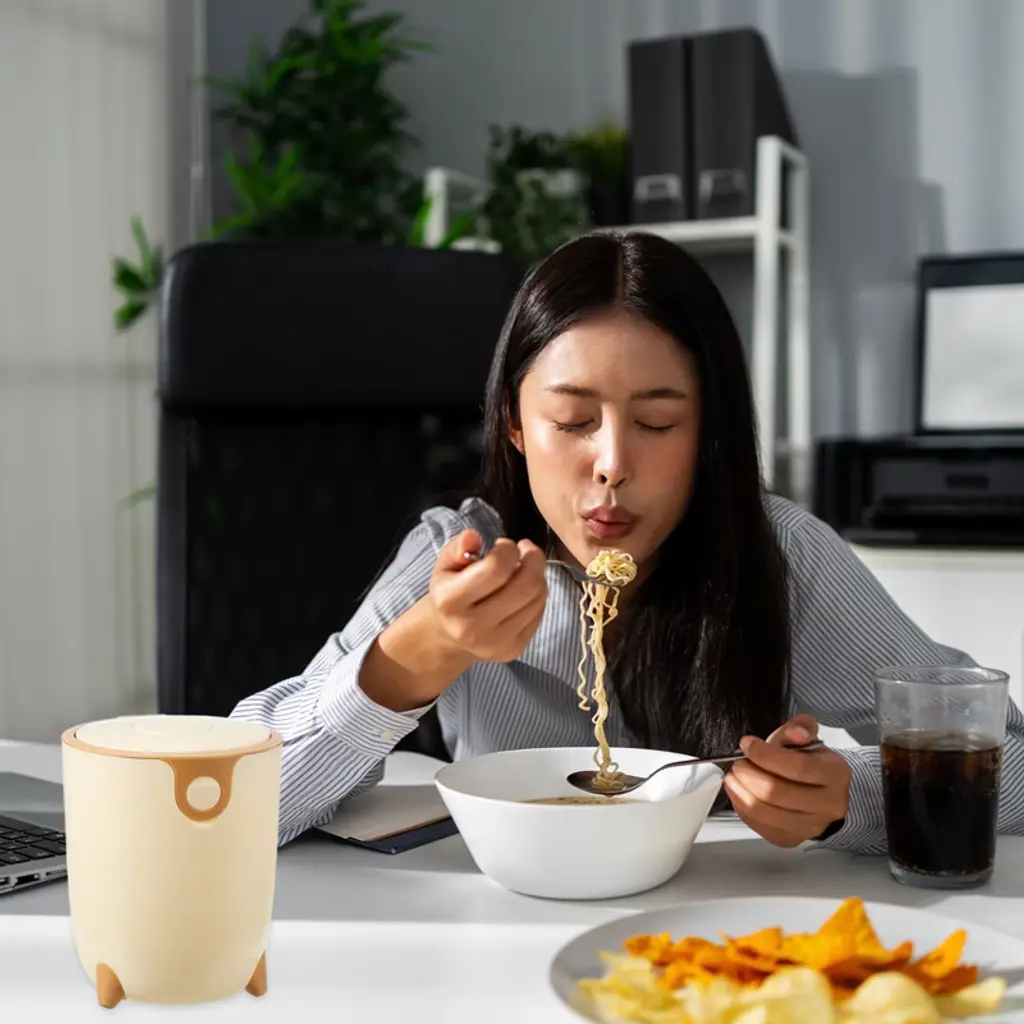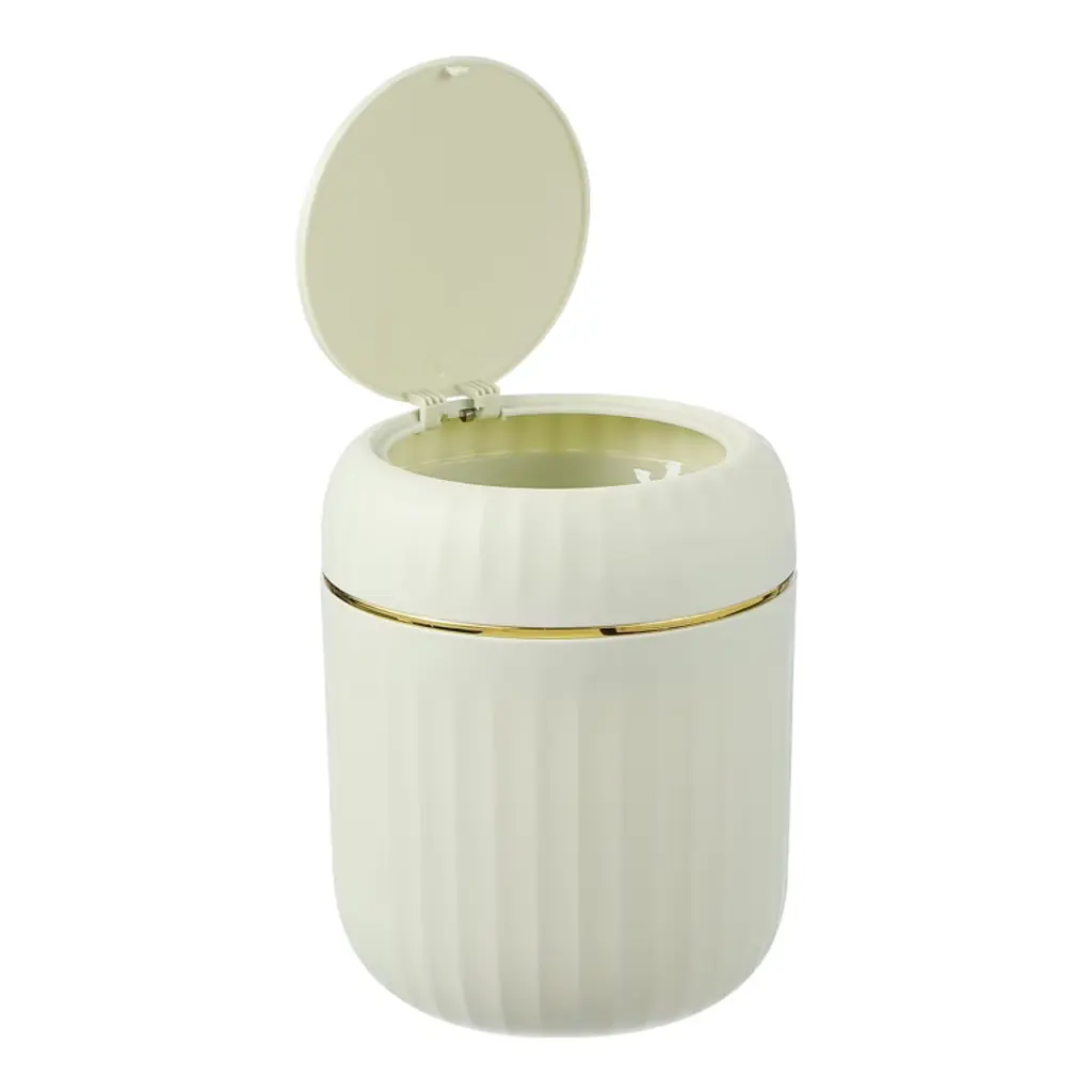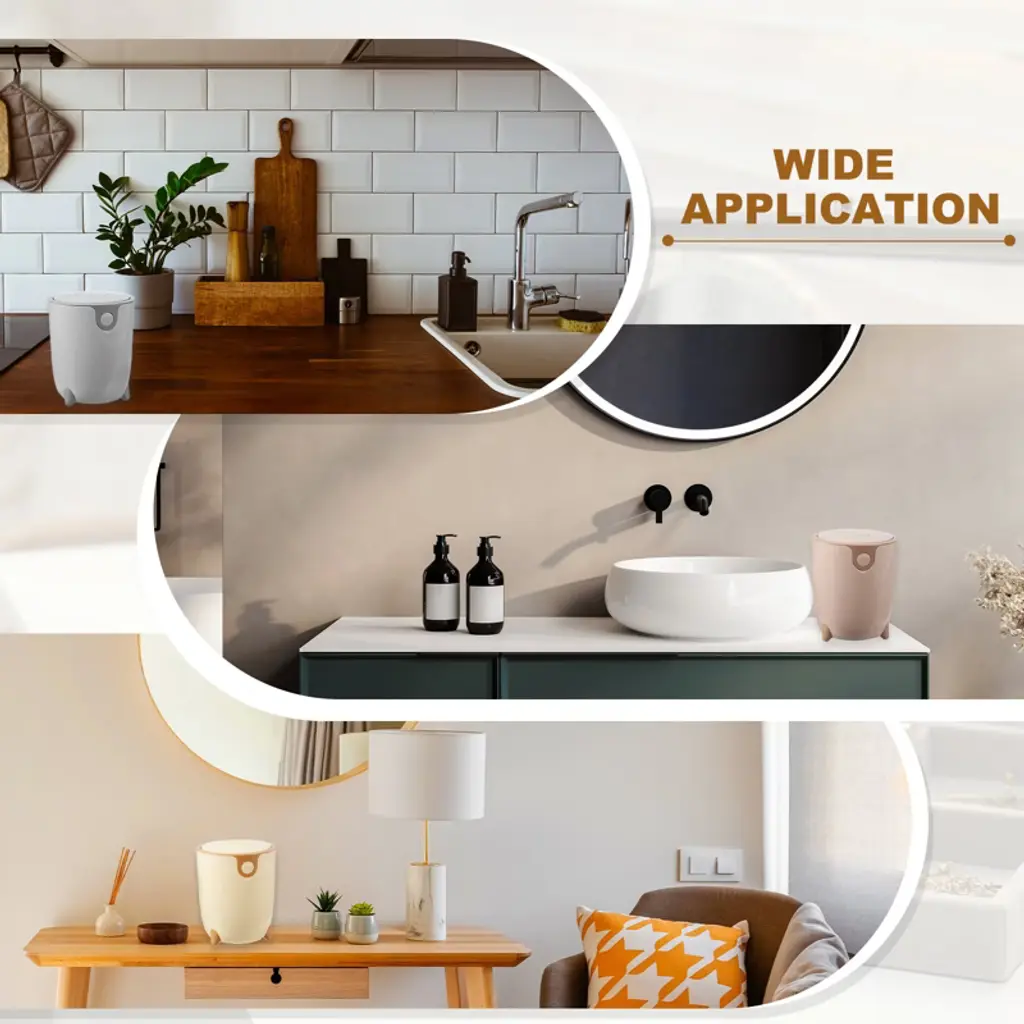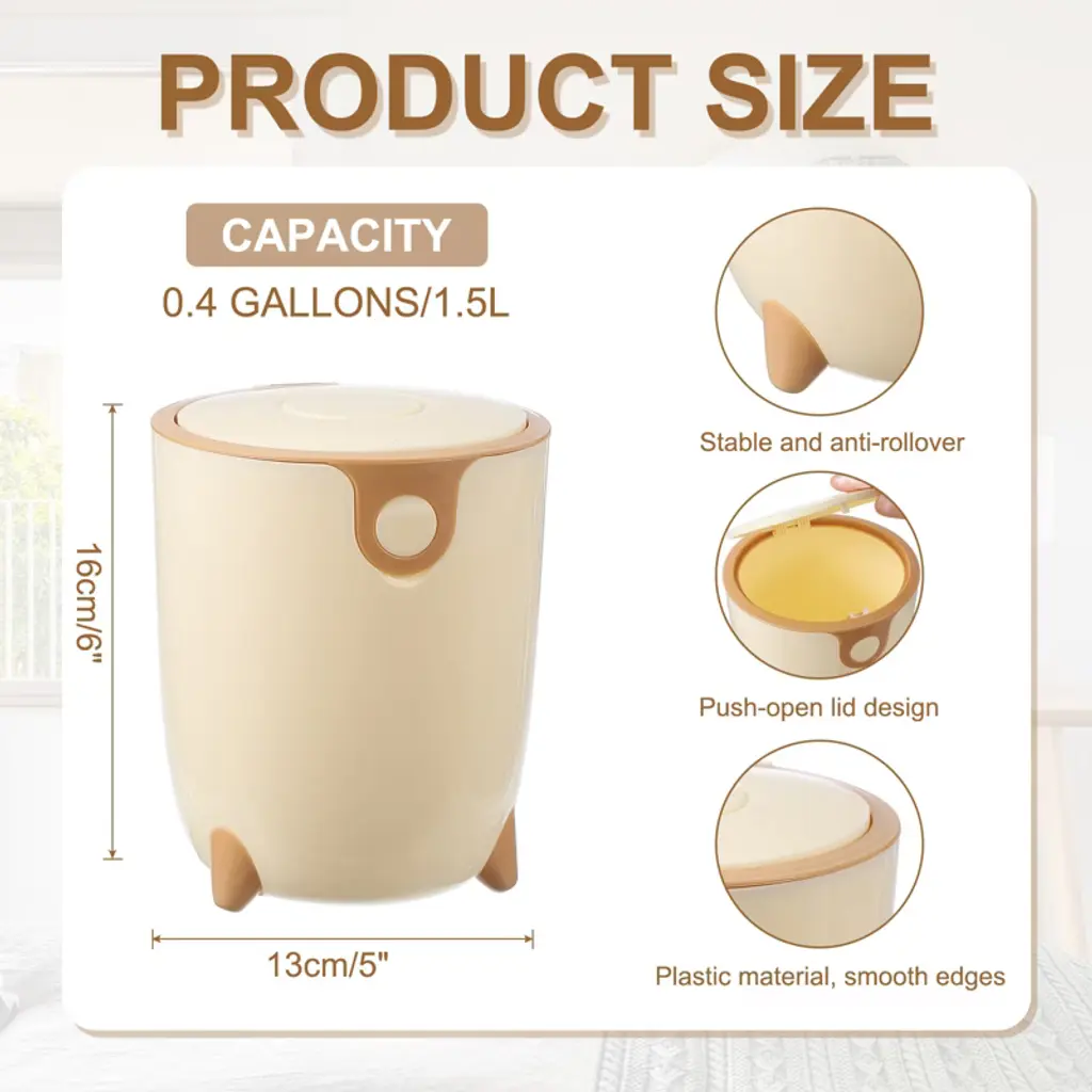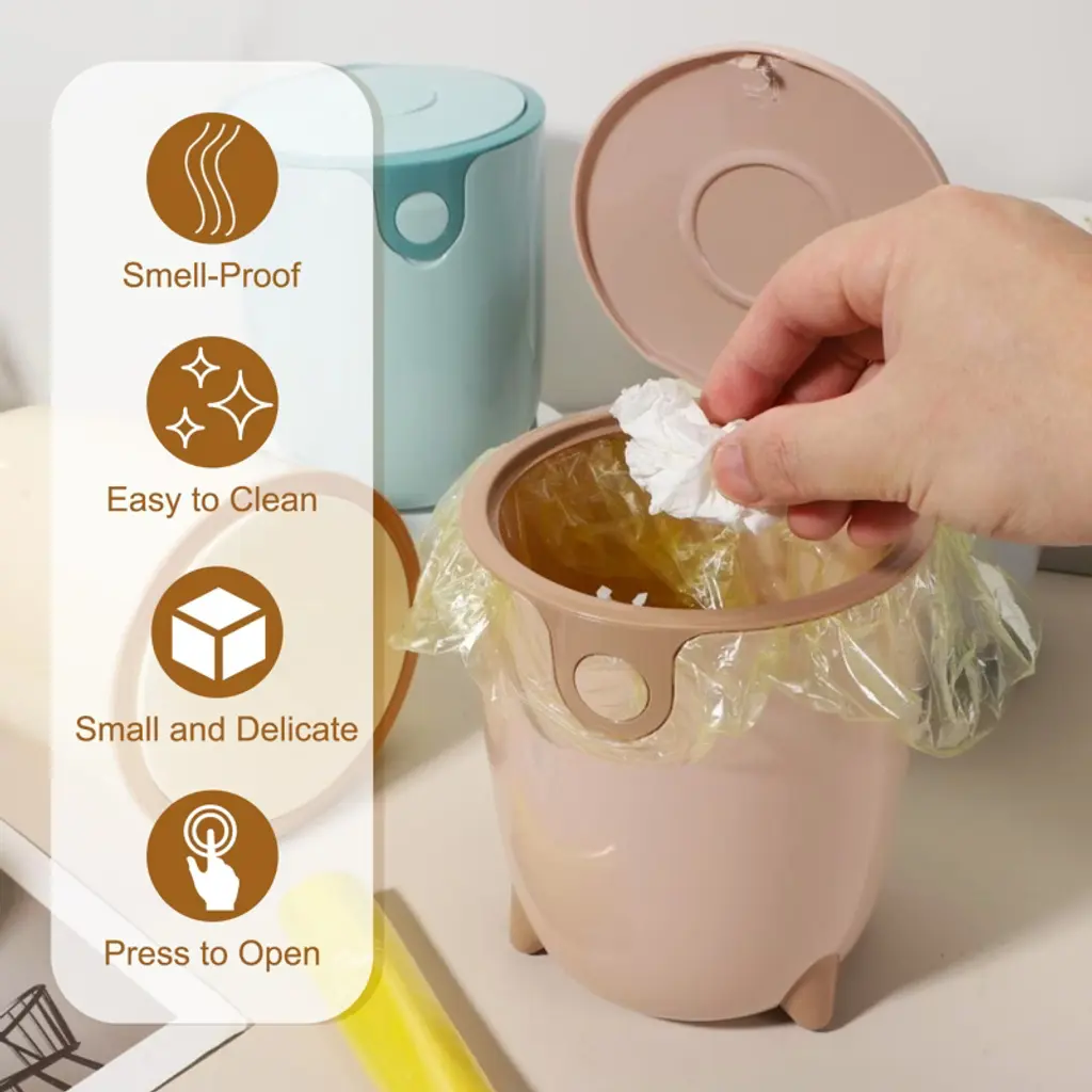 The trash can is made of PP material, with a smooth surface and rounded edges without burrs, making it easy to clean. The compact and elegant design is specially designed for desktops and small spaces, saving time to walk to a large trash can for small items. The tight seal helps suppress odors from entering. It is suitable for makeup sponges, cotton swabs, tissues, coffee grounds, tea bags, fruit peels, food residues, and other small items. To use, simply press to open the lid; a gentle push is all that is needed to open the lid with one hand.