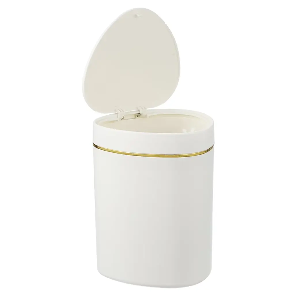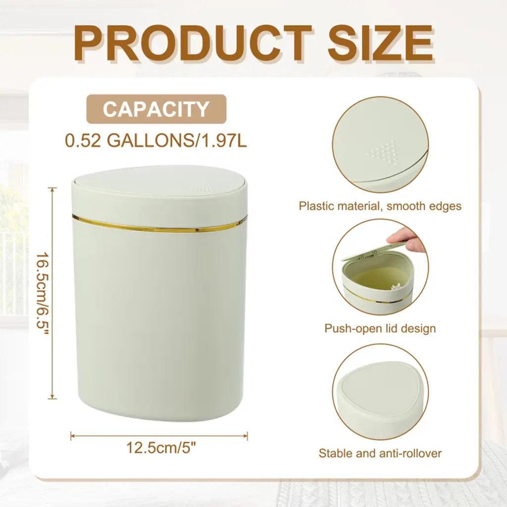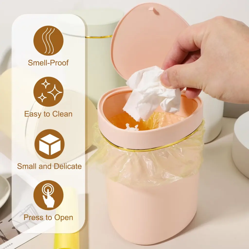 The trash can is made of PP material, with a smooth surface and rounded edges without burrs, making it easy to clean. The compact and elegant design is specially designed for desktops and small spaces, saving time to walk to a large trash can for small items. The tight seal helps suppress odors from entering. It is suitable for makeup sponges, cotton swabs, tissues, coffee grounds, tea bags, fruit peels, food residues, and other small items. To use, simply press to open the lid; a gentle push is all that is needed to open the lid with one hand.