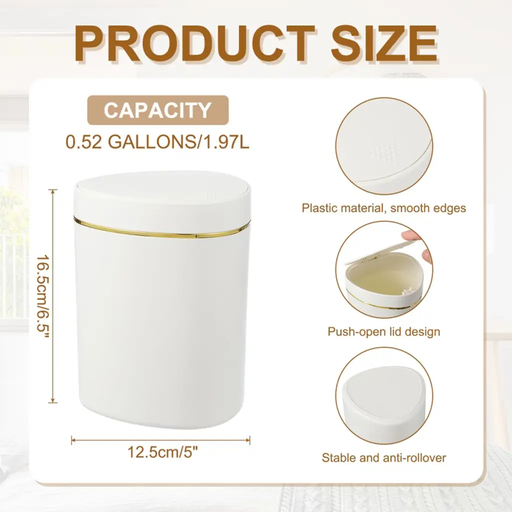 The trash can is made of PP material, with a smooth surface and rounded edges without burrs, making it easy to clean. The compact and elegant design is specially designed for desktops and small spaces, saving time to walk to a large trash can for small items. The tight seal helps suppress odors from entering. It is suitable for makeup sponges, cotton swabs, tissues, coffee grounds, tea bags, fruit peels, food residues, and other small items. To use, simply press to open the lid; a gentle push is all that is needed to open the lid with one hand.