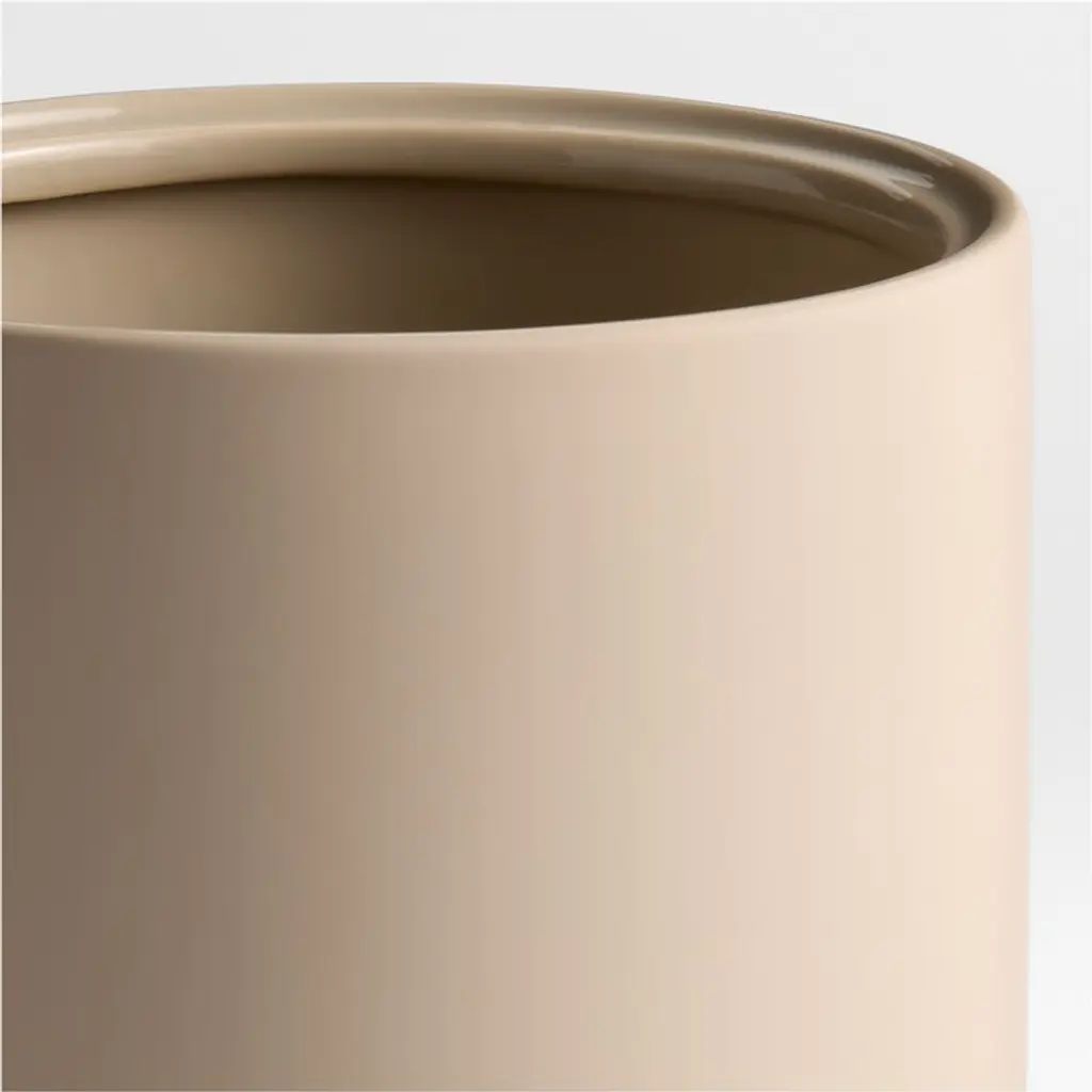 Our Varick bathroom collection dips sturdy ceramic in soft-touch, sand-hued silicone that feels soft and luxurious. The gentle, minimalist curves and compact scale suit even the smallest powder room, guest bath or en suite. Subtly tinted in a muted caramel color that's warm yet modern, this tonal trash can pairs a matte exterior with a glossy interior finish. Outfit bathrooms in all of our Varick accessories to create serene sanctuaries that are ready for company.
