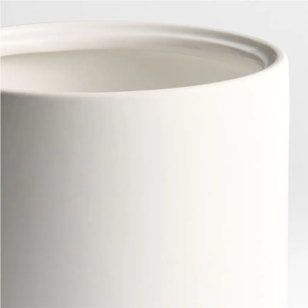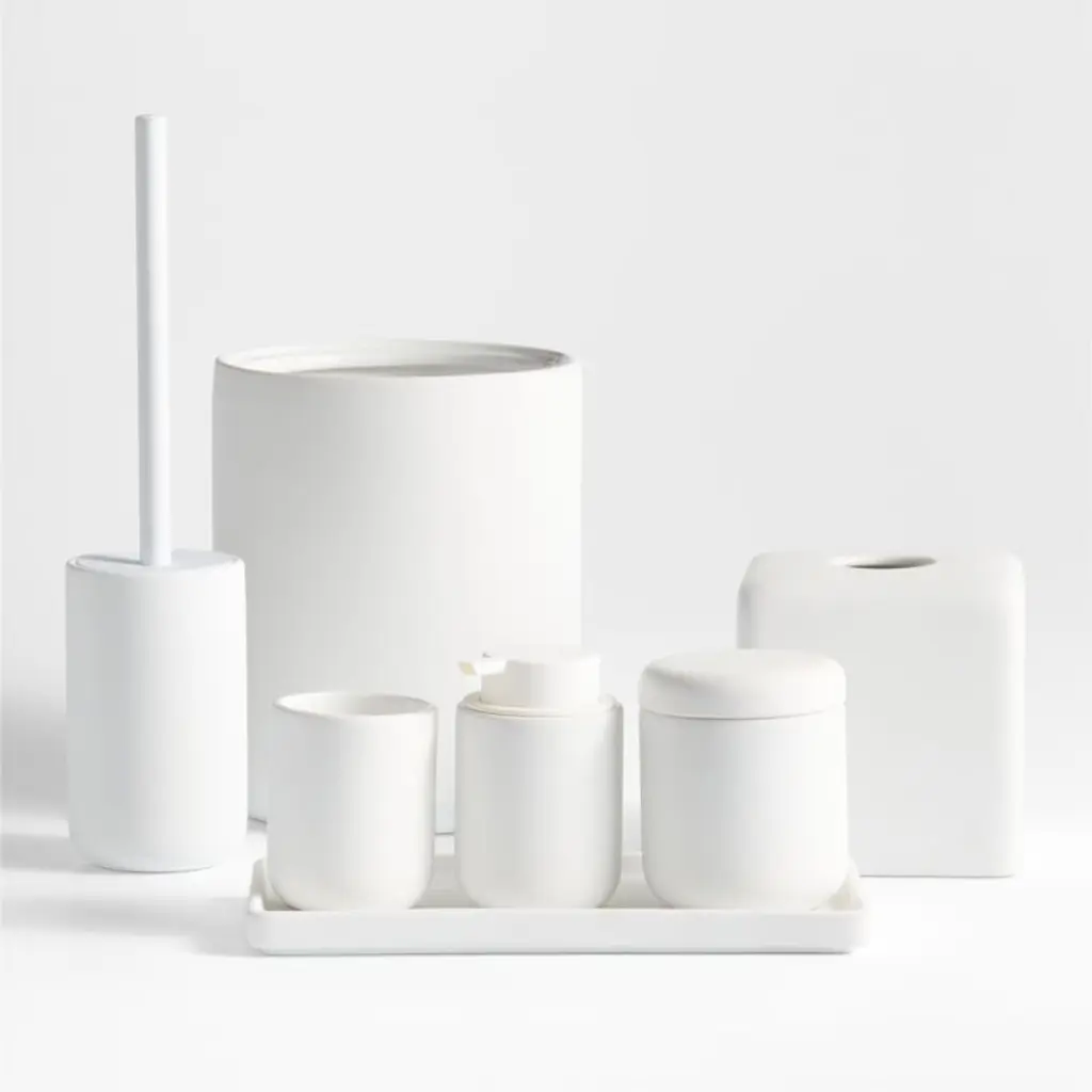 Our Varick bathroom collection dips sturdy ceramic in white soft-touch silicone that feels soft and luxurious. The gentle, minimalist curves and compact scale suit even the smallest powder room, guest bath or en suite. This tonal trash can pairs a matte exterior with a glossy interior finish. Outfit bathrooms in all of our Varick accessories to create serene sanctuaries that are ready for company.