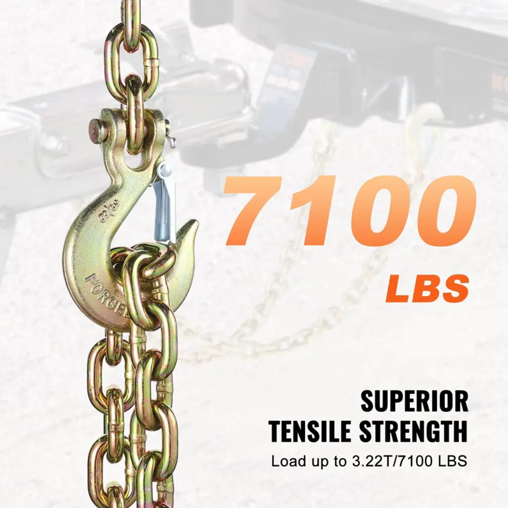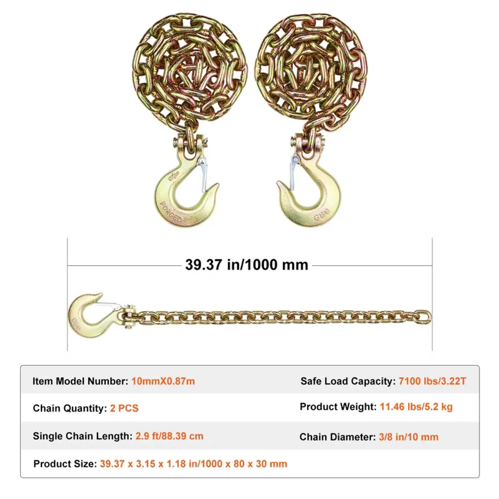 Feature: G80 Grade Strength: This G80 grade binder chain boasts impressive tensile strength! With a length of 2.9 ft (88.39 cm) and a diameter of 3/8 in (10 mm), it can handle a breaking strength of up to 30,000 lbs (13.6T). 7100 lbs/3.22T Strong Load Capacity: Our tow chain can handle a working load of 7100 lbs (3.22T). With a 4:1 security factor, it means you're covered for loads up to four times that amount. Feel secure and confident with every use. Safe and Reliable: Meeting DOT requirements, this towing chain has clearly marked parts and can take on heavy-duty wear and tear. If you stay within the safe load range, you're good to go. Got questions? We're here to help! Durable and Wear-Resistant: Made from high-quality steel and galvanized for extra protection, this tie down chain and hook combo resists corrosion and heavy-duty wear. Perfect for long-term use, even in tough conditions. Versatile for Towing: Designed for safe towing, this log chain is your go-to for trailers, RVs, trucks, and more. Whether you're on the road or on the farm, it's ready to handle the job! Package Content 2 x Binder Chains
