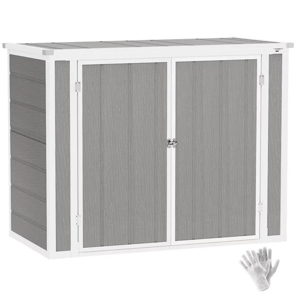 This single wheelie bin shed is ideal for hiding your bin from view in the garden.Durable material: Poly rattan is an exceptional resistance material and durable with different weather conditions. It also needs little maintenance.Stable frame: The powder-coated steel frame ensures sturdiness and stability.Practical design: The lid of this bin shed can be opened for easy access to the wheelie bin when depositing rubbish. It also has doors with lock at the front so the bin can be easily removed and emptied.Note: Each product comes with an assembly manual in the box for easy assembly.Wheelie bin is not included in delivery.