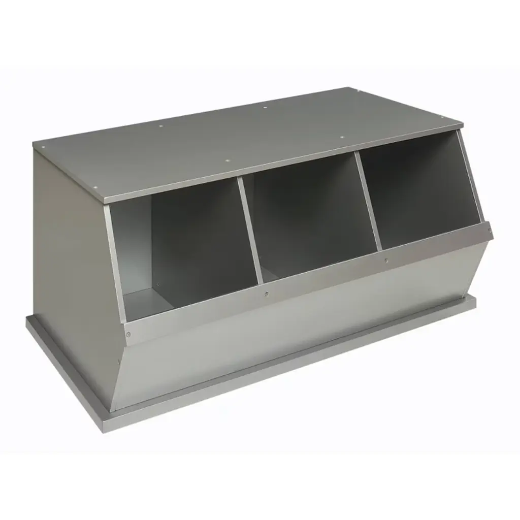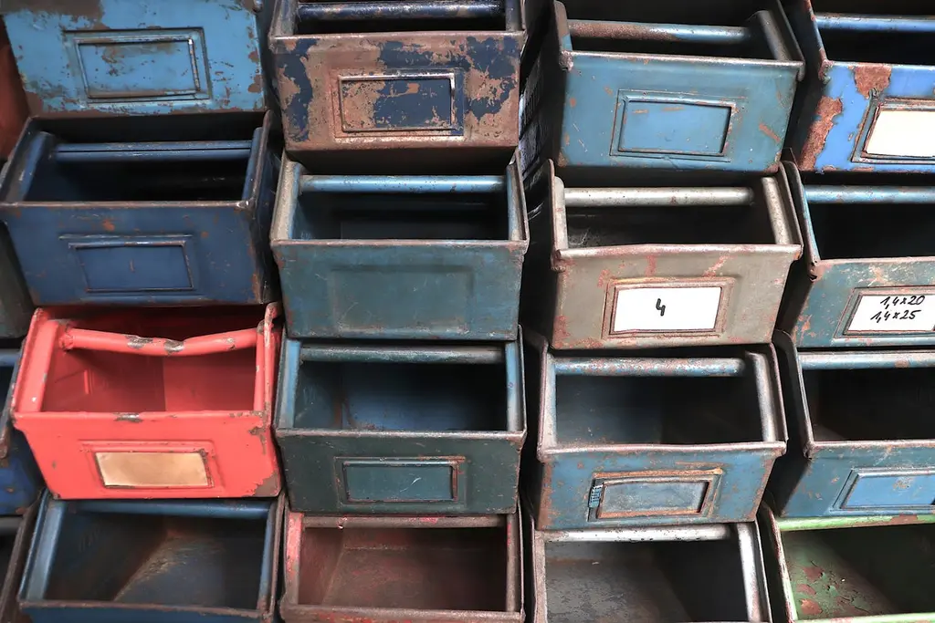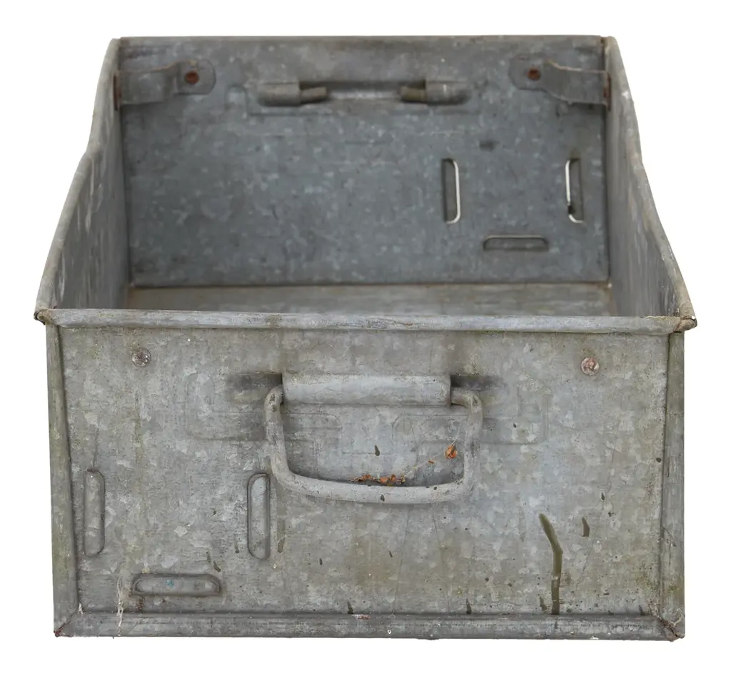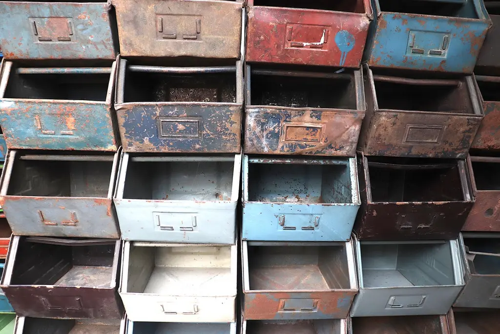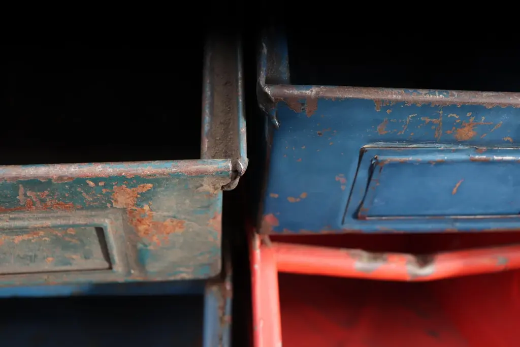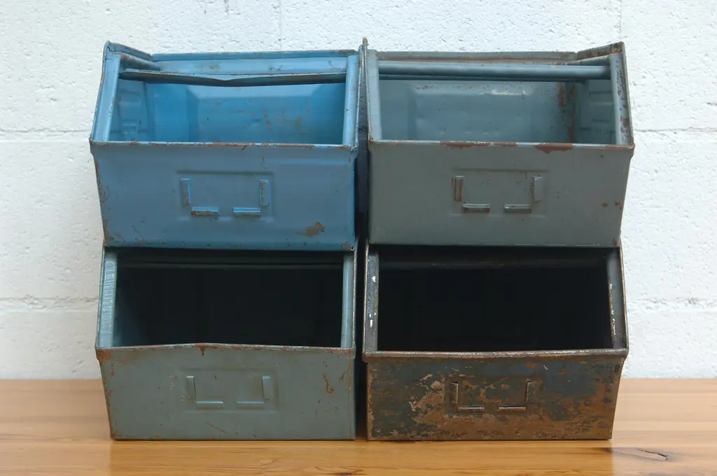 Medium sized multi-color enameled metal stacking utility bins in original condition with visible patina and wear. Mostly in shades of gray, brown and blue. 1 left in green. Varying conditions of use. Other sizes available, listed separately.