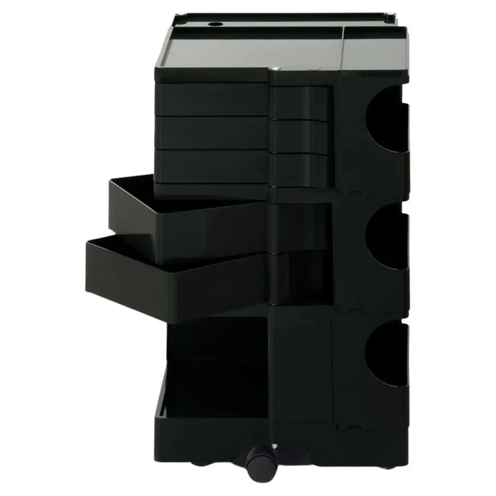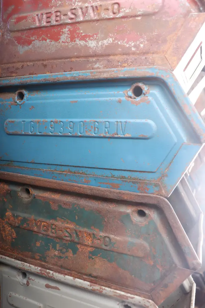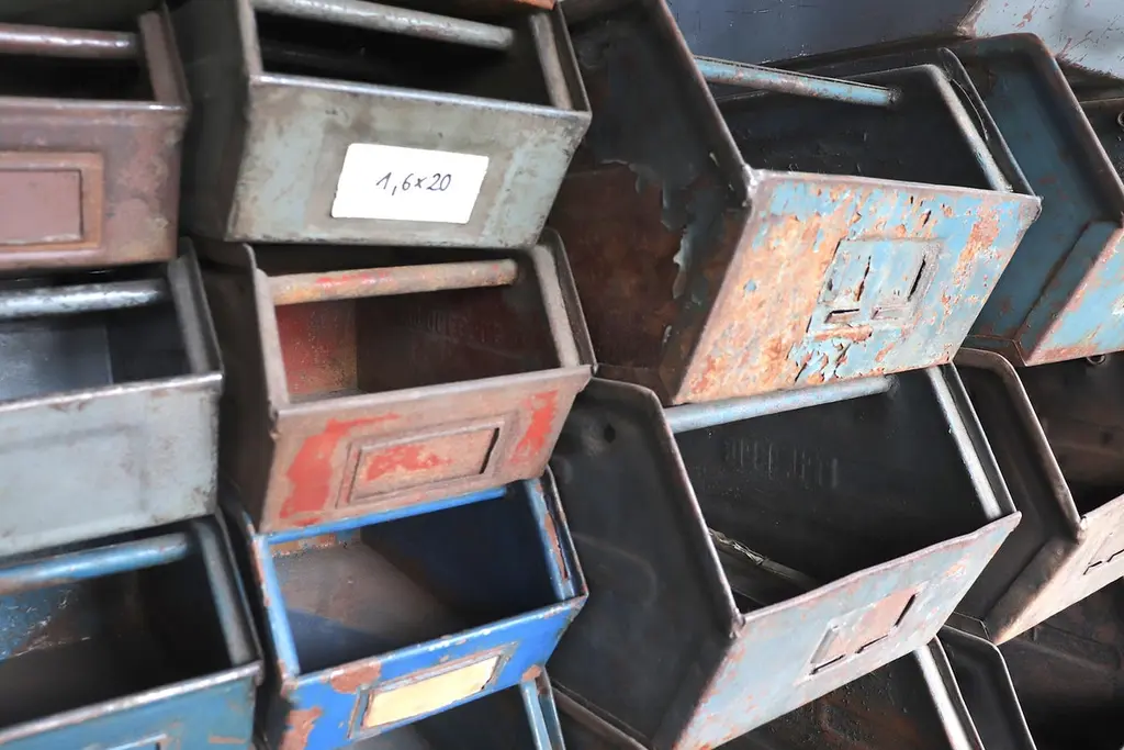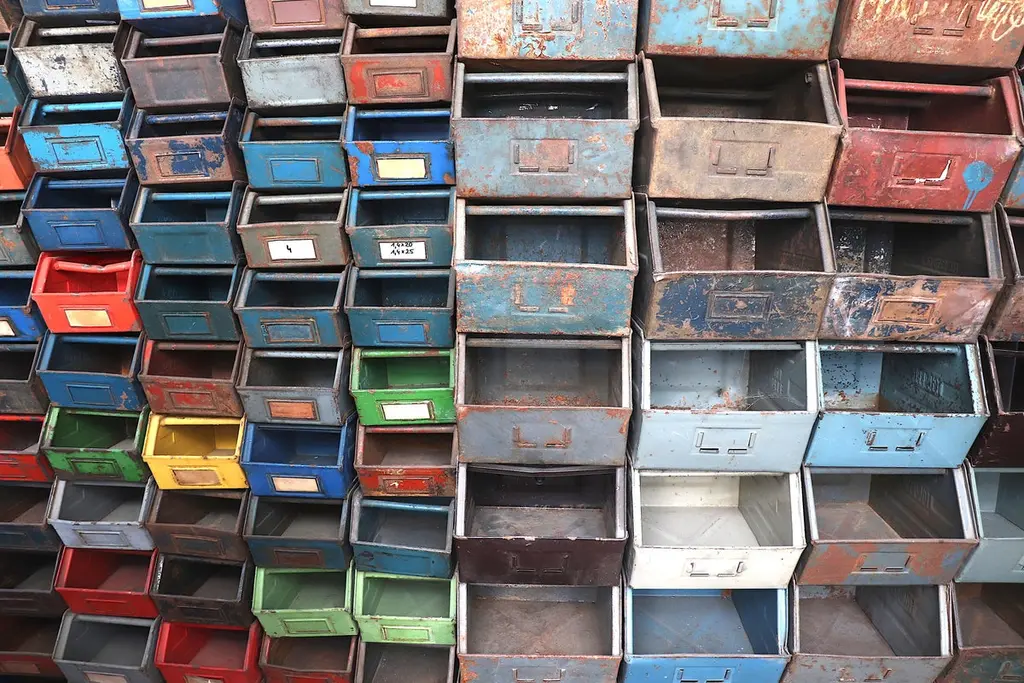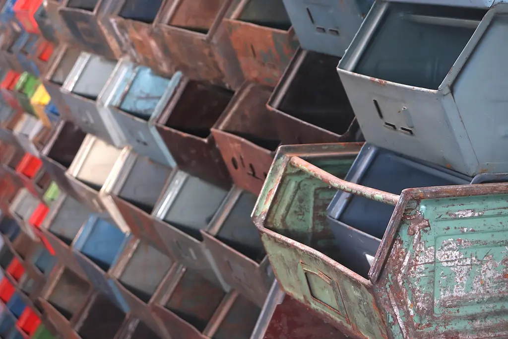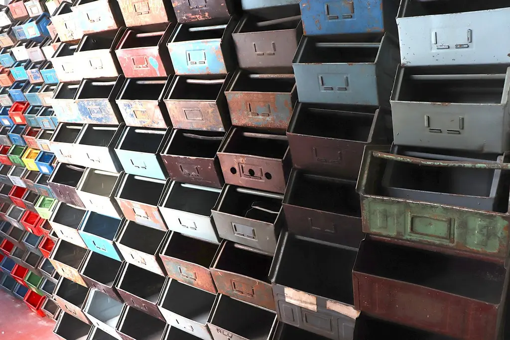 Medium sized multi-color enameled metal stacking utility bins in original condition with visible patina and wear. Mostly in shades of gray, brown and blue. 1 left in green. Varying conditions of use. Other sizes available, listed separately.