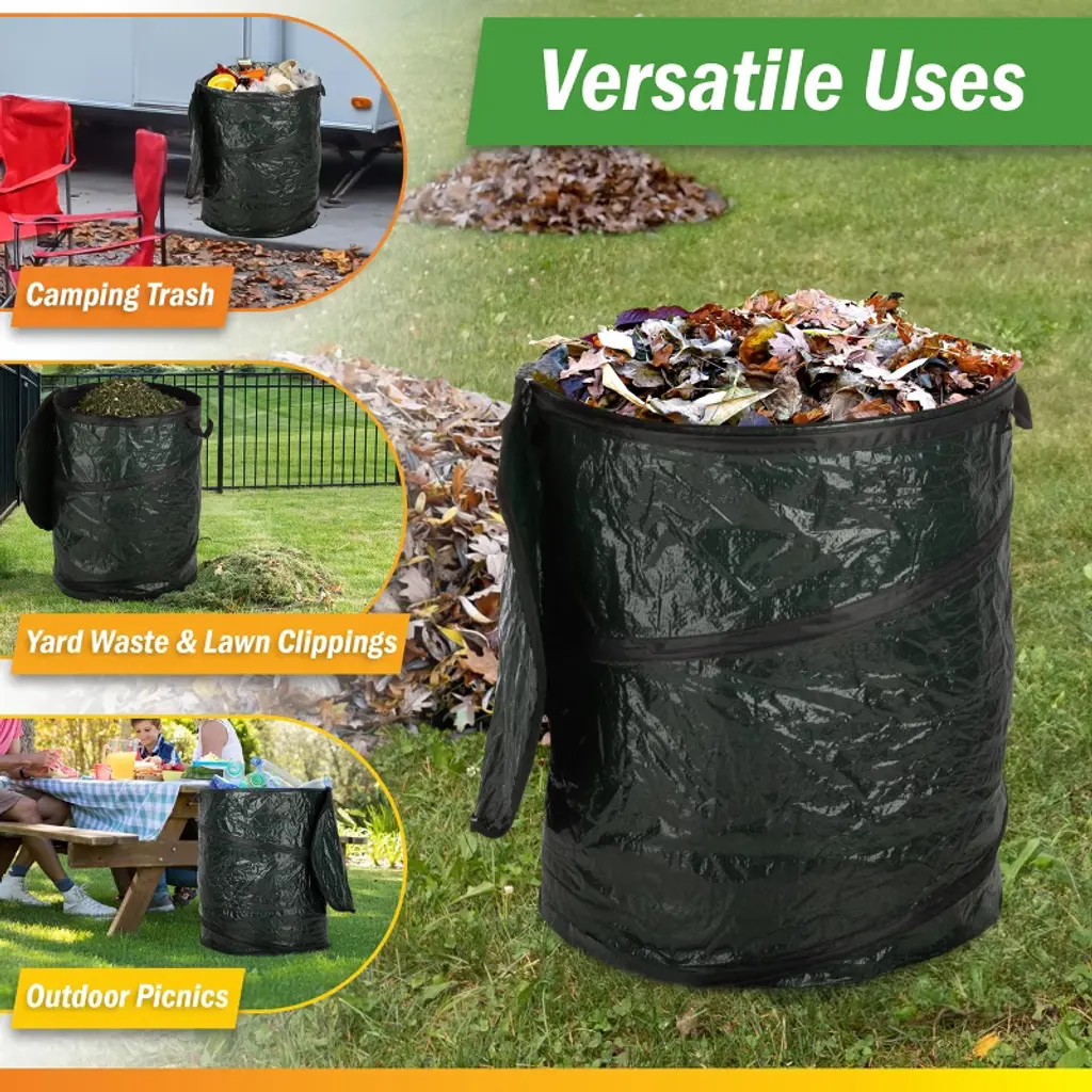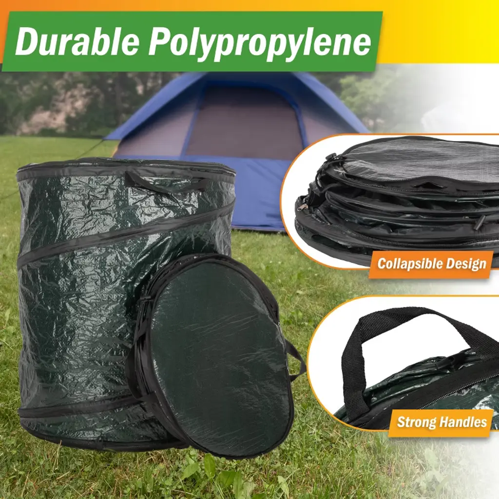 Outdoor cleanup is a breeze with the Camping Garbage Can Collapsible Bin Set of 3 by Wakeman Outdoors. This set includes 1 small 23.1-gallon, 1 medium 29.5-gallon, and 1 large 44-gallon camping trash can, so you’re sure to have the right outdoor garbage can with lid for the job. Whether you’re keeping your campsite tidy, collecting trash during a family reunion, carrying laundry, or in need of a collapsible leaf bag for collecting yard waste, this pop up trash can set has you covered. Each camp or RV trash can is made from durable polypropylene material with a zippered lid, built-in handles for portability, and a lightweight collapsible design that won’t add too much bulk to your camping supplies.