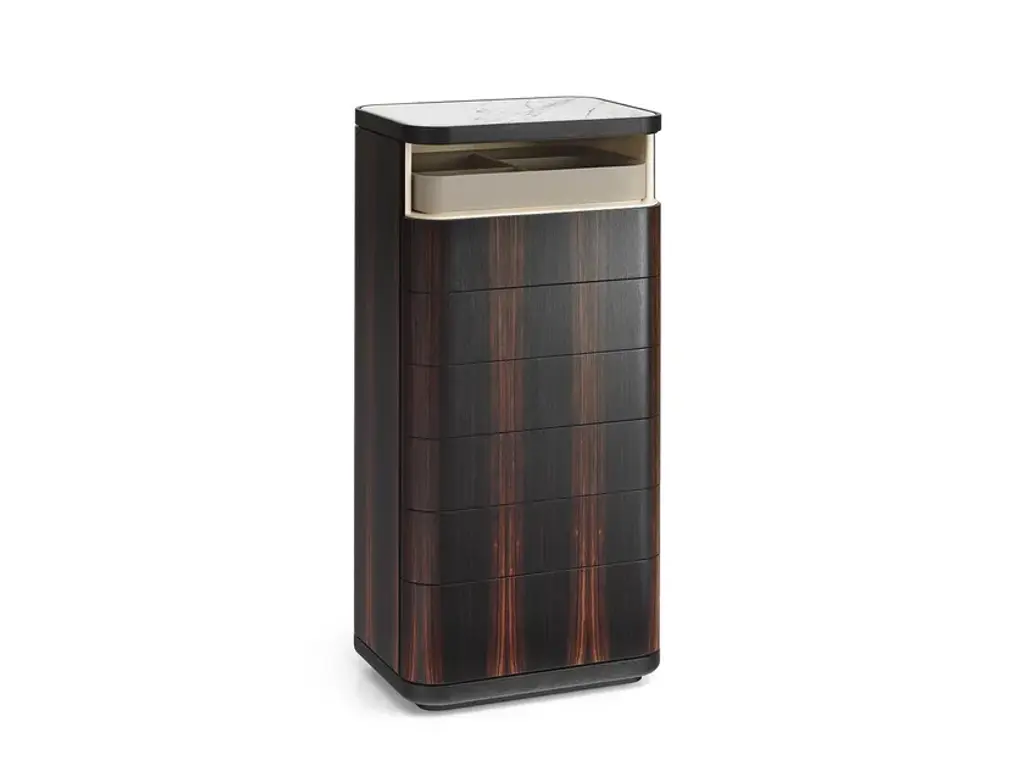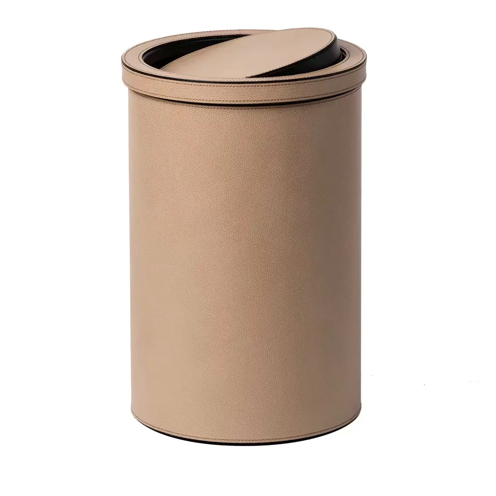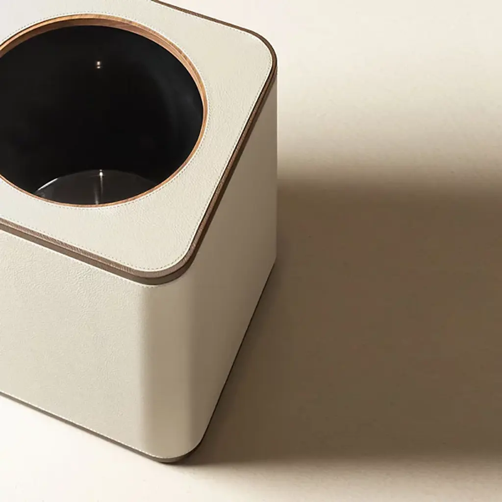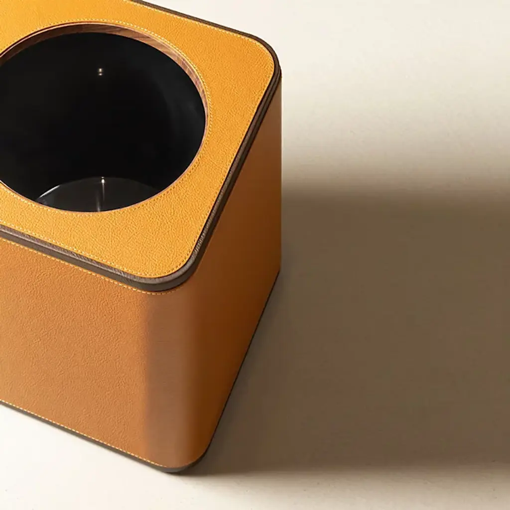Designed by Giobagnara for Poltrona Frau, the Waste Paper Bin boasts an elegant parallelepiped shape with rounded corners. Crafted from wood and fully upholstered in luxurious Pelle Frau® leather, it features refined visible stitching that adds a touch of sophistication, making it a stylish and functional accessory for any space.