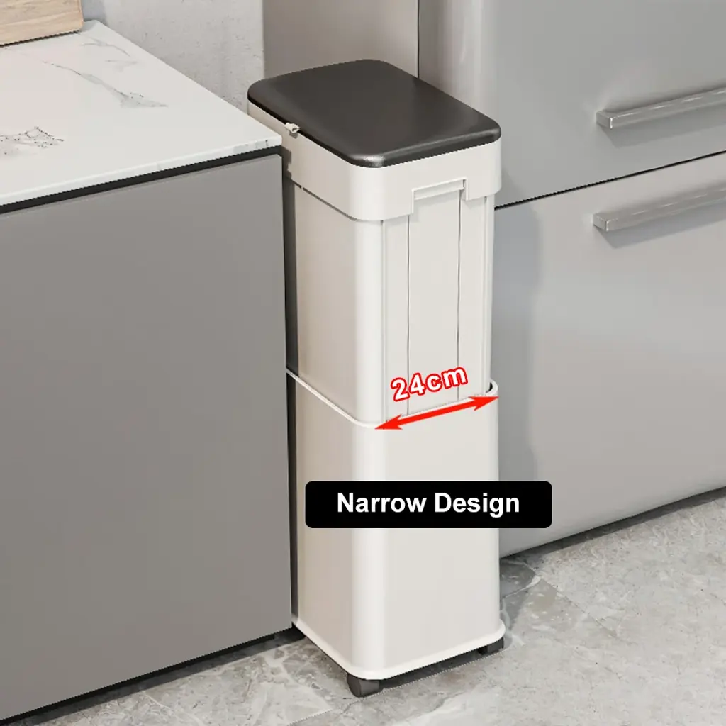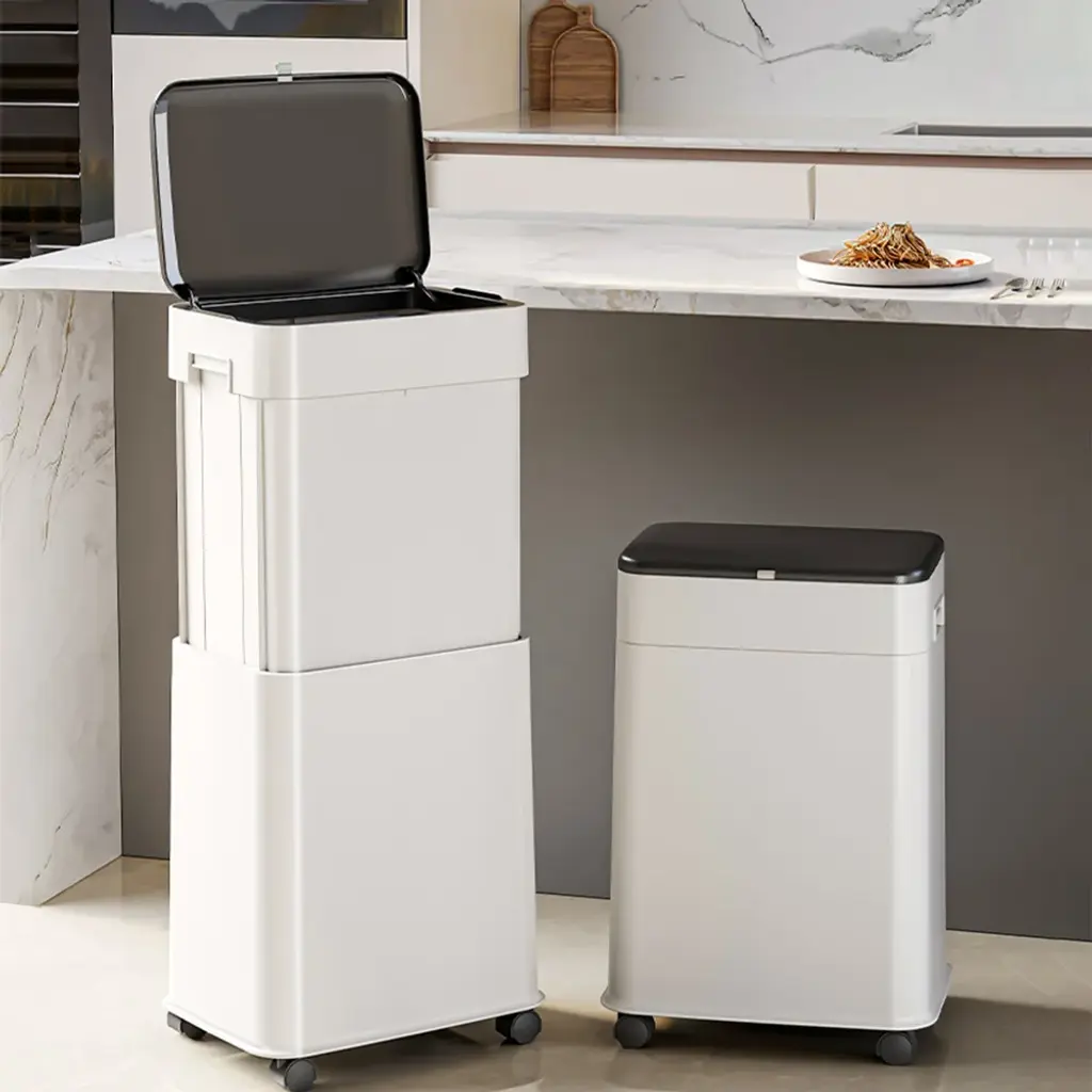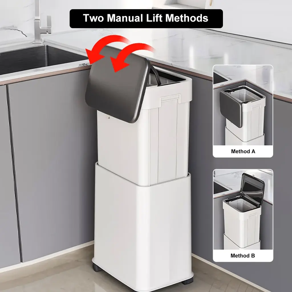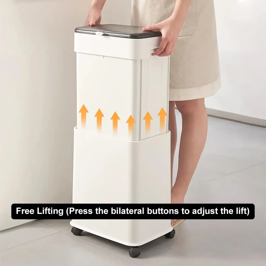 With smooth-rolling wheels, this garbage bin offers unparalleled maneuverability. Effortlessly glide it across your kitchen floor or roll it out of sight when not in use. Say goodbye to the hassle of bending and lifting heavy trash bags. The White Liftable Kitchen Trash Can is ingeniously designed with a liftable mechanism that allows you to effortlessly dispose of kitchen waste.