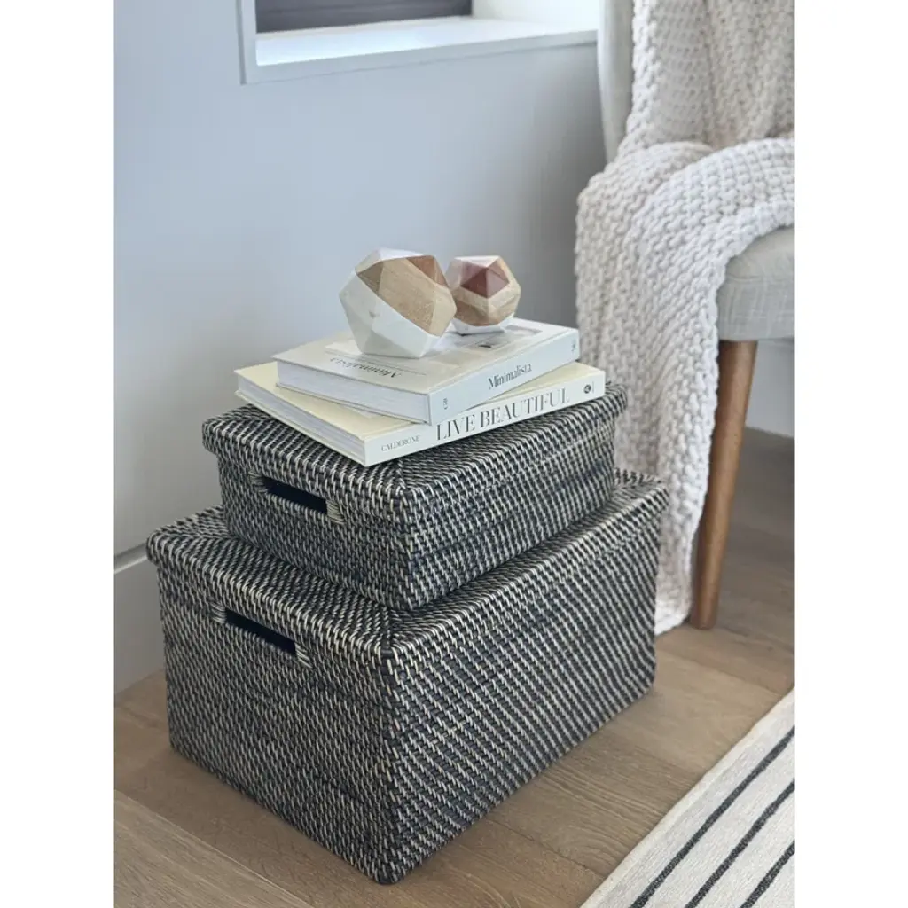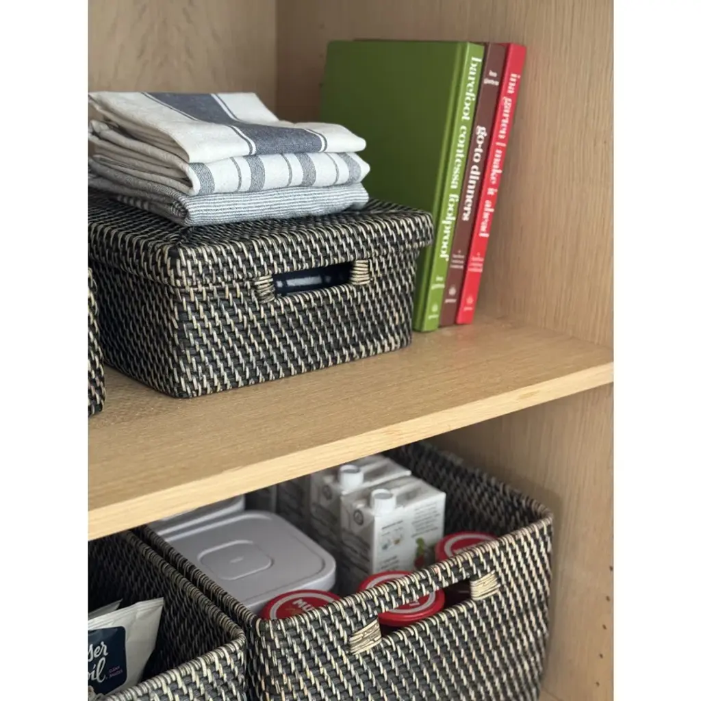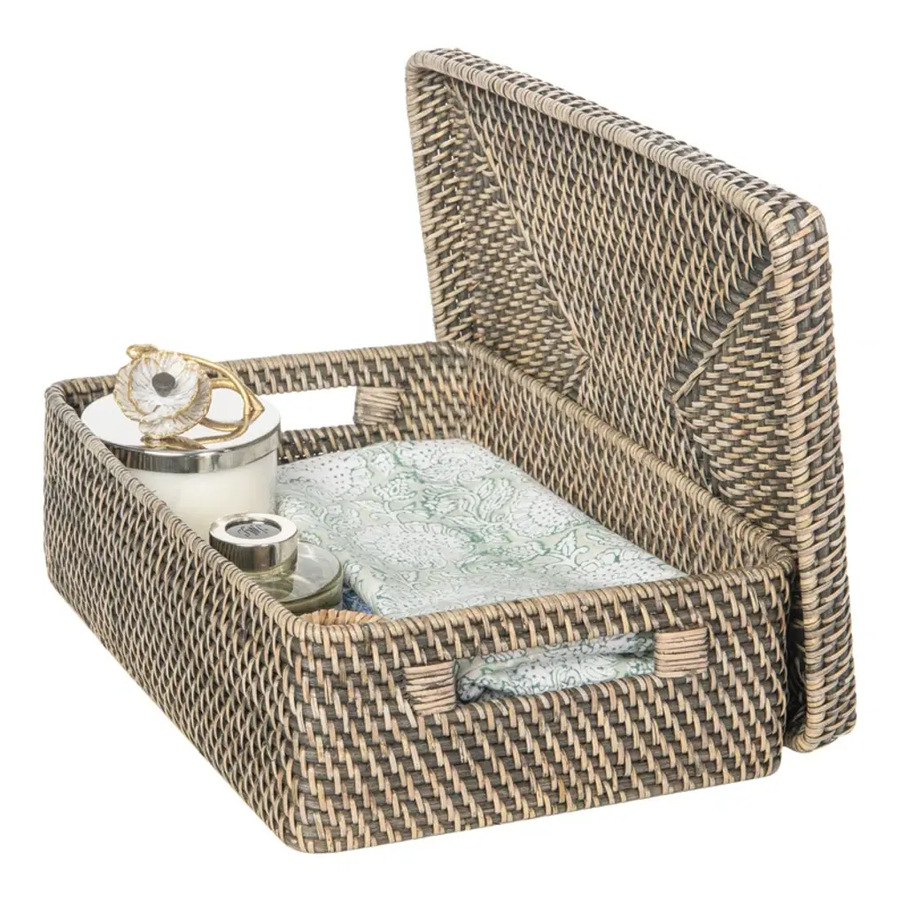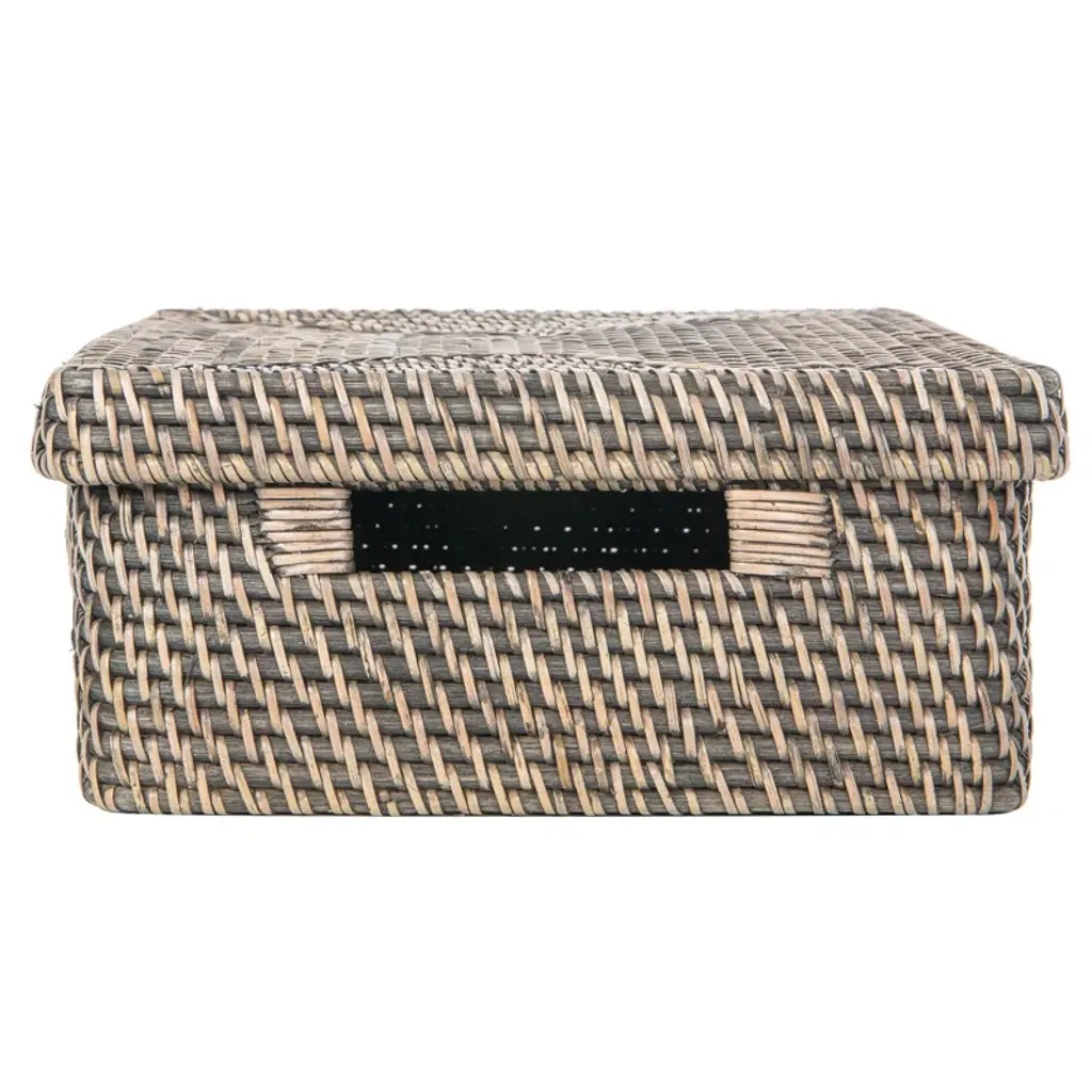 This handwoven storage bin is a great way to organize your space, whether you need to free up your desk or table top. The spacious interior measures 12.5" x 9.25" and is 4" tall – perfect for reducing clutter in your home office or living room. The wicker rattan material comes in a breezy hue of your choice, bringing a down-home feel to any location in your home. Two cutout handles make this basket easy to move from room to room, and a removable lid keeps items out of sight.