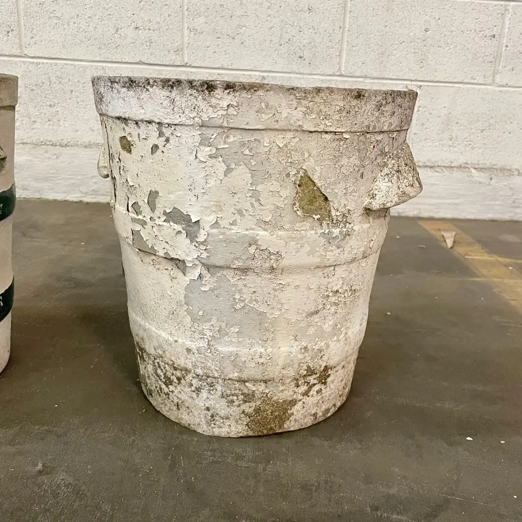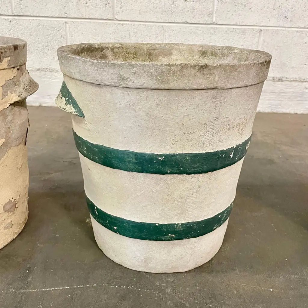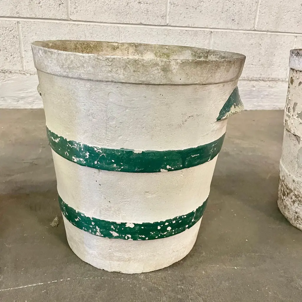 Unique ridged planters by Willy Guhl in the shape of a trash bin. Indented handles on both sides. Different coloring and patina for each of the three planters available as shown. Fun sculptural pieces. Three available. Priced individually.