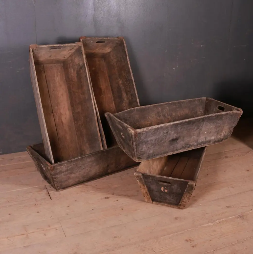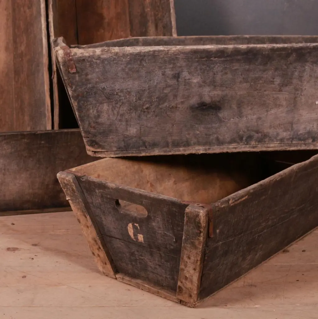 19th C wooden French grape bins. Great decoration for shops and homes alike. 1890.Dimensions39 inches (99 cms) wide17.5 inches (44 cms) deep11 inches (28 cms) high.