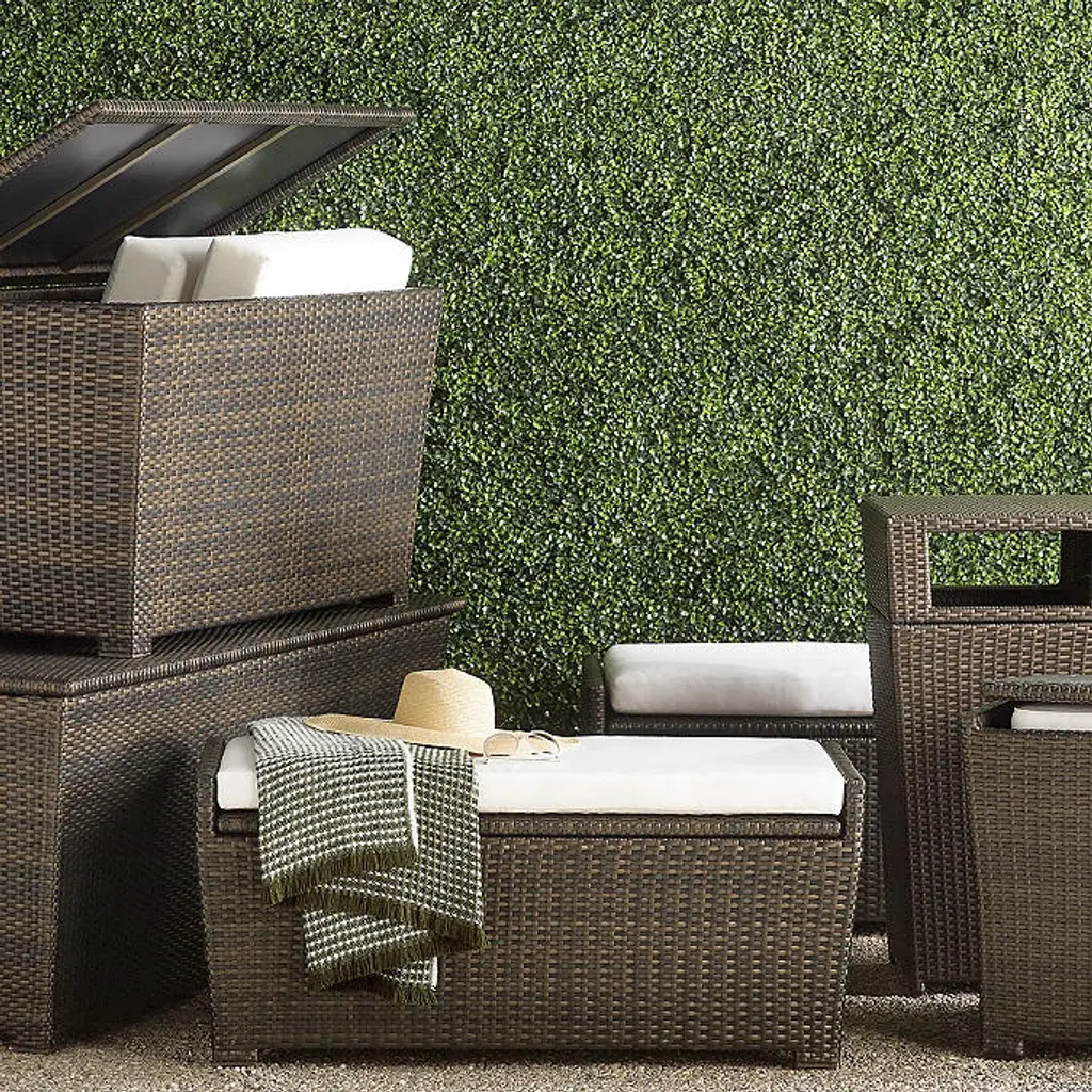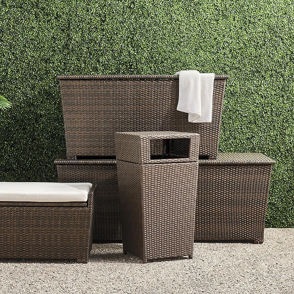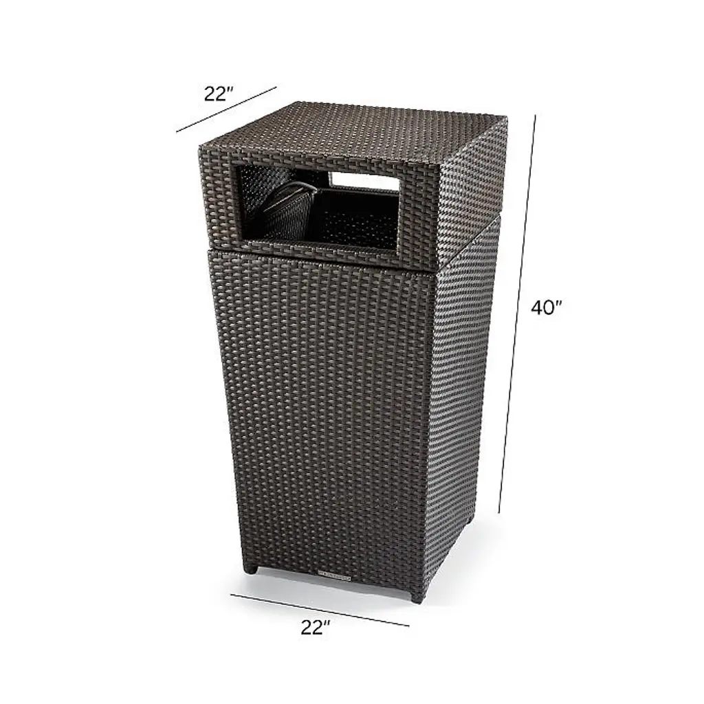 Handsome, all-weather Woven Waste Bin is the perfect disguise for the oft-unsightly waste can. The tightly woven bronze fibers are an ideal complement to your outdoor wicker furniture. Highly durable resin weave Resists fading and splintering Sturdy powdercoated aluminum frame Lift-off lid Removable 24-gallon mesh insert Nonskid base At Frontgate, our primary focus is quality. We guarantee that every product we sell will stand up to the supreme test – our customers' satisfaction. To learn more about our policies, visit our Shipping & Processing, Returns & Exchanges and Warranty & Price Guarantee pages.