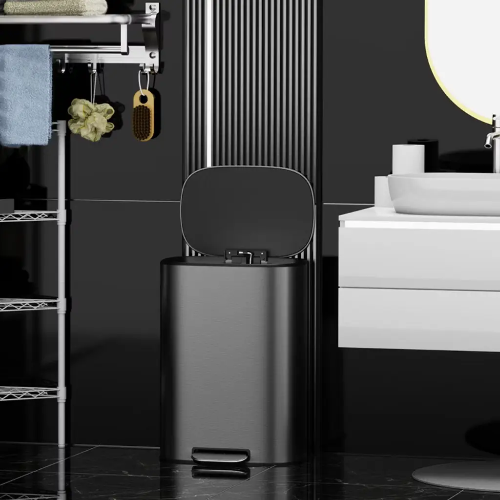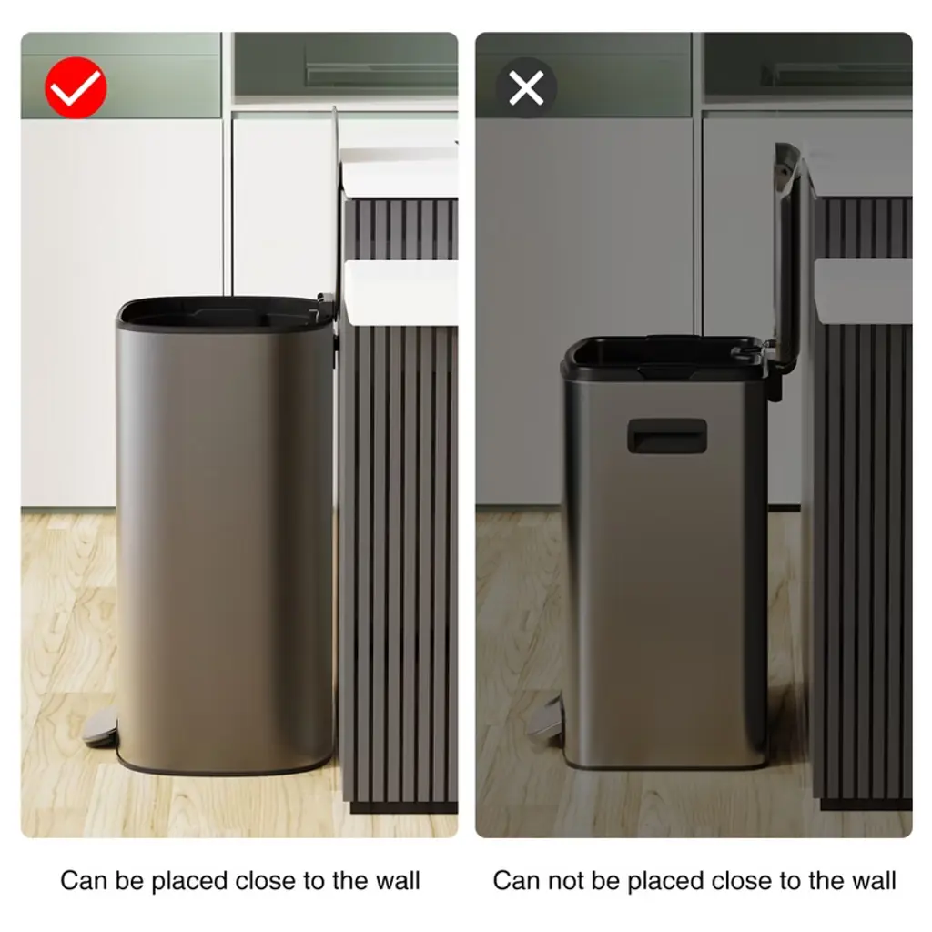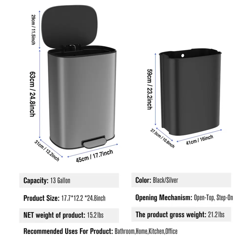 The huge capacity definitely meets your daily use, this can fits most brands of 13 gallon trash bags. It can be a good helper for your kitchen and make your room clean and tidy. The sophisticated rectangular appearance also makes it suitable for a variety of occasions. It makes a shining impression from the outside.