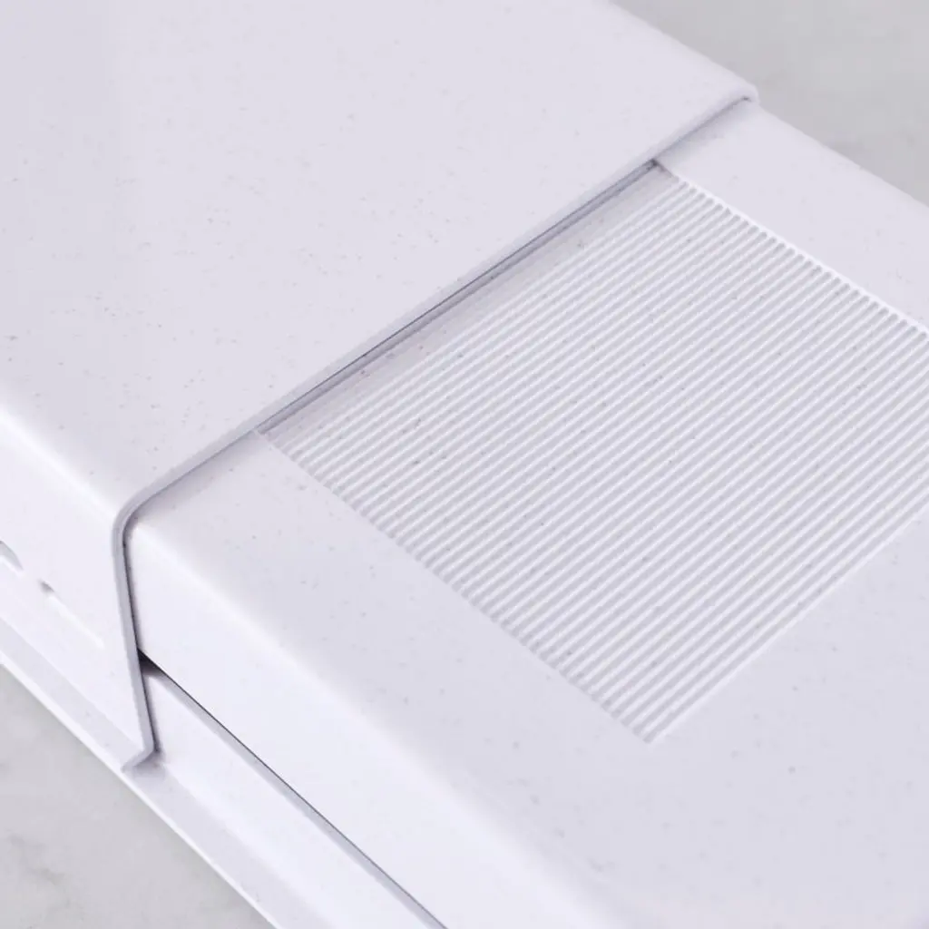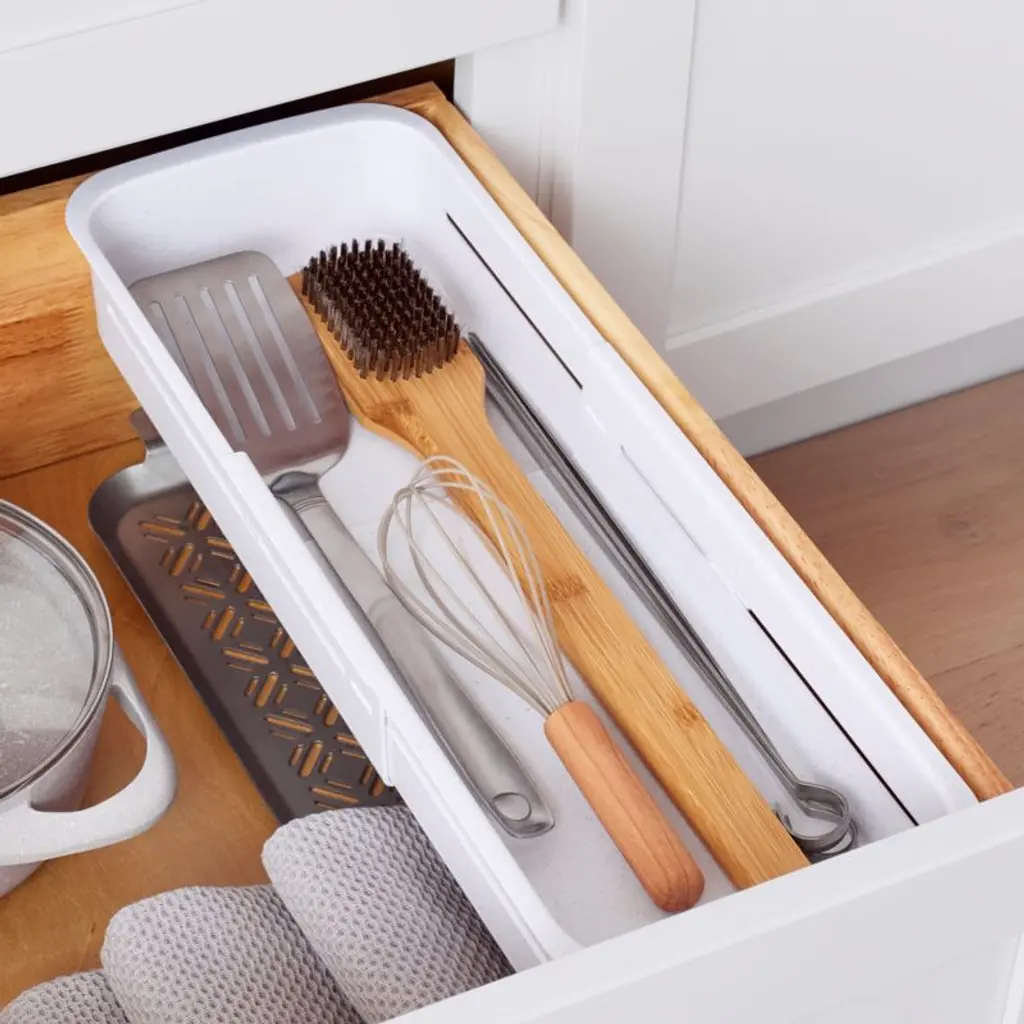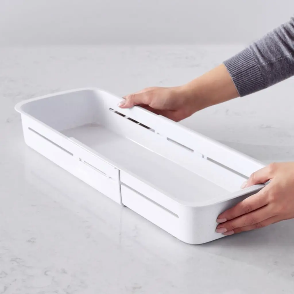 This ingenious organizer makes the most of your available storage space, neatly holding utensils, hand towels and other essentials so they're easy to grab and go. The bright white bin expands to fit your drawer horizontally or vertically, with locking teeth keeping it at your set length. Store the tray directly in your drawer, or place on the drawer frame to allow for an extra layer of storage below.