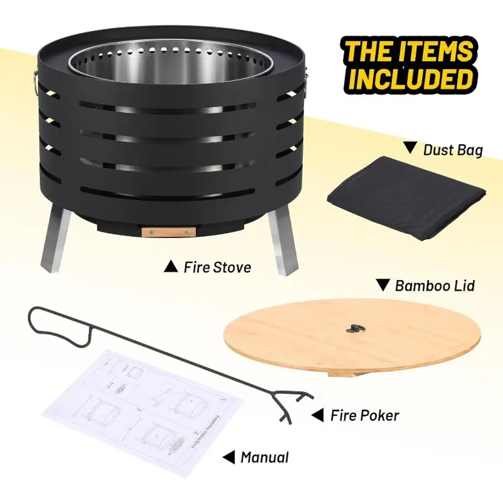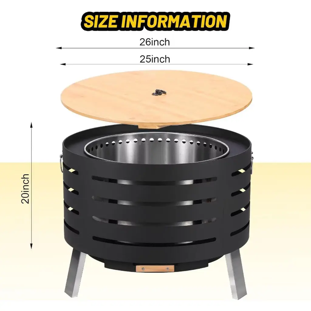 26 Inch Smokeless Fire Pit & Wood Burning Fire Pit with Ash Pan, Adjustable Feet & Poker for Outdoor, BBQ, CampingProduct Description:Experience the ultimate outdoor gathering with the TROPOW 26-Inch Smokeless Fire Pit. Engineered with a efficient dual-airflow design, this fire pit minimizes smoke while maximizing heat output, creating a warm and inviting atmosphere for family and friends. Crafted from premium 304 stainless steel with a durable powder-coated finish, it offers exceptional resistance to rust, high temperatures, and weathering. The included ash tray base simplifies cleanup, while adjustable and foldable feet ensure stability on any terrain and protect surfaces from heat damage. With no assembly required and a convenient waterproof storage bag, this fire pit is ready for immediate use in your backyard, at campsites, or during beach bonfires.Specifications: Material: 304 Stainless Steel Finish: Powder Coated Color: Black Shape: Round Style: Minimalist Product Dimensions: 29.21"D x 29.33"W x 19.49"H Item Weight: 37 lbs Fuel Type: Wood Key Features: Smokeless design with bottom ventilation holes for efficient combustion and reduced smoke Removable ash tray base for easy cleanup and maintenance Adjustable and foldable feet (5.5¡å height) for stability and heat protection on any surface Includes fire poker for safe wood adjustment and a waterproof storage tote bag Durable 304 stainless steel construction with weather-resistant powder coating Accommodates 4-6 people, ideal for patios, gardens, camping, and beach outings No assembly required; ready to use immediately
