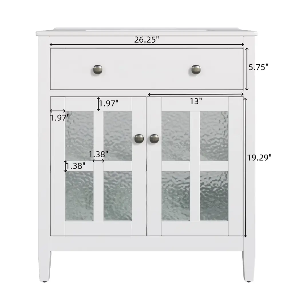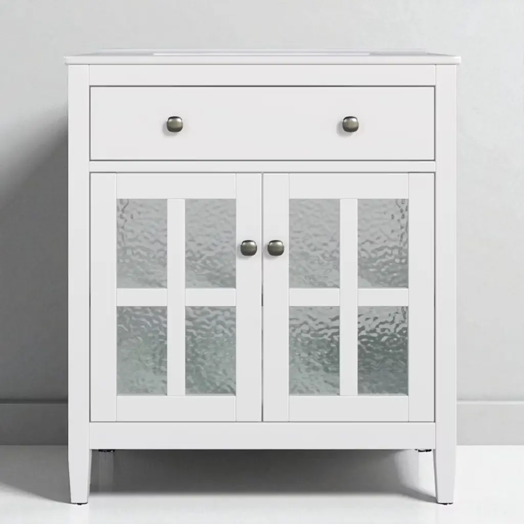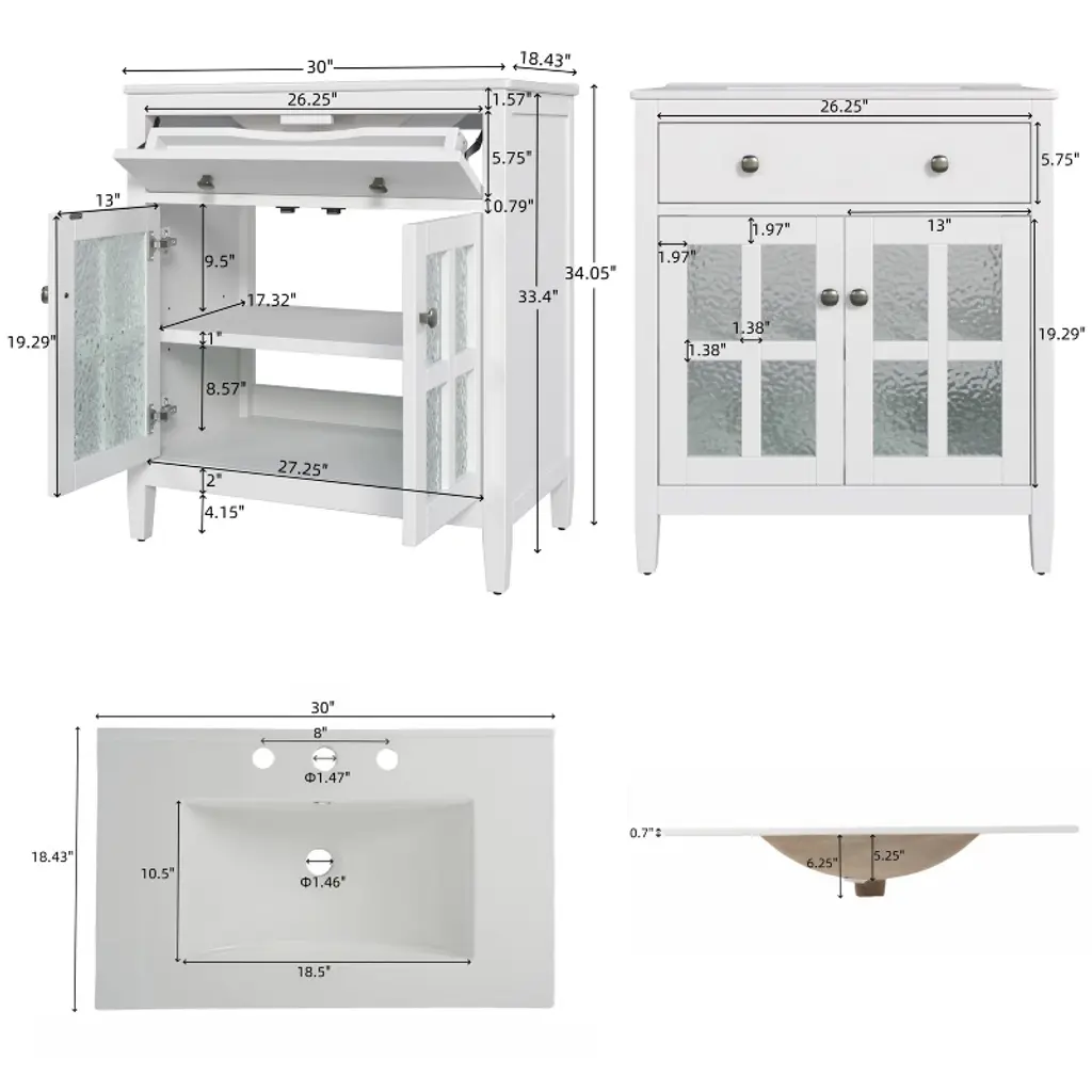 Product Overview:This 30"" bathroom vanity offers a perfect blend of compact design and practical functionality, ideal for small to medium-sized bathrooms. Featuring a sleek white finish, soft-close doors, and a durable ceramic sink, it brings both elegance and convenience to your space. With intelligent storage solutions like an adjustable shelf and tip-out tray, paired with solid wood tapered legs for stability, this freestanding vanity delivers long-lasting quality and timeless appeal.Product Features:Compact & Space-Saving 30-Inch Design: Perfectly sized for efficient use in smaller bathrooms, this vanity maximizes utility without taking up excess space, offering generous storage and countertop functionality.Sturdy Solid Wood Tapered Legs: Designed for strength and style, the tapered legs elevate the vanity, protecting it from floor moisture while enhancing stability and adding a light, modern aesthetic.Convenient Tip-Out Tray: A hidden tip-out tray offers quick access to essentials like razors, sponges, or brushes, keeping your counter clutter-free while optimizing under-sink space.Durable Waterproof Painted Finish: The cabinet's moisture-resistant painted finish safeguards against humidity, splashes, and daily wear. Its smooth, non-porous surface is easy to clean and helps prevent mold or warping.Premium Hardware: Includes sleek silver metal knobs for a modern look and soft-close hinges that ensure gentle, quiet door operation. The knobs offer a comfortable grip and lasting durability, even in humid environments.High-Quality Ceramic Sink: Glossy white ceramic sink with 5.25"" depth, anti-spill overflow hole, and pre-drilled 8"" faucet holes (faucet not included) delivers durability, easy maintenance, and modern elegance.Adjustable Interior Shelf: Customize storage by adjusting the shelf height to fit larger toiletries, cleaners, or bulk supplies, maximizing flexibility within the cabinet.Specifications:Overall Dimensions: 30"" L x 18.43"" W x 34.05"" HSink Dimensions: 18.5"" L x 10.5"" W x 5.25"" DDrawer Interior: 23.75"" W x 3"" D x 3"" HCabinet Interior: 27.75"" W x 17.32"" D x 19.07"" HBase Dimensions: 29.4"" W x 18.12"" D x 33.4"" HWeight: 83.77 lbsMounting Type: FreestandingAssembly: Required; includes hardware and instruction manualSuitable Scenarios:Ideal for powder rooms, guest bathrooms, or smaller master baths where space is limited but storage and design cannot be compromised. The timeless white finish and transitional design work with modern, coastal, traditional, or farmhouse décor themes.Notes:Faucet not included.Ships in one box. Self-assembly required.