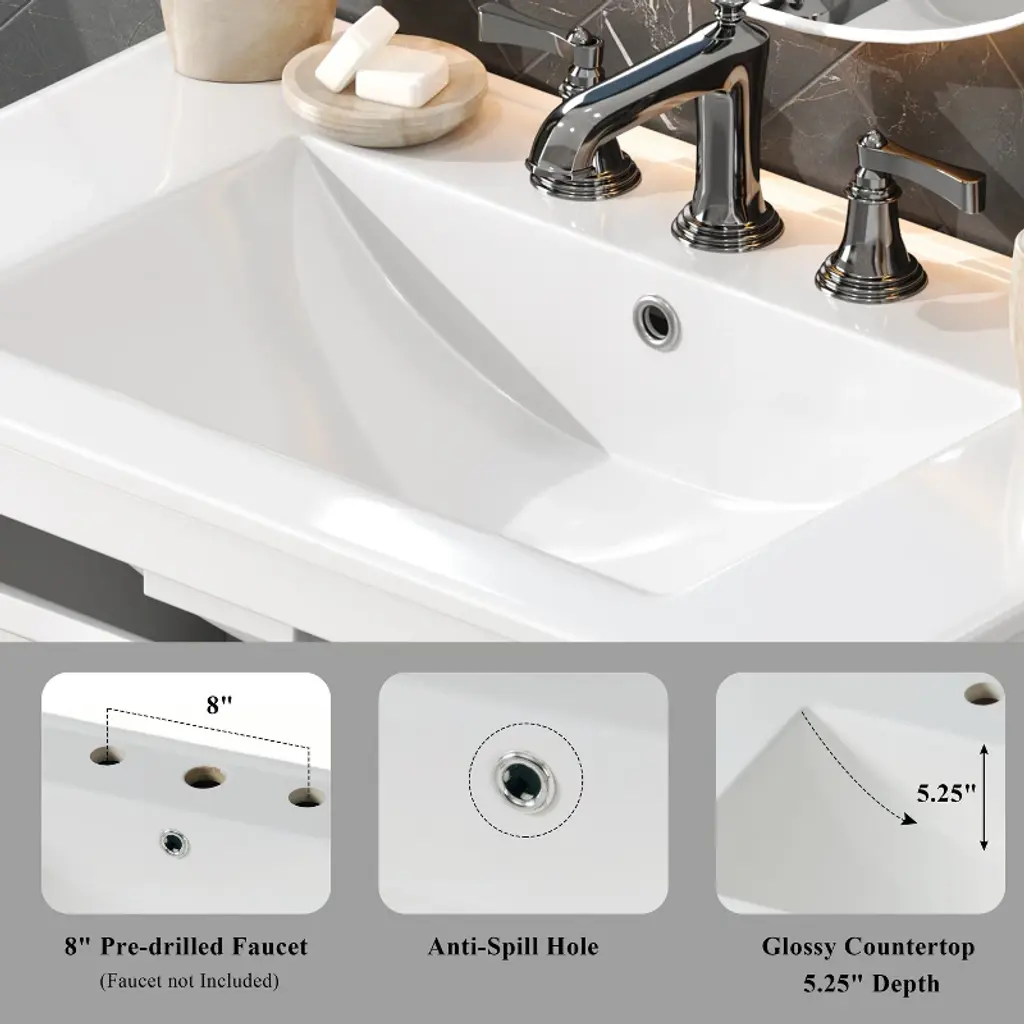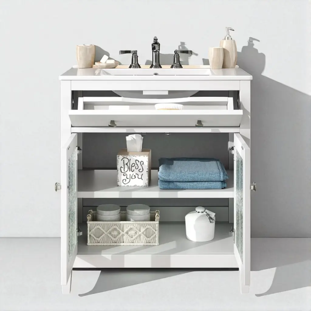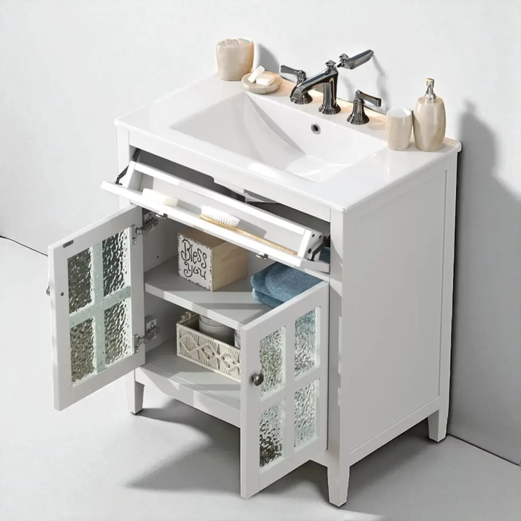 Product Overview:This 30"" bathroom vanity offers a perfect blend of compact design and practical functionality, ideal for small to medium-sized bathrooms. Featuring a sleek white finish, soft-close doors, and a durable ceramic sink, it brings both elegance and convenience to your space. With intelligent storage solutions like an adjustable shelf and tip-out tray, paired with solid wood tapered legs for stability, this freestanding vanity delivers long-lasting quality and timeless appeal.Product Features:Compact & Space-Saving 30-Inch Design: Perfectly sized for efficient use in smaller bathrooms, this vanity maximizes utility without taking up excess space, offering generous storage and countertop functionality.Sturdy Solid Wood Tapered Legs: Designed for strength and style, the tapered legs elevate the vanity, protecting it from floor moisture while enhancing stability and adding a light, modern aesthetic.Convenient Tip-Out Tray: A hidden tip-out tray offers quick access to essentials like razors, sponges, or brushes, keeping your counter clutter-free while optimizing under-sink space.Durable Waterproof Painted Finish: The cabinet's moisture-resistant painted finish safeguards against humidity, splashes, and daily wear. Its smooth, non-porous surface is easy to clean and helps prevent mold or warping.Premium Hardware: Includes sleek silver metal knobs for a modern look and soft-close hinges that ensure gentle, quiet door operation. The knobs offer a comfortable grip and lasting durability, even in humid environments.High-Quality Ceramic Sink: Glossy white ceramic sink with 5.25"" depth, anti-spill overflow hole, and pre-drilled 8"" faucet holes (faucet not included) delivers durability, easy maintenance, and modern elegance.Adjustable Interior Shelf: Customize storage by adjusting the shelf height to fit larger toiletries, cleaners, or bulk supplies, maximizing flexibility within the cabinet.Specifications:Overall Dimensions: 30"" L x 18.43"" W x 34.05"" HSink Dimensions: 18.5"" L x 10.5"" W x 5.25"" DDrawer Interior: 23.75"" W x 3"" D x 3"" HCabinet Interior: 27.75"" W x 17.32"" D x 19.07"" HBase Dimensions: 29.4"" W x 18.12"" D x 33.4"" HWeight: 83.77 lbsMounting Type: FreestandingAssembly: Required; includes hardware and instruction manualSuitable Scenarios:Ideal for powder rooms, guest bathrooms, or smaller master baths where space is limited but storage and design cannot be compromised. The timeless white finish and transitional design work with modern, coastal, traditional, or farmhouse décor themes.Notes:Faucet not included.Ships in one box. Self-assembly required.