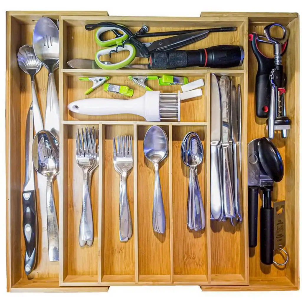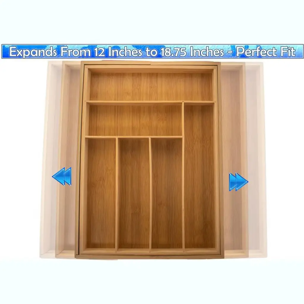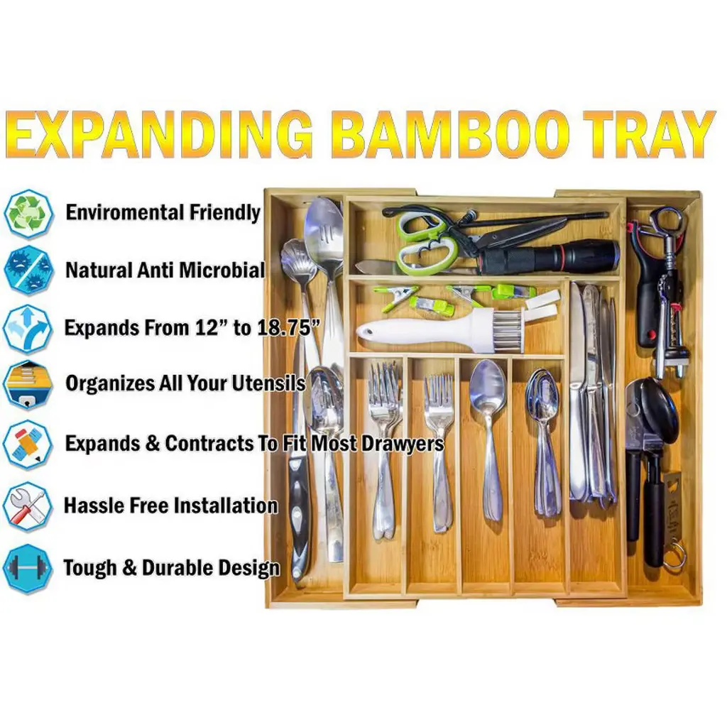 Expands From 12" to 18.75" For The Prefect FitThis expanding bamboo tray makes sure you have the perfect fit for almost any drawer in your home. Whether you use it in the kitchen for forks, spoons, knives, and gadgets organization or in the bathroom as a cosmetics divider. This 6 to 8 compartment expanding cutlery tray is a complete, versatile organizer which will save you immense amount of space while giving your kitchen, room, workshop and many other areas a wonderfully neat and clean look. Not only this, but this cutlery tray can also be used in the utility room as a hardware tray for you to grab your required tool and start working effectively and easily. In addition, the surface of this cutlery tray and the material that has been used to smoothen the surface is crack and break resistant which makes it ideal for everyone.Environmentally Friendly, Antimicrobial, & Rot ResistantSimple to use, Bamboo is 100% natural, and a fantastic contrasting option to wood as Bamboo is significantly more grounded, harder and denser than wood. Also, Bamboo opposes scratching and is lightweight, making it simple to move and store. Bamboo's extraordinary mix of quality, sturdiness, and simplicity of-care makes these cutlery trays the ideal expansion to any area which requires the organization of daily used tools. Along these lines, it is also FDA and FSC approved which ensures that this material is highly durable and will last for ages.