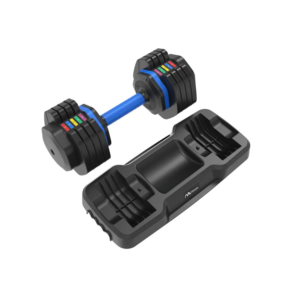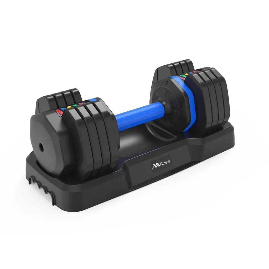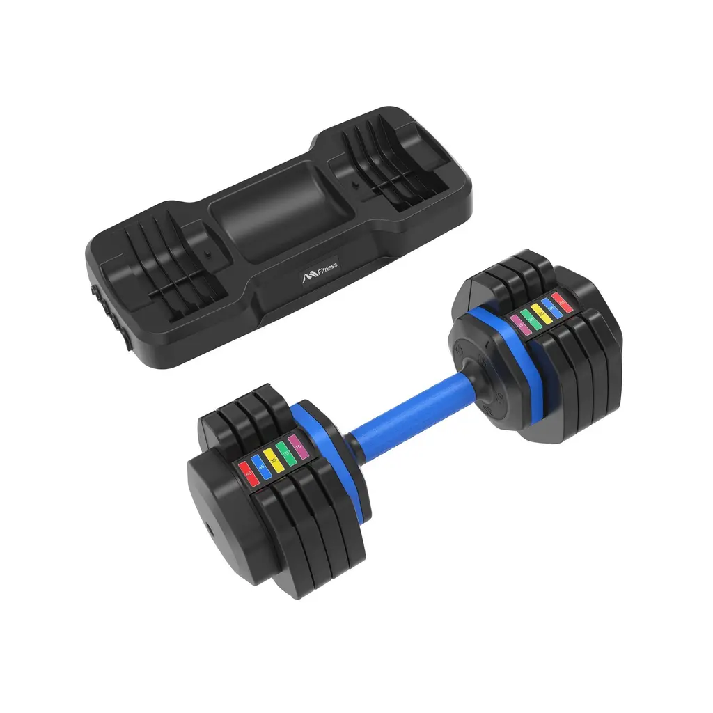 Specifications:Product Description:This adjustable dumbbell offers a versatile and space-saving solution for home gym workouts, with a total weight of 55 lbs and 10 lbs adjustable increments at each level. The intuitive design allows users to easily place the dumbbell on the included tray, where the safety lock automatically disengages. With a simple rotation of the non-slip handle, you can seamlessly switch between five weight settings: 15, 25, 35, 45, and 55 lbs. Unlike other models requiring multiple steps for adjustment, this dumbbell features a true one-key adjustment system, ensuring convenience and efficiency.To add an extra layer of personalization, the dumbbell comes with unique color weight markings, making it easy to recognize your preferred settings. Ideal for family use, each person can identify their weight preference with corresponding color labels, enhancing the fun of group exercise.Crafted from high-quality materials, including a durable metal core, this adjustable dumbbell ensures long-lasting performance. Its polished, visually optimized design adds to its aesthetic appeal, encouraging consistent use to improve your fitness level. Additional thoughtful features include non-slip handles, a portable tray base, and a one-button adjustment with a safety lock for a secure and enjoyable workout experience.