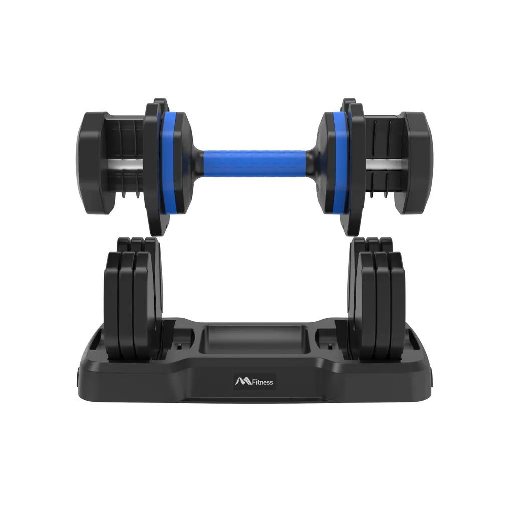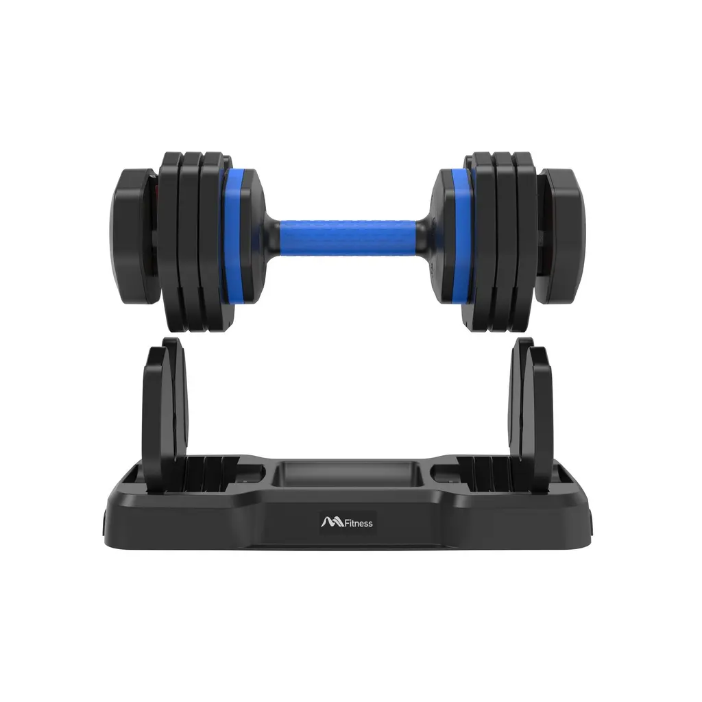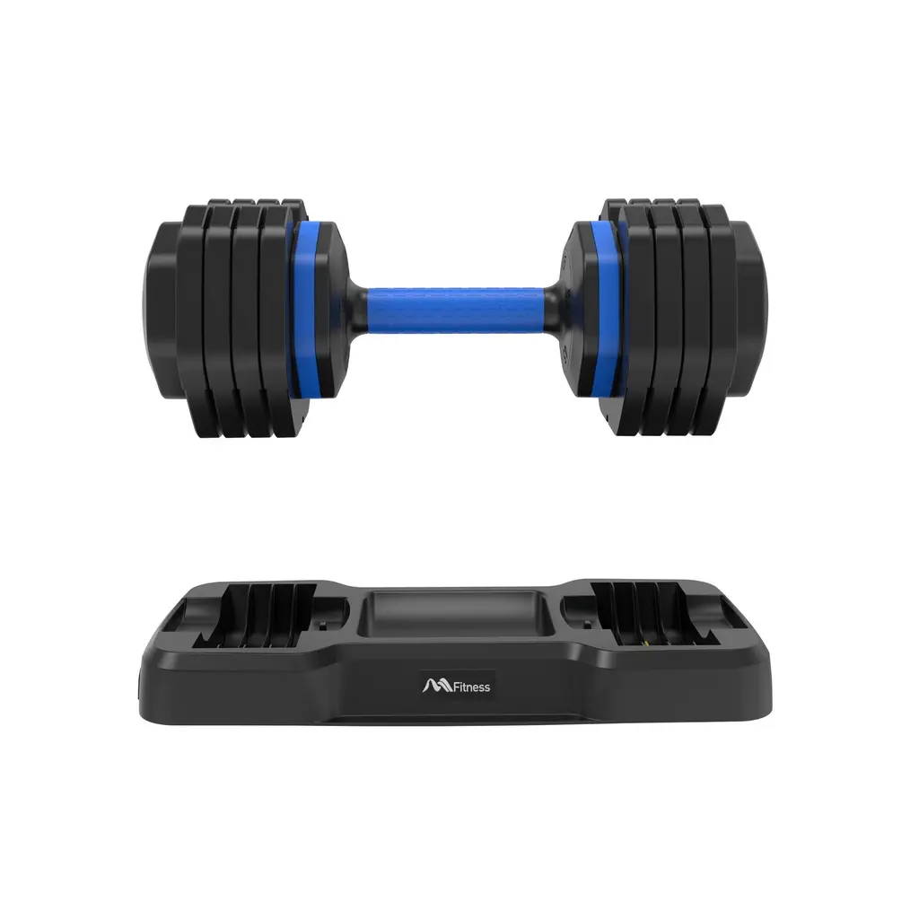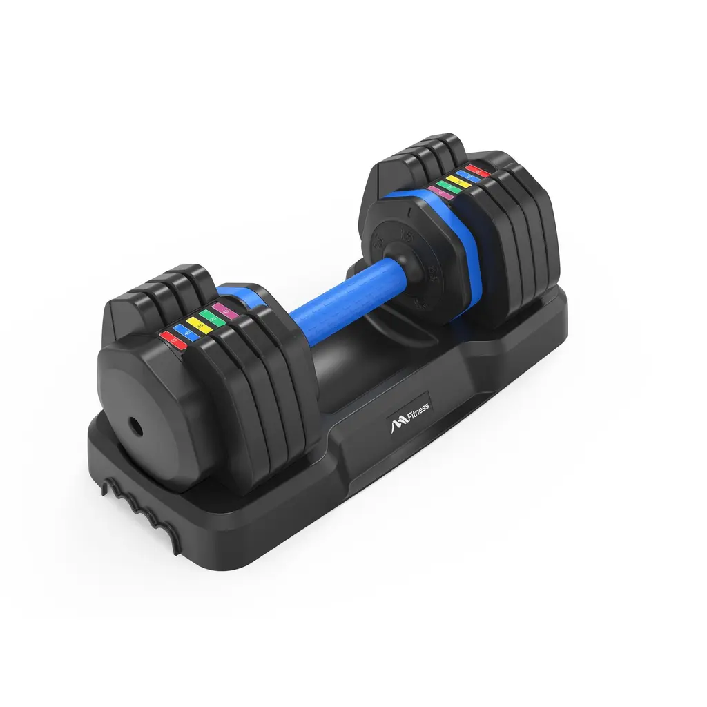 Specifications:Product Description:This adjustable dumbbell offers a versatile and space-saving solution for home gym workouts, with a total weight of 55 lbs and 10 lbs adjustable increments at each level. The intuitive design allows users to easily place the dumbbell on the included tray, where the safety lock automatically disengages. With a simple rotation of the non-slip handle, you can seamlessly switch between five weight settings: 15, 25, 35, 45, and 55 lbs. Unlike other models requiring multiple steps for adjustment, this dumbbell features a true one-key adjustment system, ensuring convenience and efficiency.To add an extra layer of personalization, the dumbbell comes with unique color weight markings, making it easy to recognize your preferred settings. Ideal for family use, each person can identify their weight preference with corresponding color labels, enhancing the fun of group exercise.Crafted from high-quality materials, including a durable metal core, this adjustable dumbbell ensures long-lasting performance. Its polished, visually optimized design adds to its aesthetic appeal, encouraging consistent use to improve your fitness level. Additional thoughtful features include non-slip handles, a portable tray base, and a one-button adjustment with a safety lock for a secure and enjoyable workout experience.