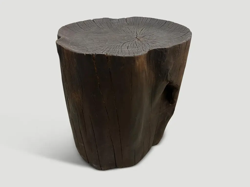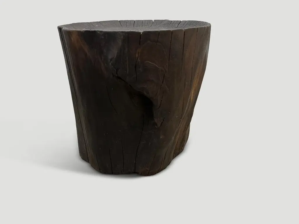 Natural organic formed reclaimed teak root side table. We hand carved the top section into a tray style and lightly charred the aged teak revealing the beautiful wood grain. Both usable and sculptural. We have a collection. All unique. Please inquire. The price and size reflect the one shown.The Triple Burnt Collection represents a unique line of modern furniture made from solid organic wood. Burnt three times to produce a rich, charcoal finish with impressive depth-a result unachievable using standard stains and finishes. A perfect combination of modern and organic.Own an Andrianna Shamaris original.Andrianna Shamaris. The Leader In Modern Organic Design.