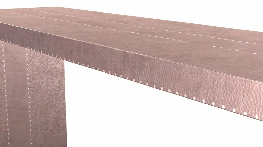 Alison Spear designed this elegant and minimal table for Stephanie Odegard during their trip together to Rajasthan, India. The craftsmen create patterns using different types of hammerings in the metal sheets clad over teak-wood structure.Crafted with utmost care and attention to detail, these Rectangular Console Tables are made to order and are available in twelve metal clad finishes, ensuring that you can choose the perfect one to match your individual style and taste. The use of high-quality materials and expert craftsmanship ensure that each Art Deco Rectangular Console Table is not only beautiful but also a true piece of art.The Straight legs and side arms of this Art Deco Rectangular Console Table are hand carved from solid pieces of teak. Pattern makers trace and cut complex forms that will cover the chair in a skin of copper, white bronze, brass or antiqued white bronze The metal finishes will tarnish over time. Regular non-abrasive household metal polishes can be used to restore the original luster.Overall, if you're looking for a piece of furniture that combines luxury, comfort, and style, then the Art Deco Rectangular Console Table is an excellent choice. With its distinctive curved profile and multiple finish options, this Chair set is sure to elevate the look of any room it is placed in, and be a beloved addition to your home for years to come.The images shown in this listing are shot in different lighting conditions and/or are 3D illustrations. We encourage our customers to please request a sample or a full sample set of 12 finishes so that they can experience the finish first hand. Art Nouveau Tray Console Tables Mid.Hammered in Copper by Alison SpearSize- 72"x 16"x 30"HMaterials - Copper, Metal sheet, Teak, Wood, MetalTechniques: Hand-Crafted, Hand-Carved, Metal Work, Wood Work, Metal Wrapping, PolishedPlease note that moisture in air, sudden change in temperature and natural movement of wood over time causes the metal to wrinkle or bubble up. We use well seasoned, reclaimed teak and high quality marine grade MDF (wherever technically possible) to avoid and delay the mentioned changes. However a perfect stability of metal cannot be guaranteed. Please note that our smooth finish metal clad pieces will have some unavoidable tool marks. This is proof that everything is done by hand. The smooth finish will not come out like a machine made perfect surface and the master artisan will do their best to make it look as good/clean/stable/perfect as he possibly can.The antique white bronze finish is hand done by using an acidic chemical over the white bronze finish to recreate a natural patination. Like with the natural patination of silver, copper, or brass, the final result and color uniformity of the patina cannot be guaranteed. The goal of this finish is to achieve rainbow-like shades with dull, shiny, cloudy, and streaky patches to give an illusion of antiquing. Please note:None of our metal clad pieces are treated with a protective “finish” thus enabling the items to age naturally over time. We will of course polish them well before we pack them. a) Copper oxidizes faster than the other metals. In six to twelve months it will most likely lose its shine and will gradually turn to different shades of brown and/or green/blue. This aging process and its effect is referred to as verdigris. After a year the piece should not change much more. Copper does not rust, but does require periodic cleaning in order to retain its original shine if that the preferred option. ('BRASSO' or any known copper polish can be used to polish copper).b) Brass retains its shine for far longer than others, but will tarnish if not cleaned on occasion. ('BRASSO' is made to polish brass).c) White bronze, has the least tendency to show age or tarnish. If kept in a controlled climate, this metal will hold its shine for years. It can be cleaned with a cleanser and polished with a cloth. d) The antiqued white bronze finish will react with the natural elements the fastest in the beginning but it too will stop reacting and will settle down in a stable state like copper after 6-12 months. Since it is already antiqued and looked like it is tarnished, as described in an earlier message, this fast reaction will not change the over all look. In that way this surface is most forgiving. The images shown in this listing are shot in different lighting conditions and/or are 3D illustrations. We encourage our customers to please request a sample or a full sample set of 12 finishes so that they can experience the finish first hand.