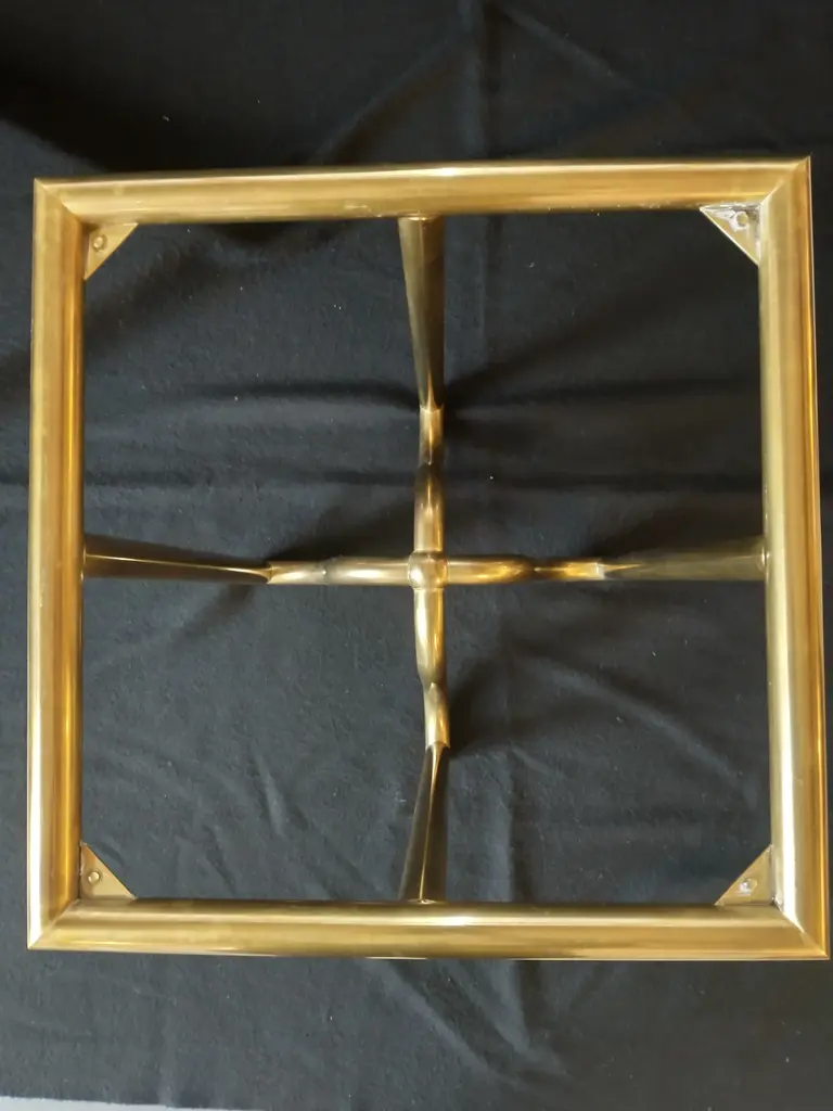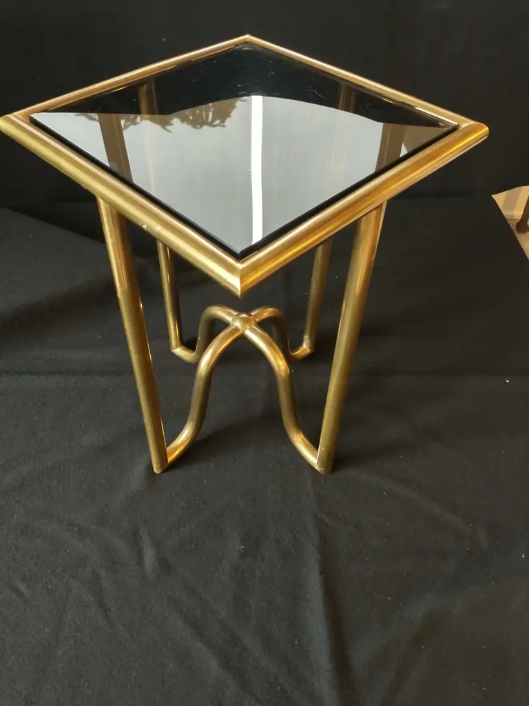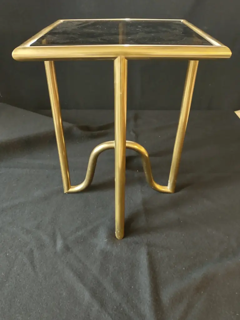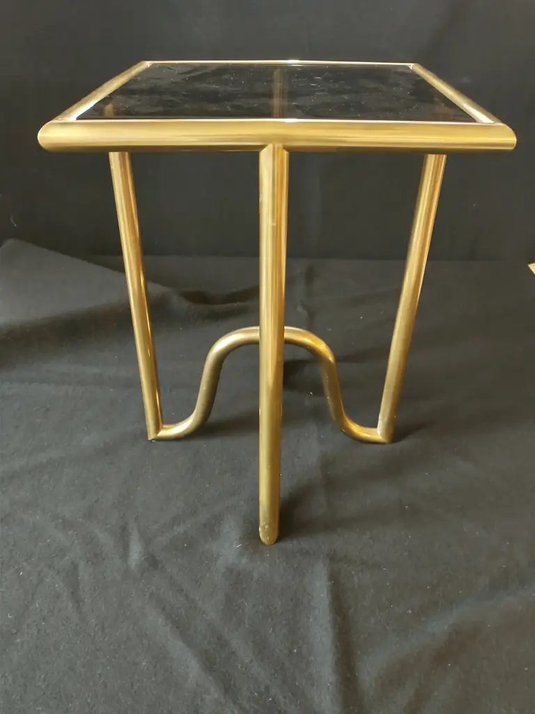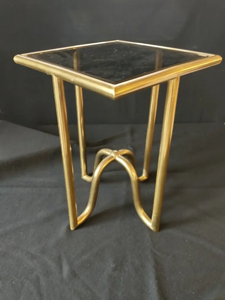 Baker's Lien Tray Table from The Laura Kirar Collection. Features include a formed hollow tubular frame (1" diameter) in a patinaed bronze finish with four (4) legs and a square tubular frame at the top. A smoked glass top (1/4" thick) is set into the tubular frame with hidden rubber cushion bumpers attached to the frame to secure the glass top. The piece is a showroom display piece and is in good condition with a natural patinaed bronze finish on the frame.