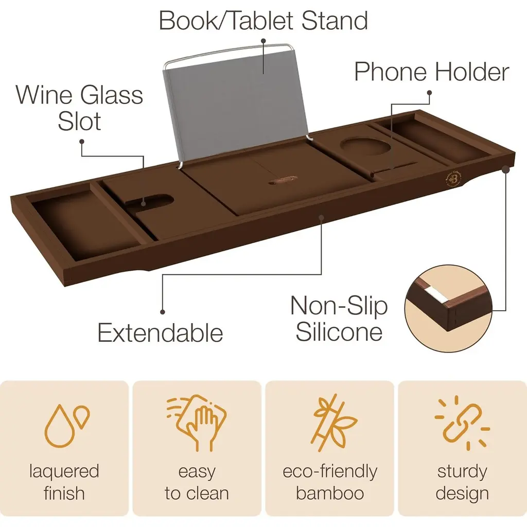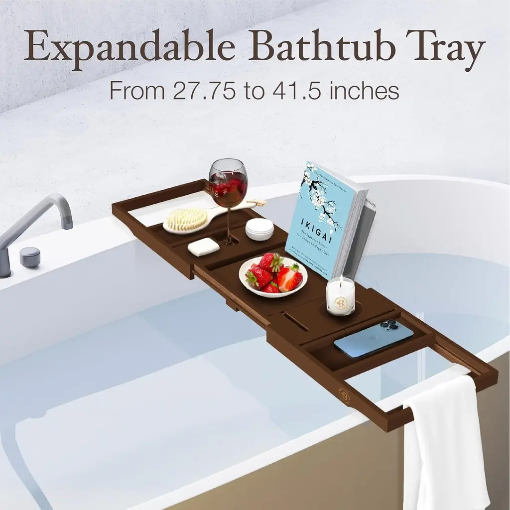 SPA EXPERIENCE AT HOME: Your bathroom transforms into a relaxing retreat with our luxurious bath tray for tub. Lay out scented candles, oils, a favorite book and wash away the stress of the day. Elevate your bathing experience with this bath tub tray table that holds everything you need for a soothing soak. QUALITY BAMBOO CONSTRUCTION: Our tub tray is crafted from Moso bamboo wood and coated with waterproof lacquer. Durable and stylish, the natural elegance of bamboo bath tub tray adds sophistication to your bathroom, blending functionality with aesthetic appeal. PERFECT GIFT IDEA: Elevate the art of gifting with this versatile bamboo bathtub tray, an ideal Mother's Day gift for mom or a thoughtful wedding present. Our bathtub trays for tub are designed to create a luxurious and relaxing bathing experience, it's the perfect choice for anniversaries, housewarmings, birthdays, or even as a special indulgence for yourself. Transform every bath into a spa-like retreat and celebrate the joy of thoughtful gifting. ULTIMATE CONVENIENCE & ELEGANCE: This bath tray for tub is thoughtfully designed compartments for your wine glass, phone, tablet, and luxurious items that are meticulously arranged. Indulge in an elegant and uninterrupted soak with everything you desire right at your fingertips. SUSTAINABLE LUXURY: Experience the natural splendor of responsibly sourced bamboo. This eco-friendly bath tray elevates your bath to a luxurious escape while embracing sustainable practices. Enjoy the harmony of sophistication and earth-conscious living.