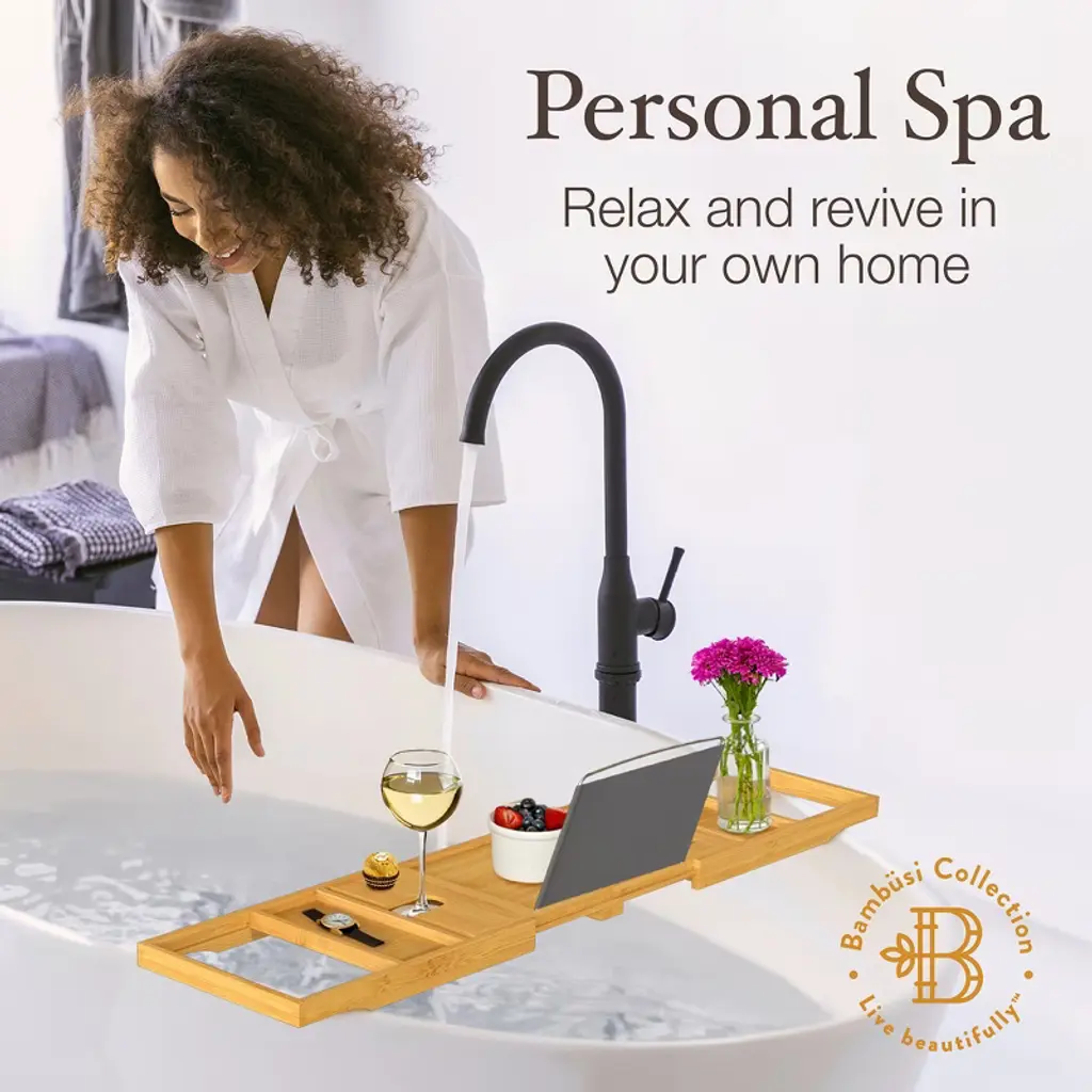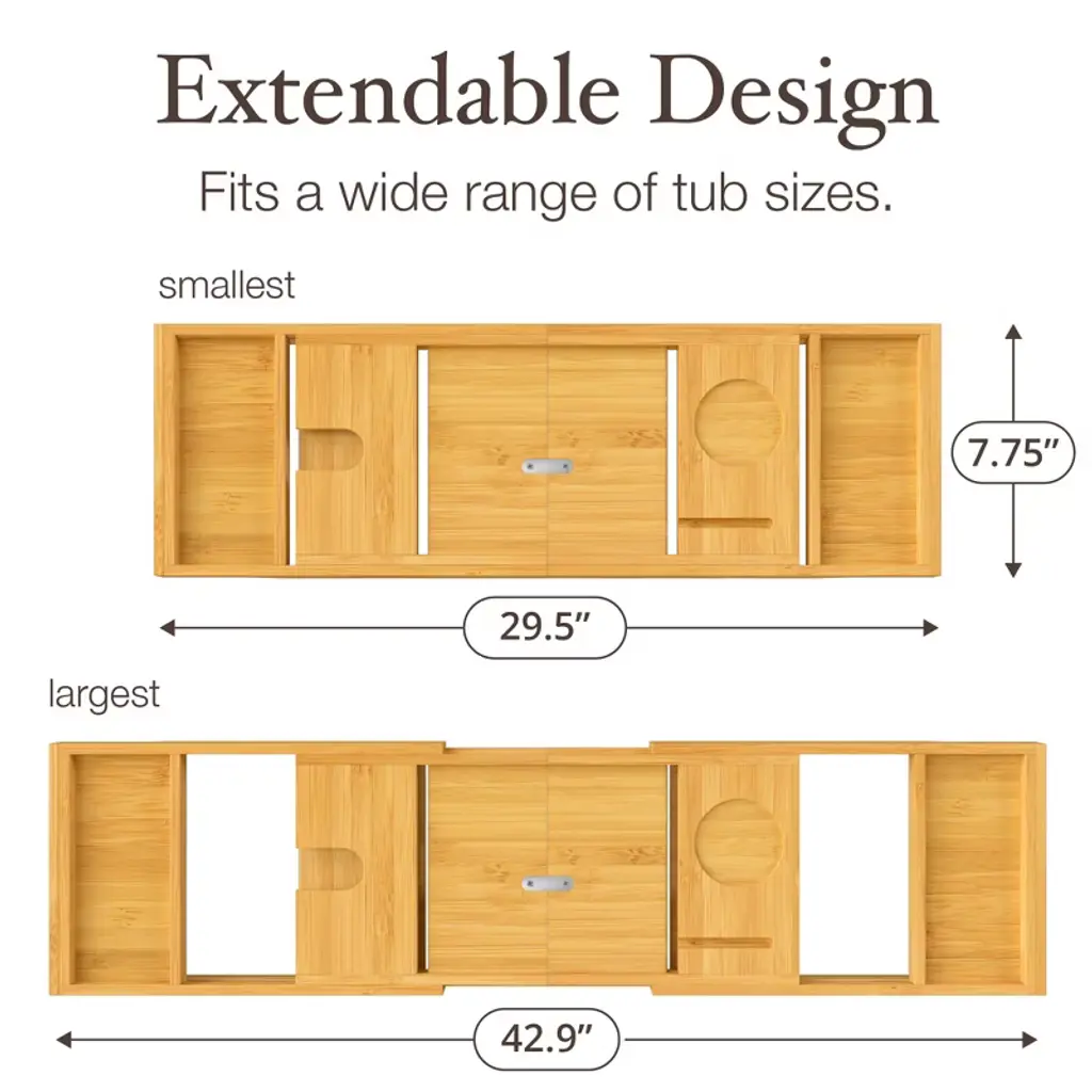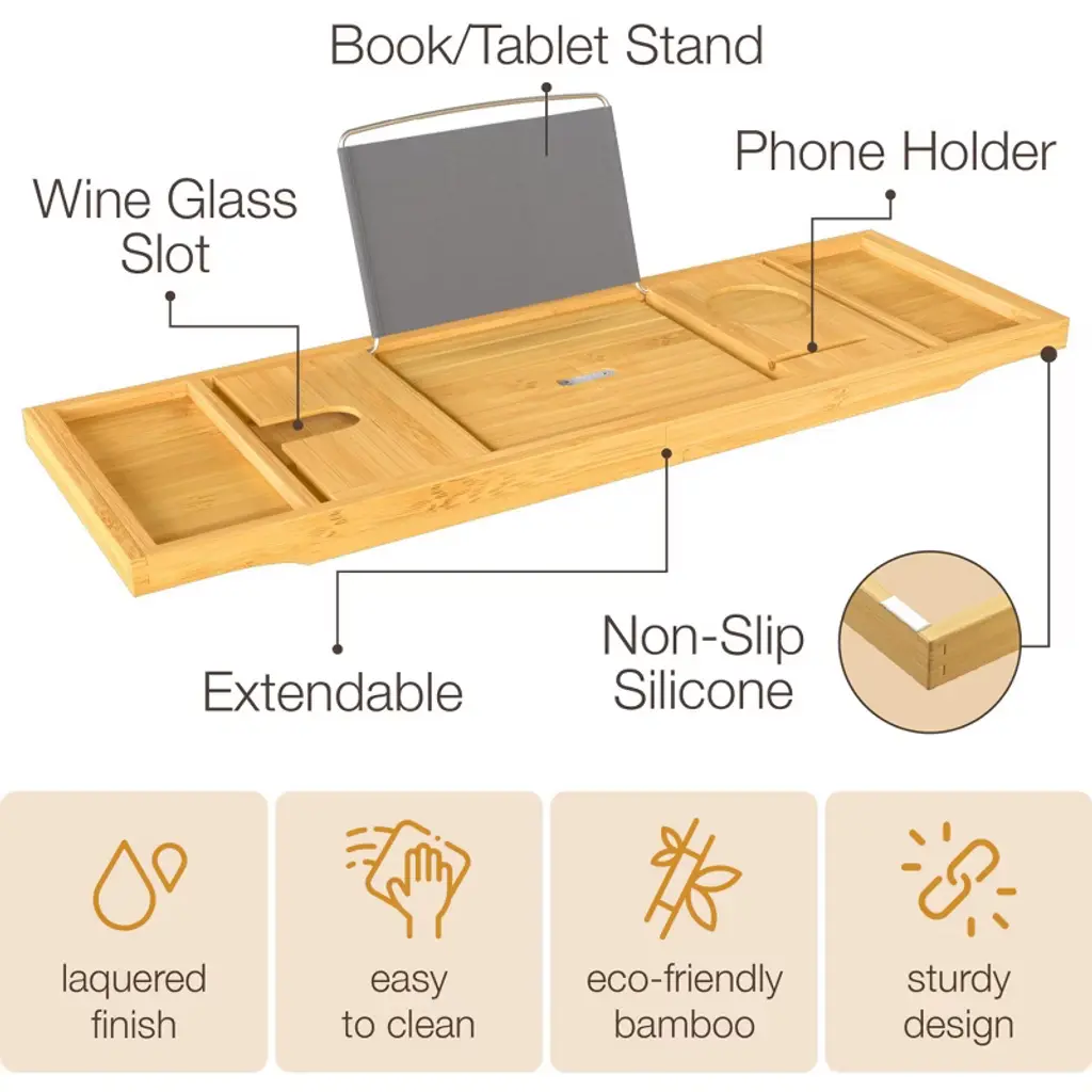 The sleek and modern design of the Premium Expandable Bamboo Bathtub Caddy is the perfect addition to any luxurious bath time; storing and utilizing things, such as cell phones, books, tablets, wine glasses, soaps, candles, and more has never been easier. Non-slip silicone grips are featured on the bottom of the Premium Expandable Bamboo Bathtub caddy. And multiple slots, holders, handles, and trays allow for safer access to the things you use most during your bath while also reducing the risk of items falling into the water. Not only do we craft our bamboo caddy with eco-friendly bamboo, which is stronger and thicker than most traditional wood, we also add a thin protective coat of lacquer to maximize water durability and round the edges for better usability. Key Features: Durable Waterproof Non-Slip Feet Cellphone Tray Wineglass Holder Book or Tablet Holder Expandable up to 41.5 in. 5 Adjustable Levels for the Tablet and Book Holder